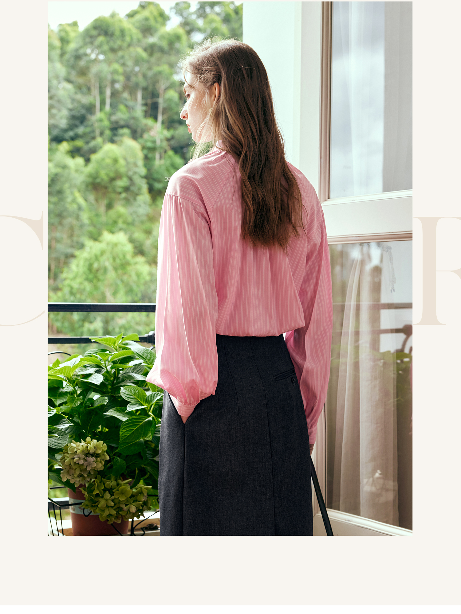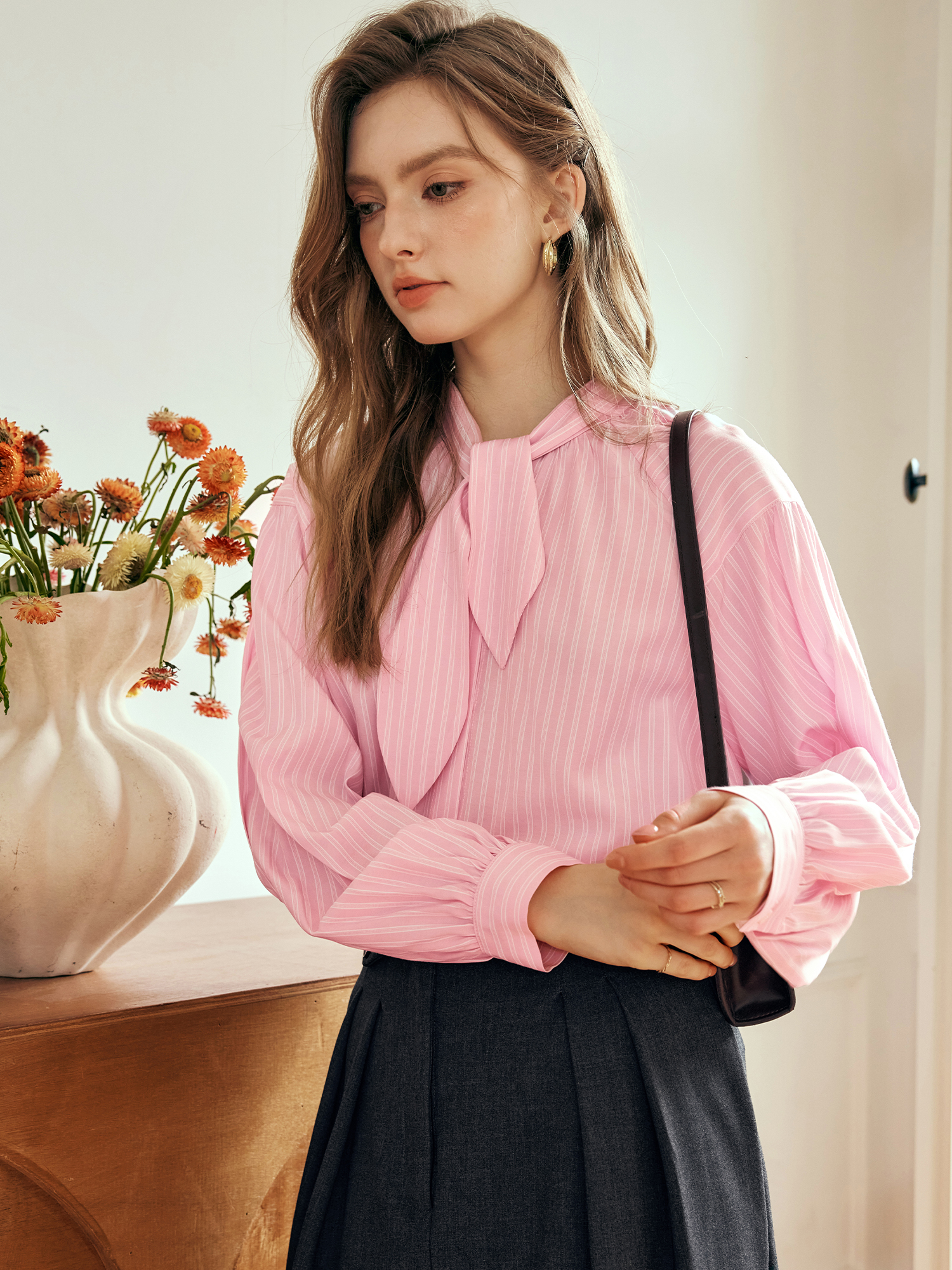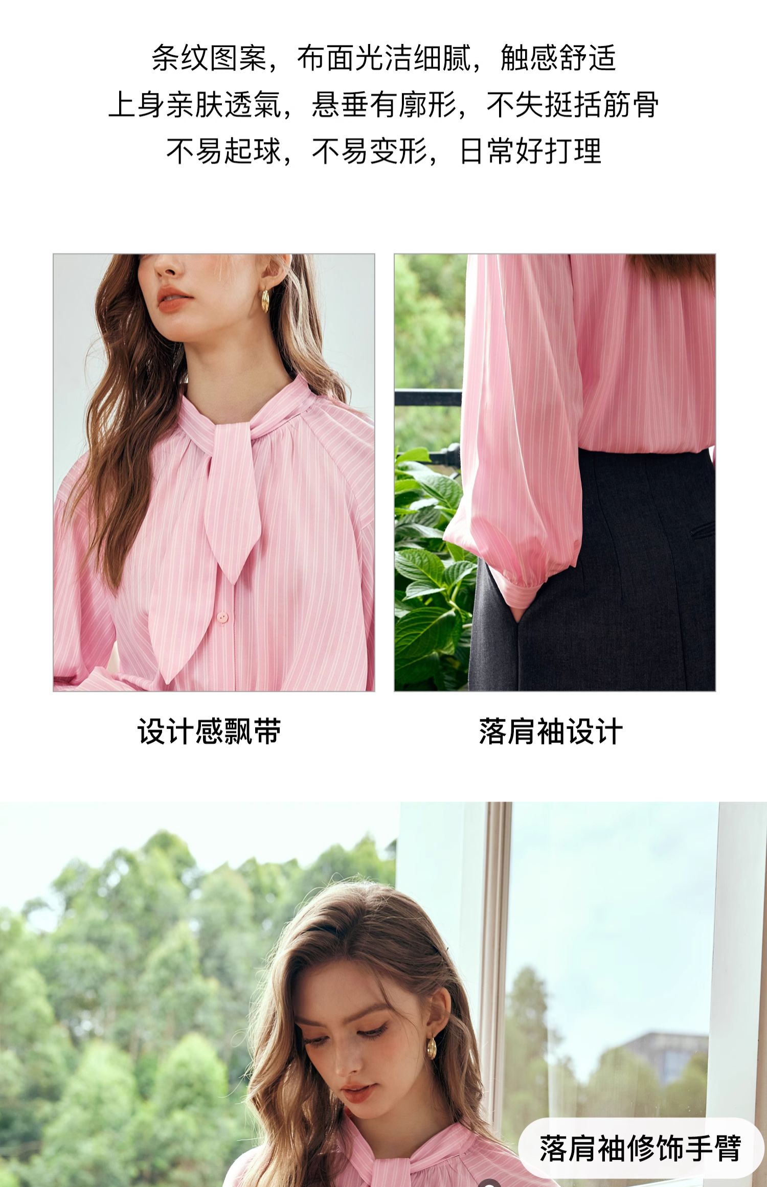 OLrain欧芮儿樱花粉长袖衬衫女秋季2024年新款设计感飘带条纹衬衣