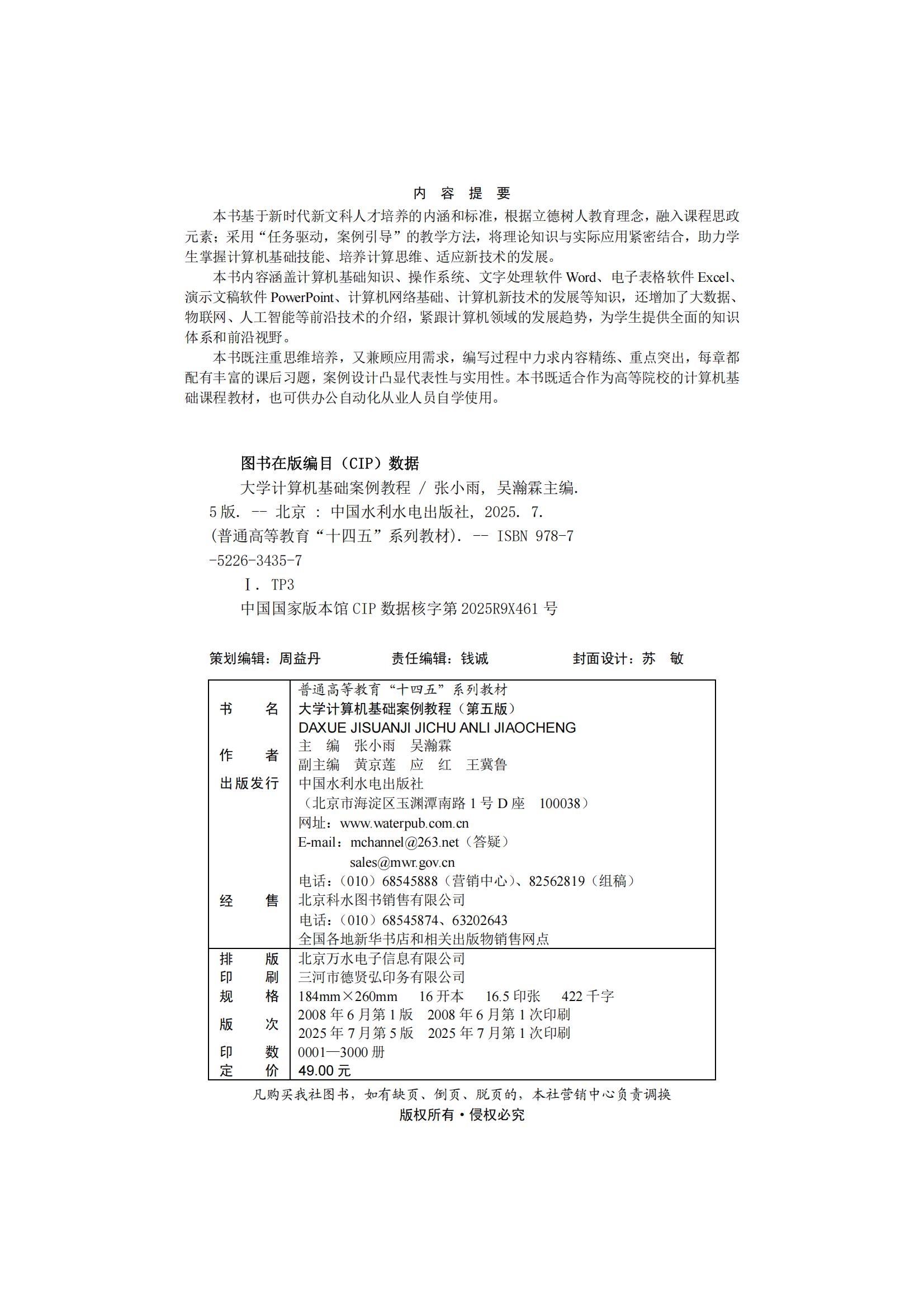 本书基于新时代新文科人才培养的内涵和标准,根据立德树人教育理念,融入课程思政元素;采用“任务驱动,案例引导”的教学方法,将理论知识与实际应用紧密结合,助力学生掌握计算机基础技能、培养计算思维、适应新技术的发展。