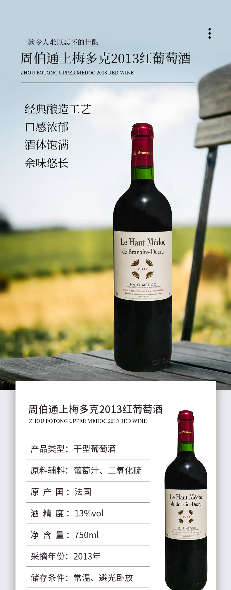 【1855列级名庄⁴】法国进口周伯通上梅多克2013红葡萄酒 750ml