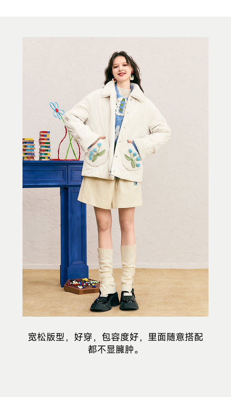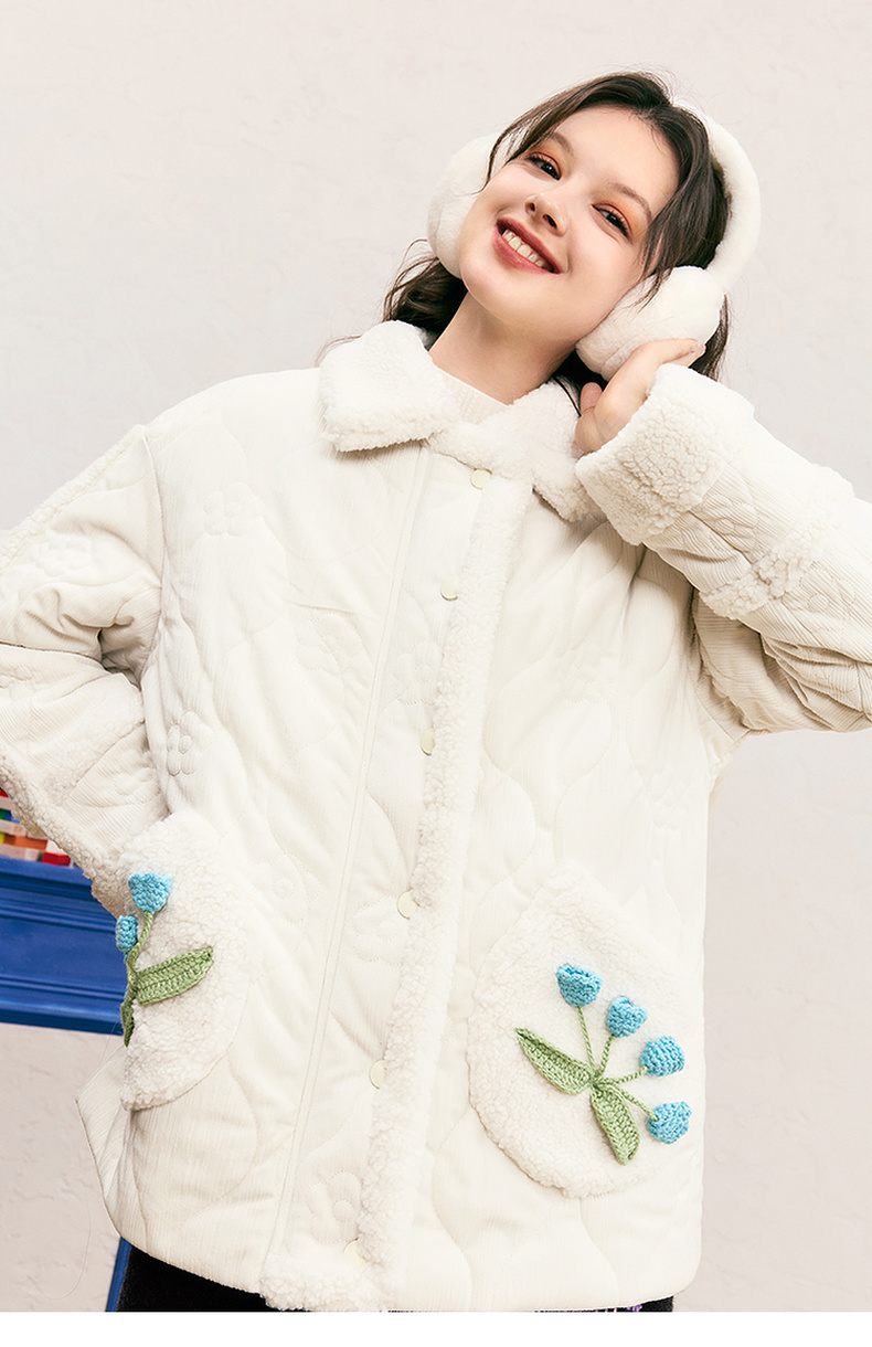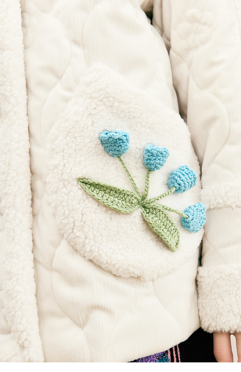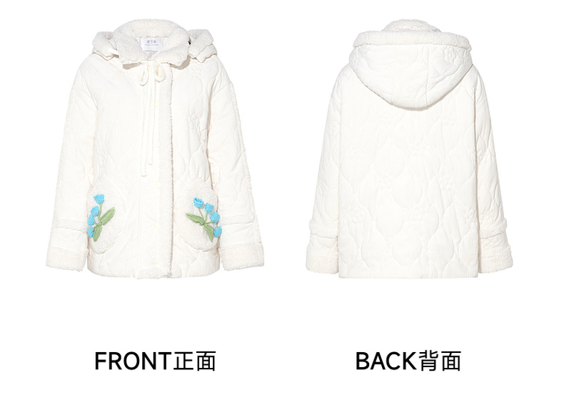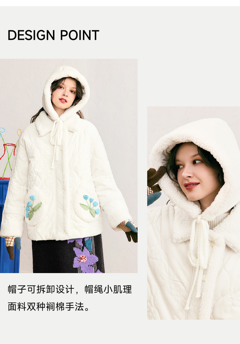 两三事纯真花魅2024冬季新款立体花朵毛绒口袋可拆帽子棉衣外套女