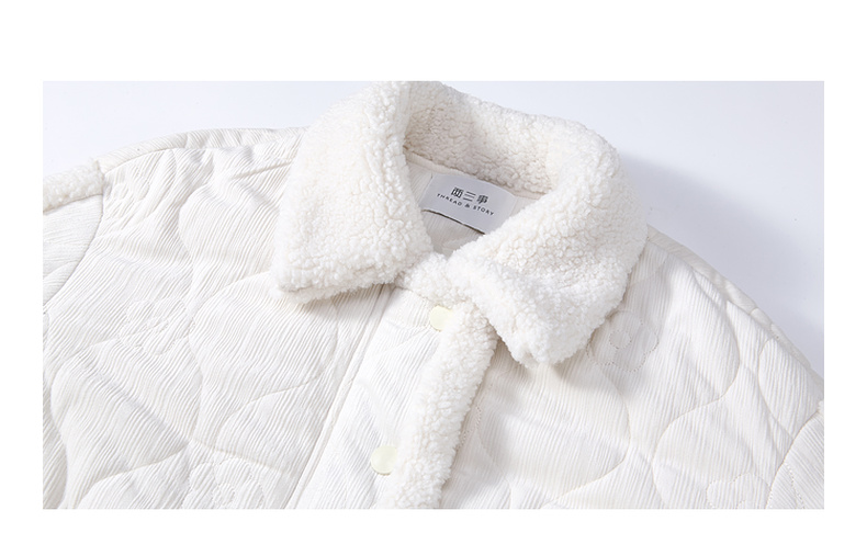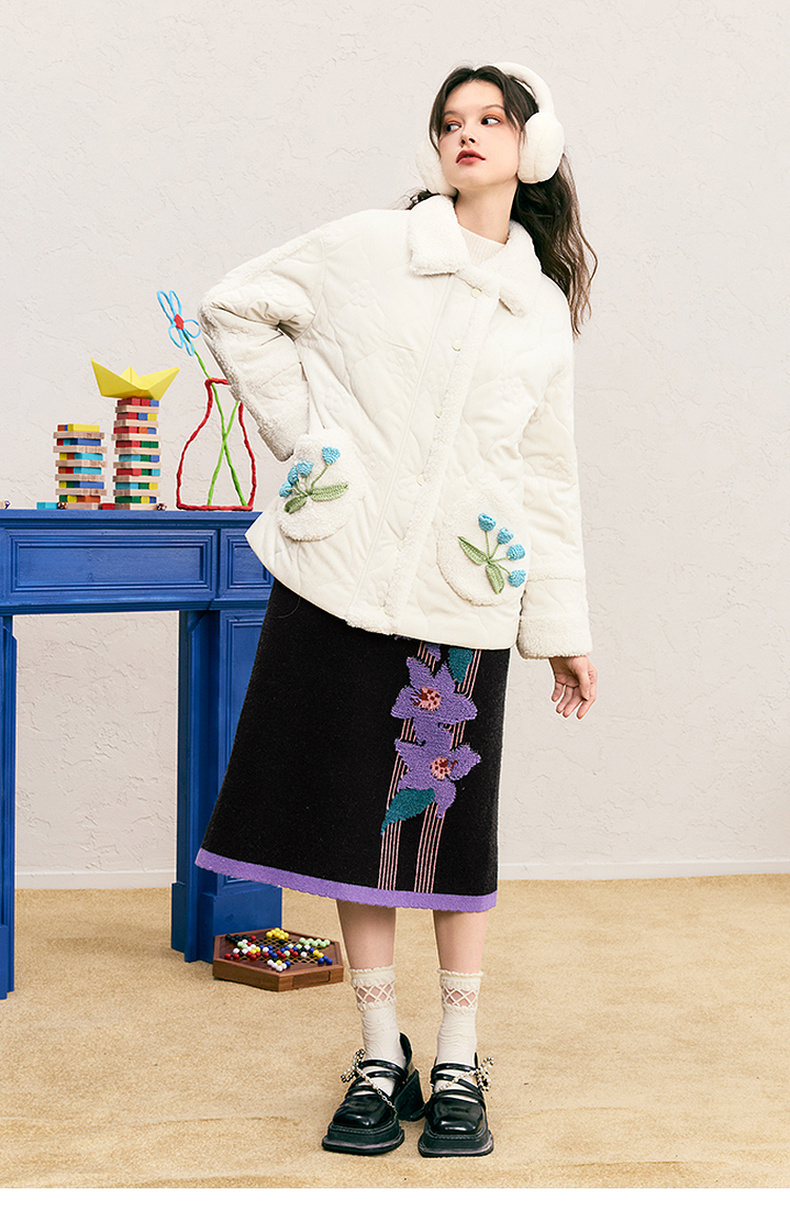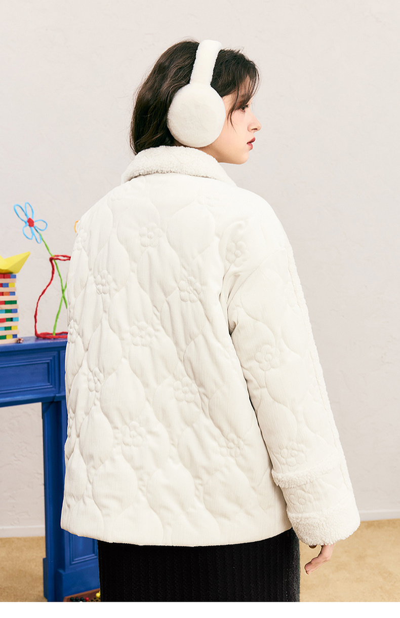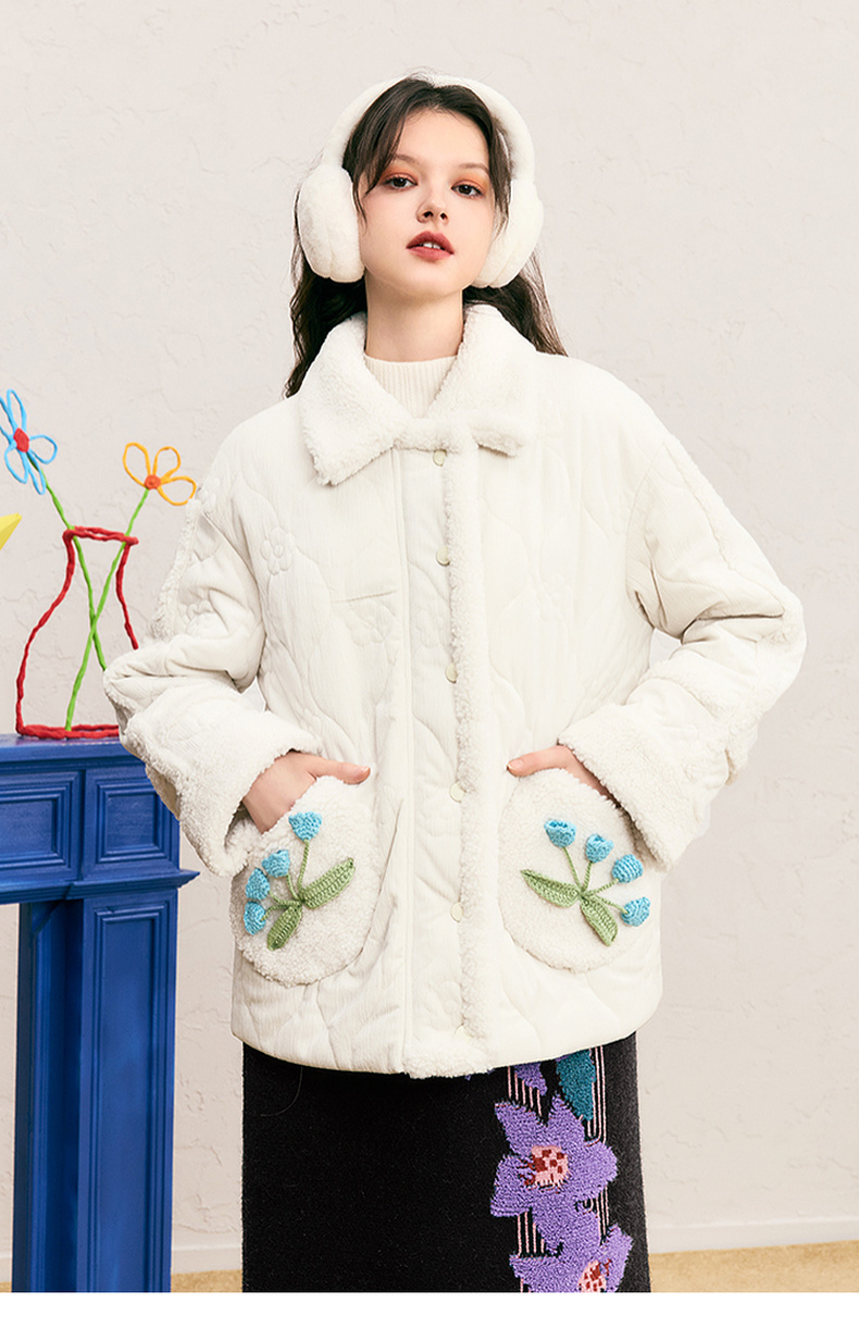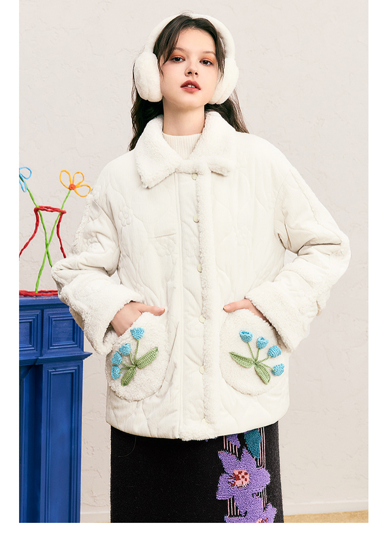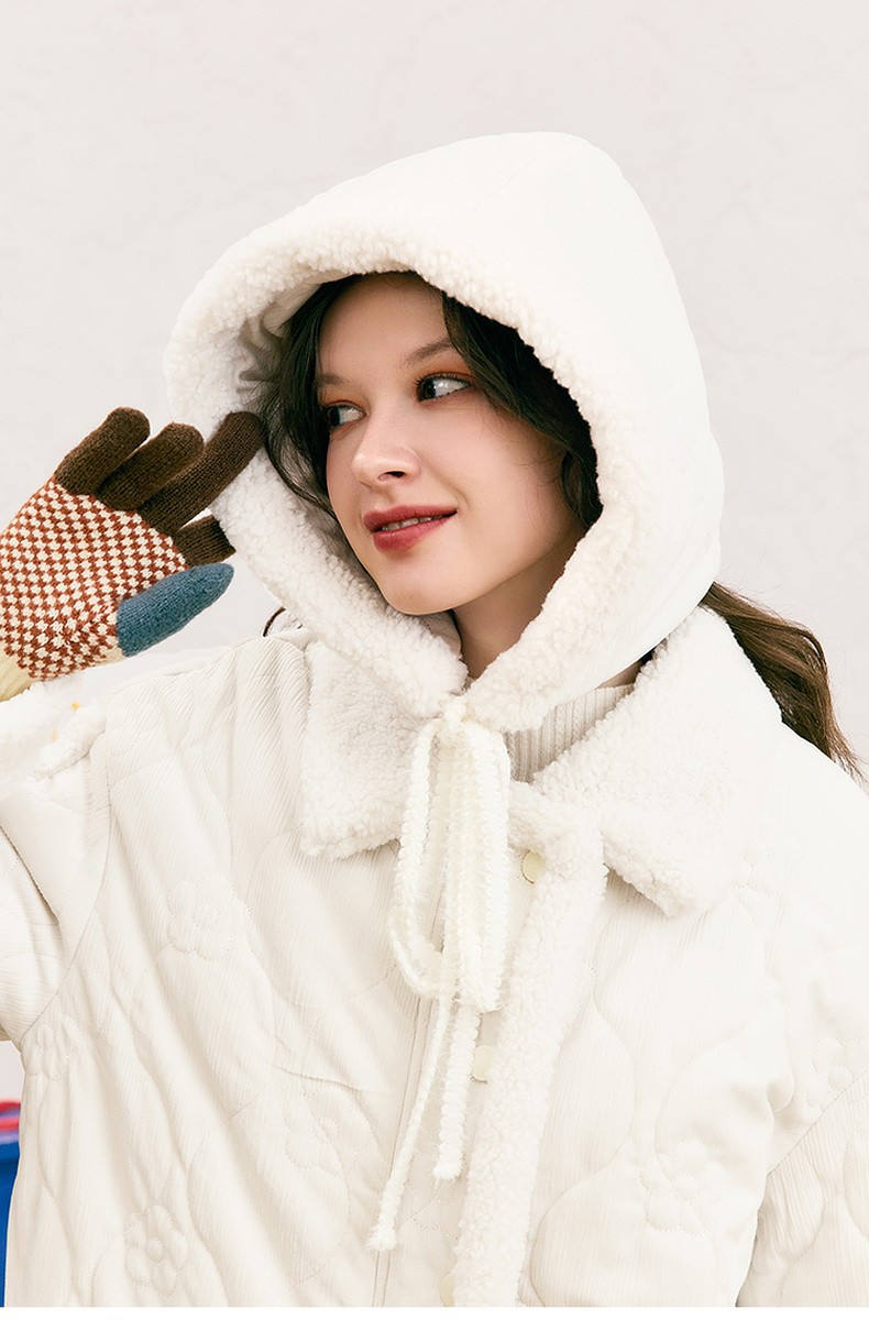 两三事纯真花魅2024冬季新款立体花朵毛绒口袋可拆帽子棉衣外套女