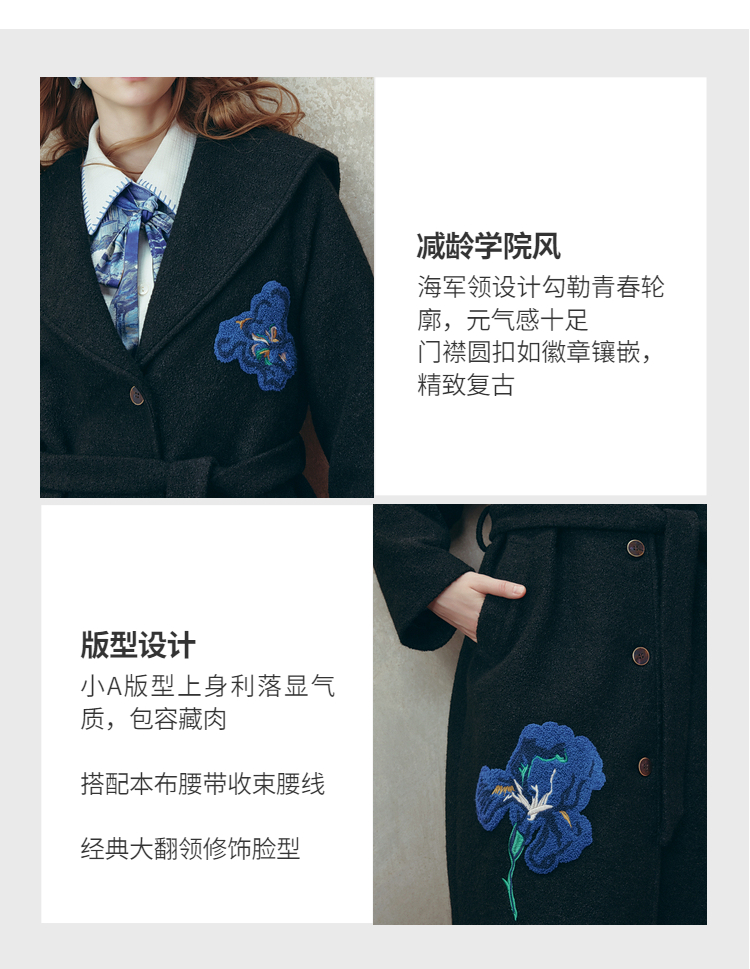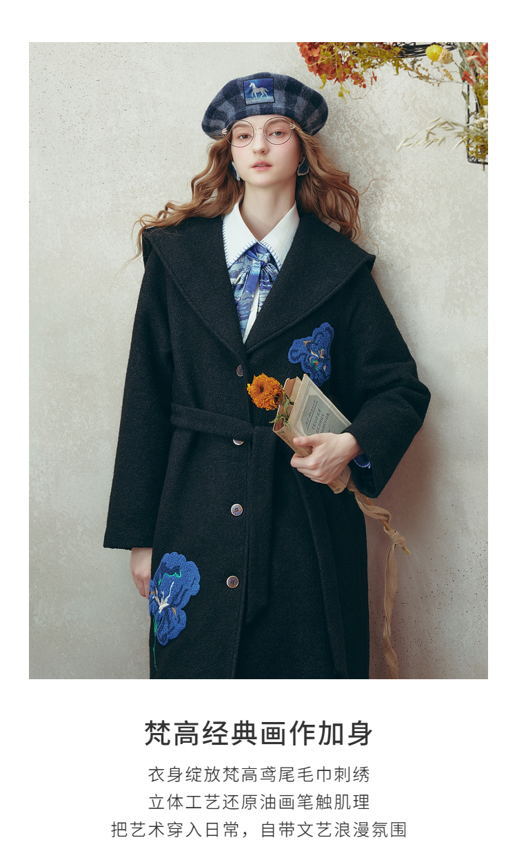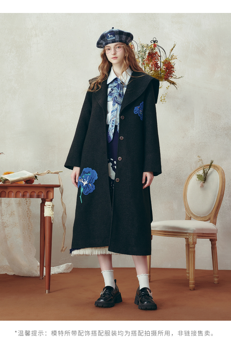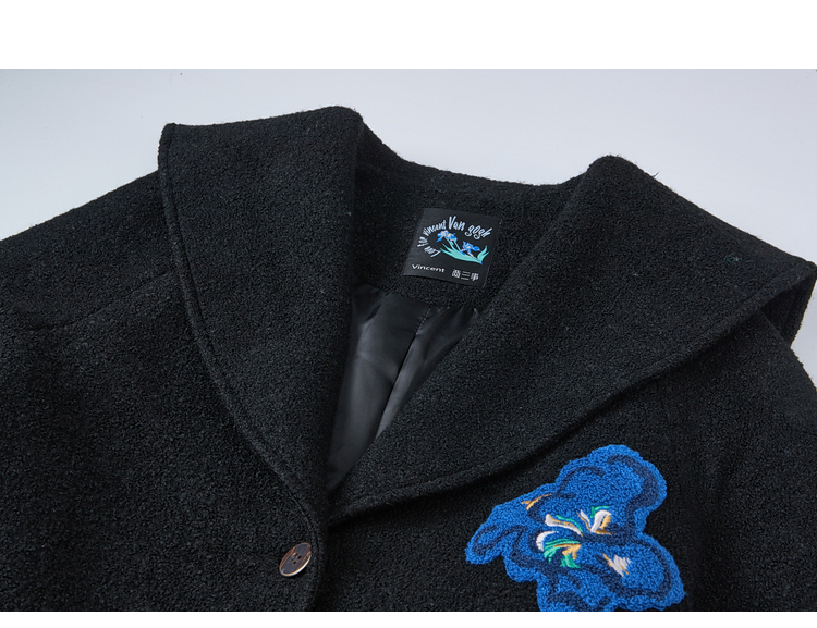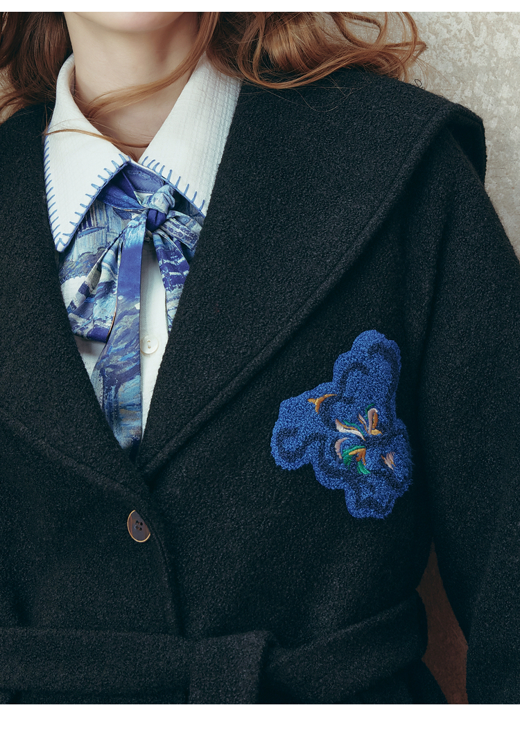 【暖冬内购】两三事梵高文艺冰岛特调2025冬季新款鸢尾花刺绣海军领毛呢外套女