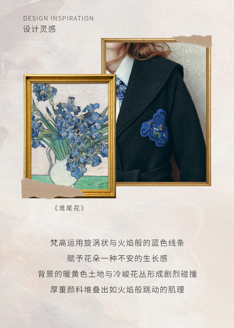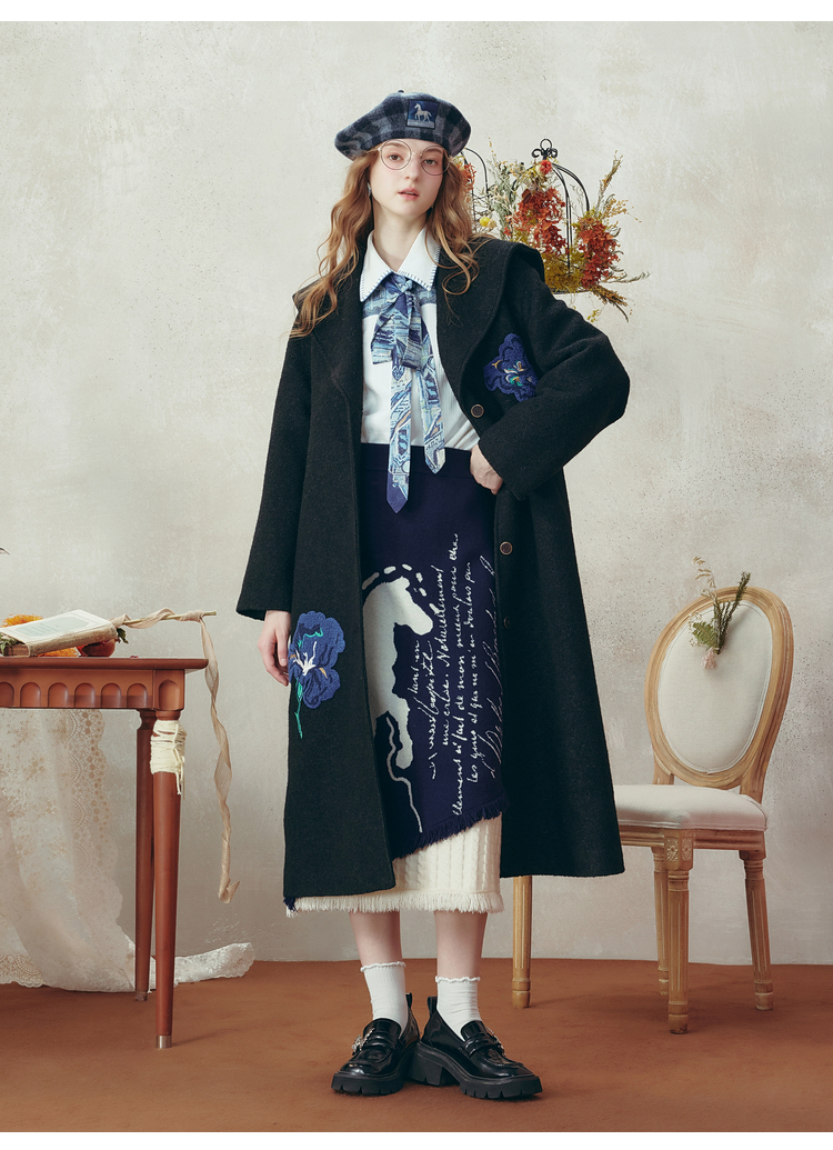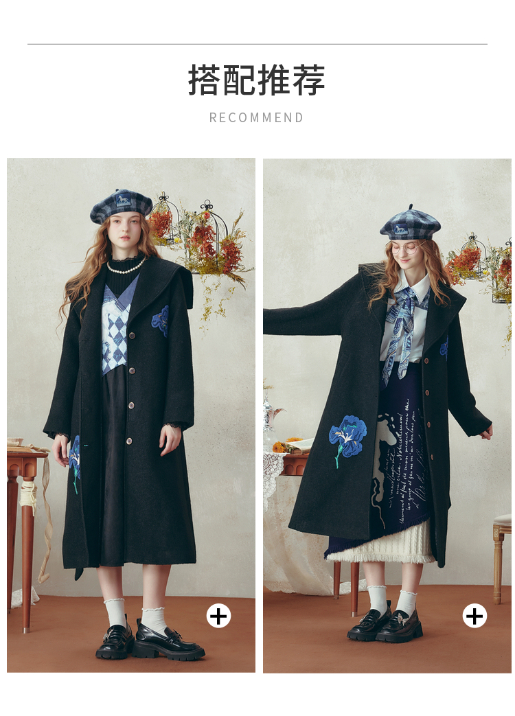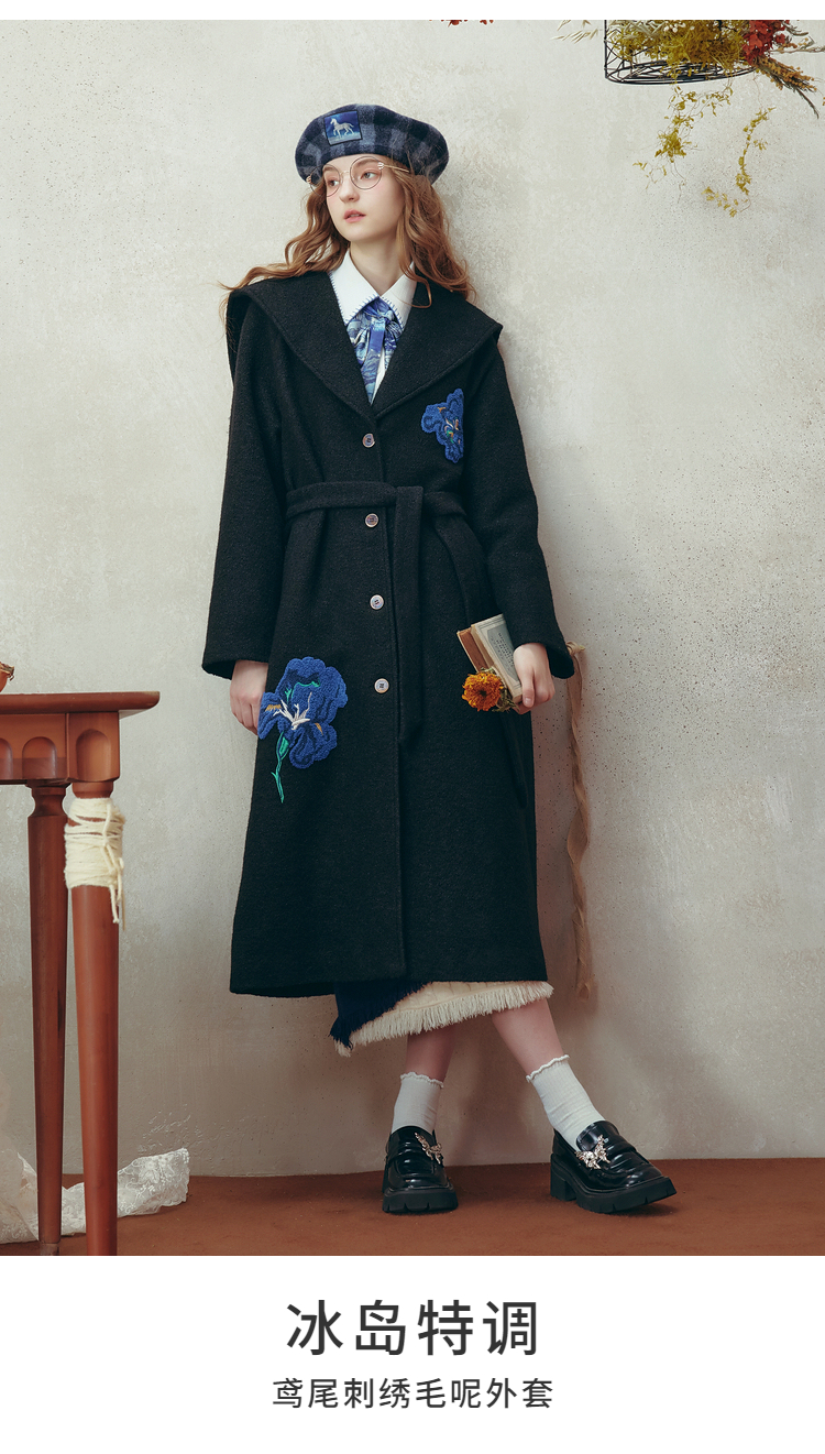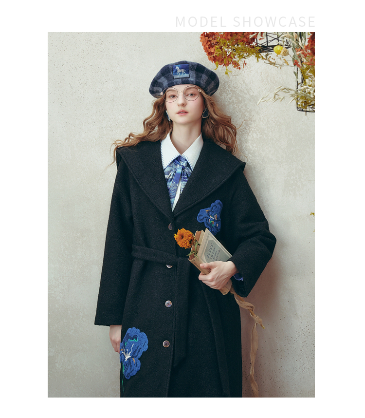 【暖冬内购】两三事梵高文艺冰岛特调2025冬季新款鸢尾花刺绣海军领毛呢外套女