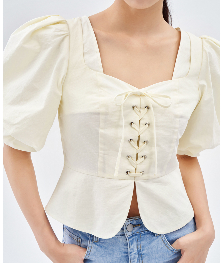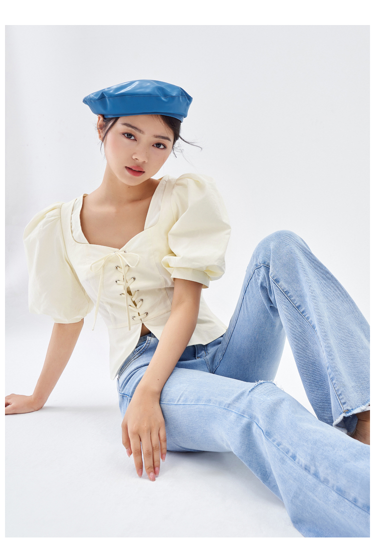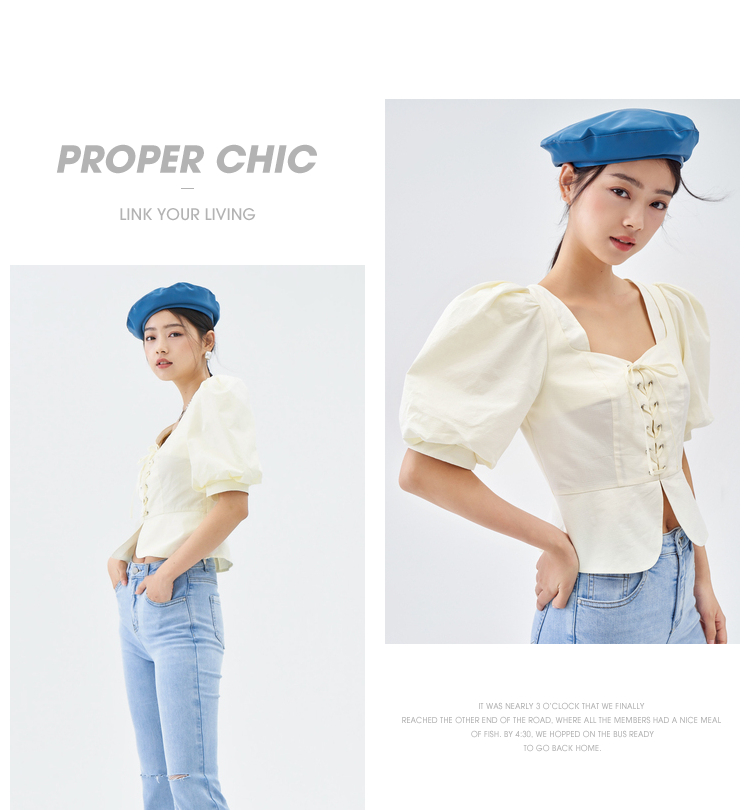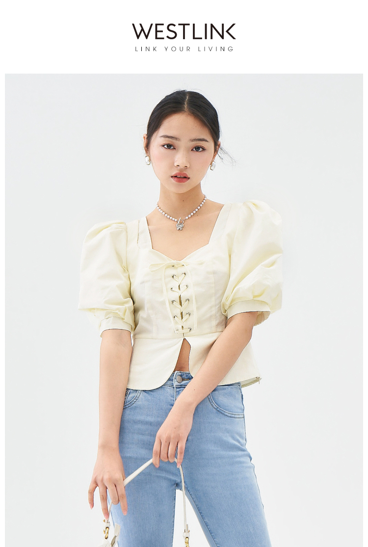 西遇泡泡袖衬衫2021新款法式复古绑带性感露锁骨短款上衣10910632