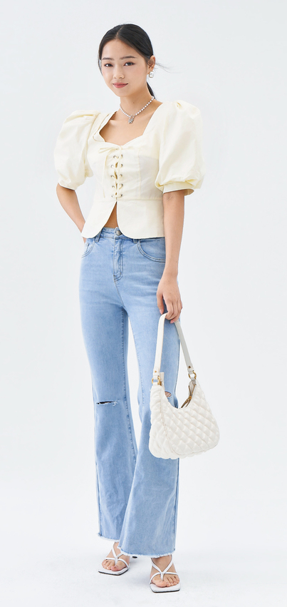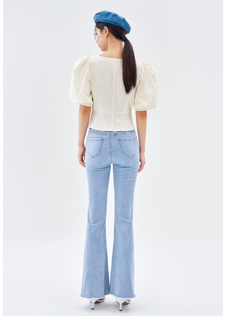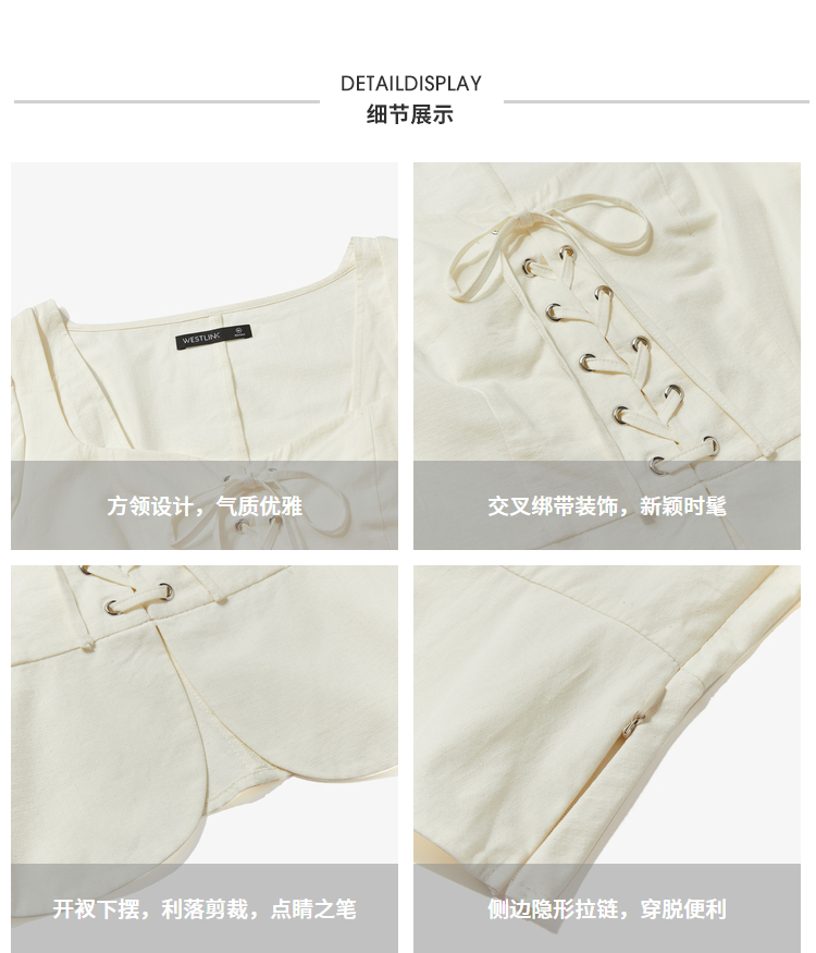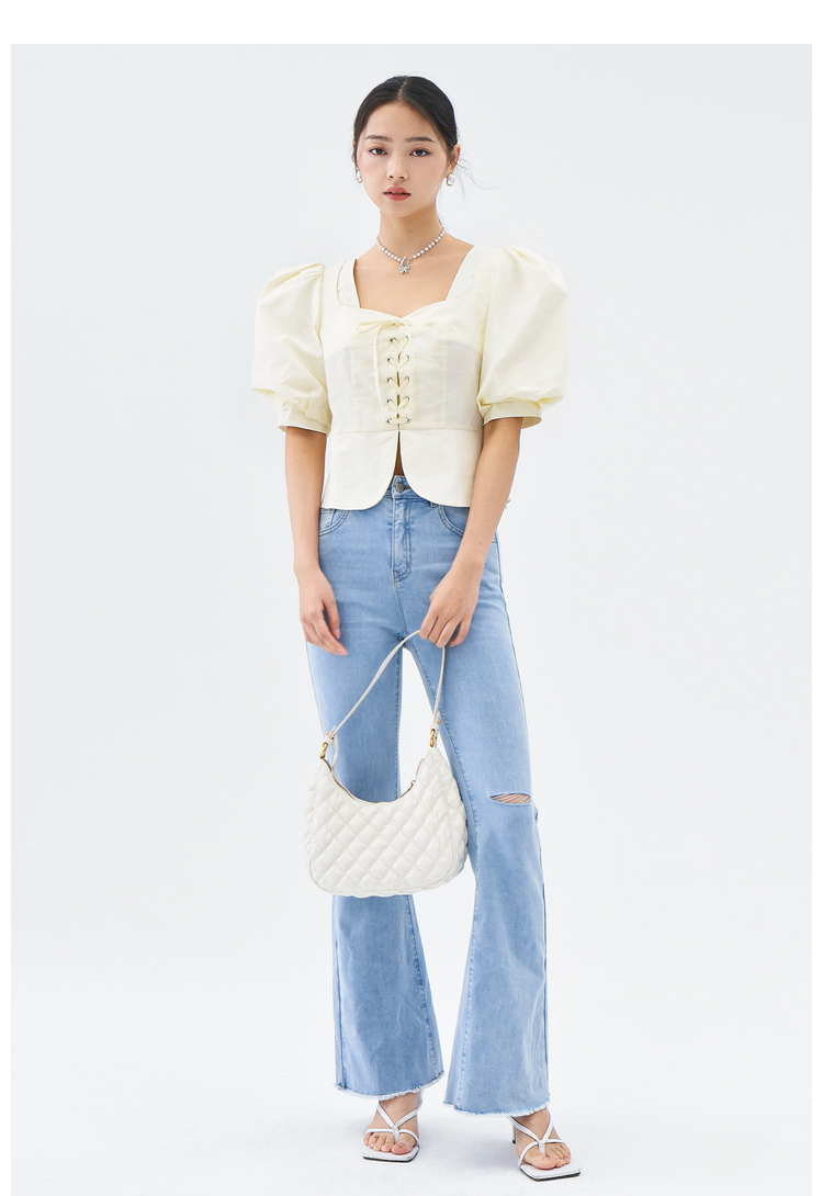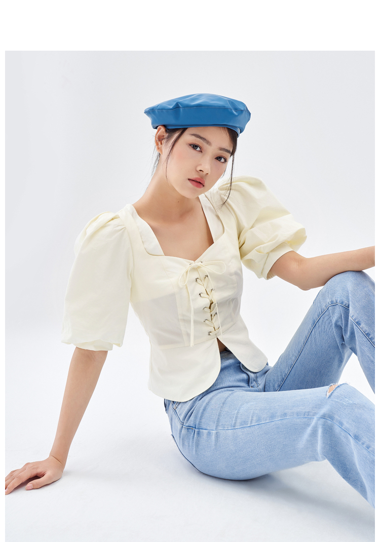 西遇泡泡袖衬衫2021新款法式复古绑带性感露锁骨短款上衣10910632