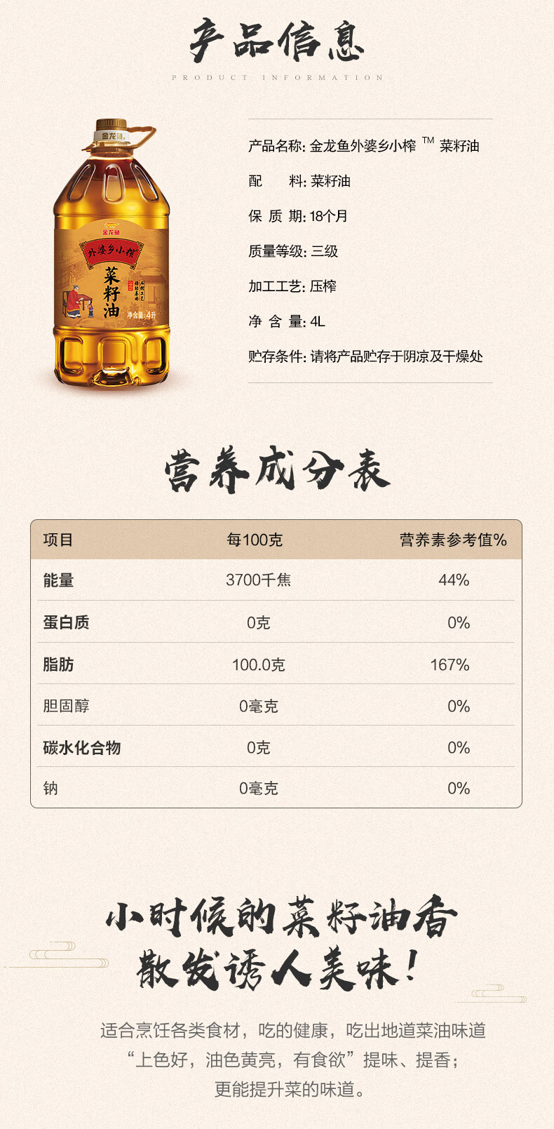 金龙鱼 外婆乡小榨菜籽油 4L