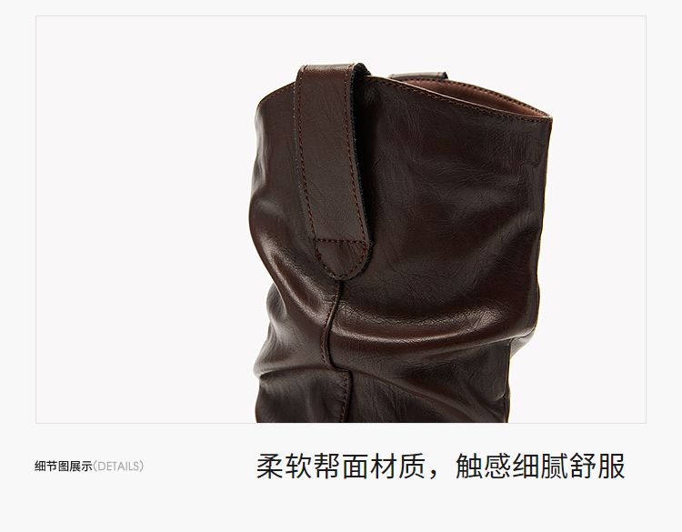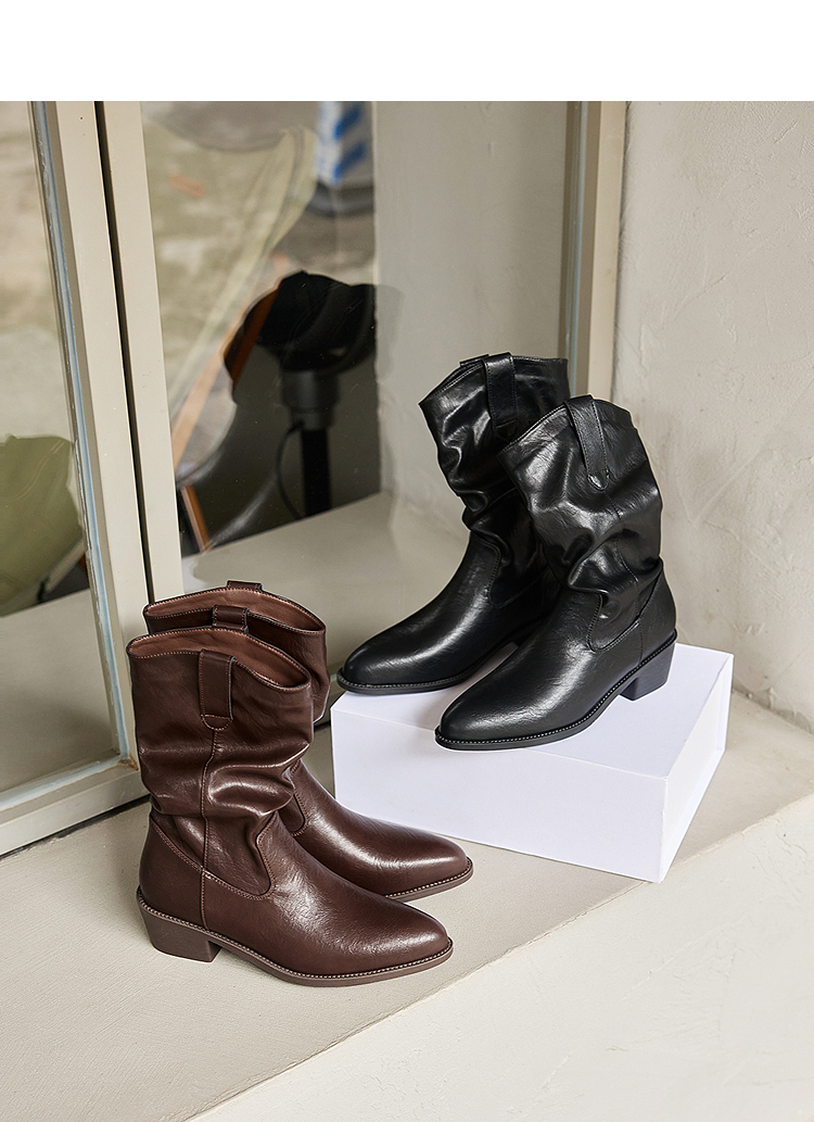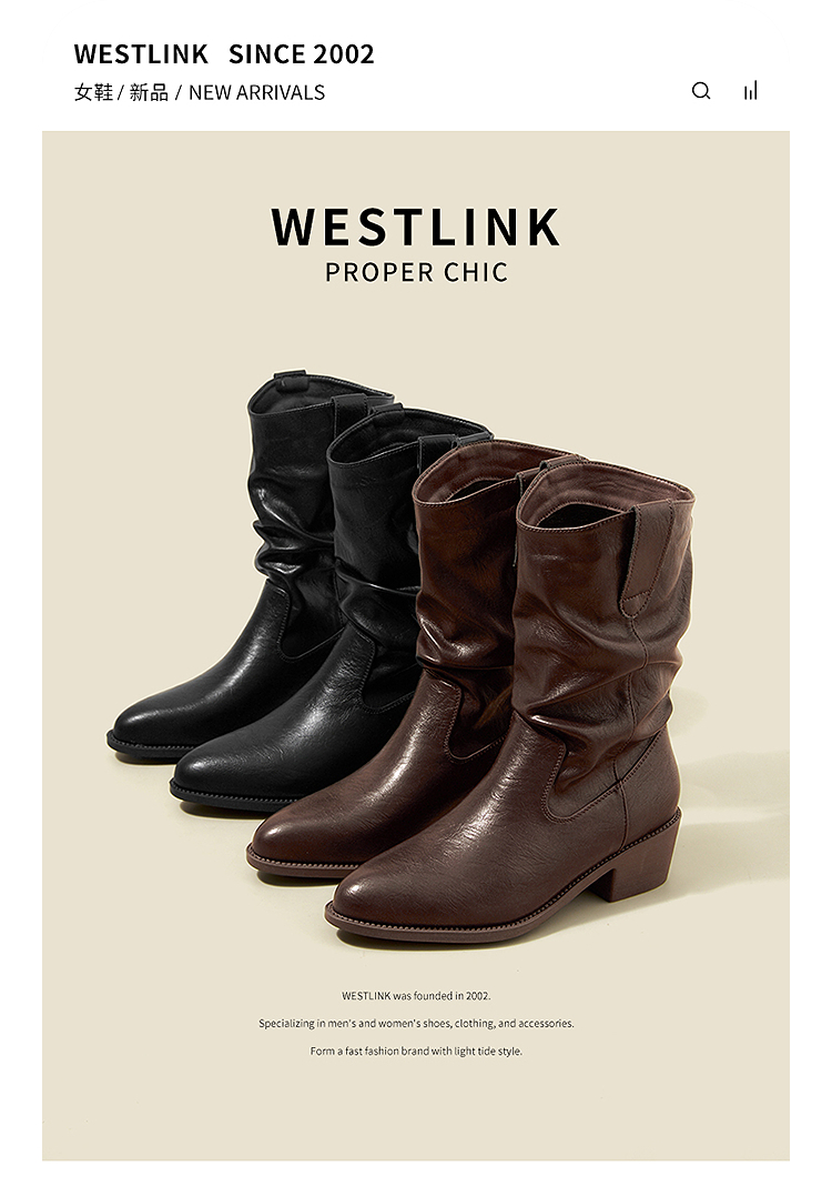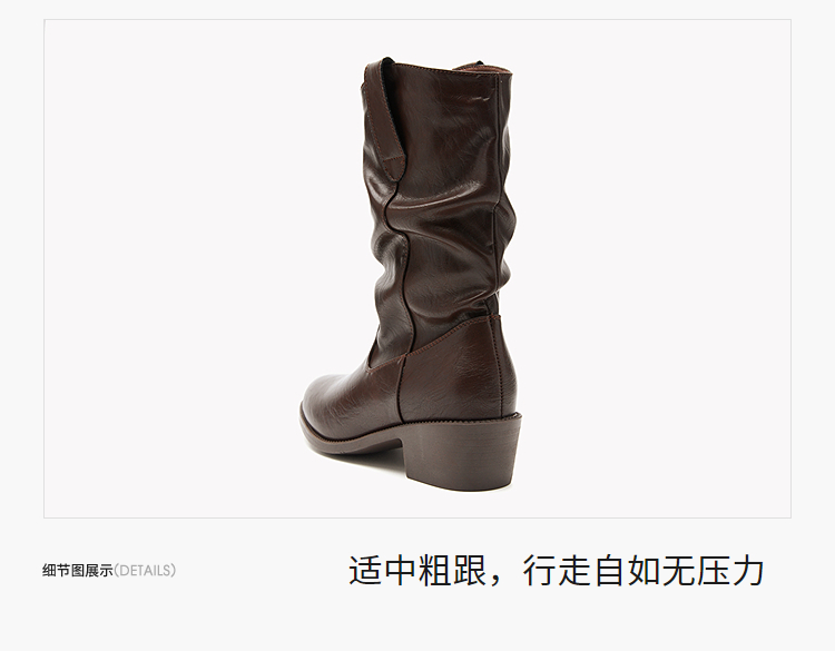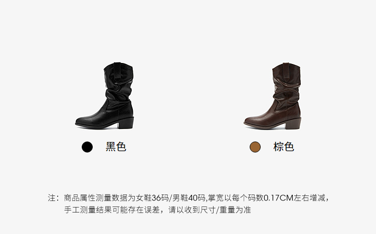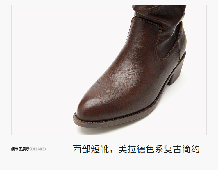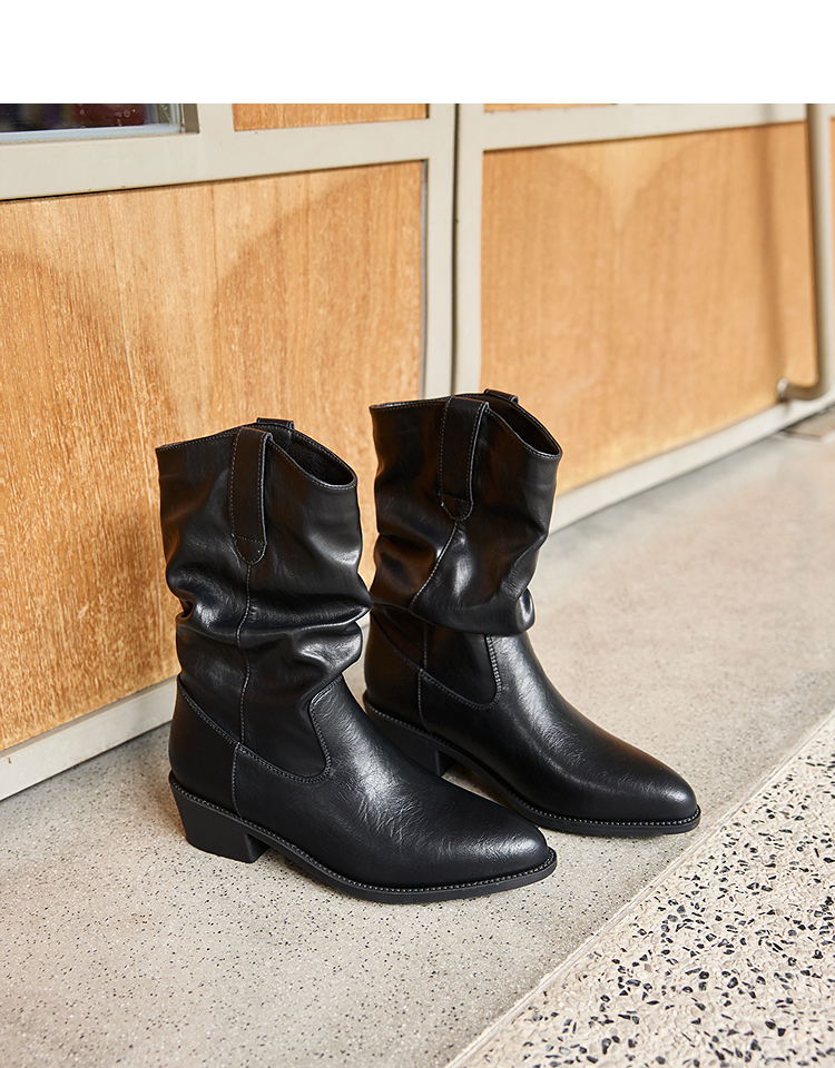 西遇西部牛仔靴女新款秋冬复古V口显瘦堆堆靴子黑色尖头短靴V2157204