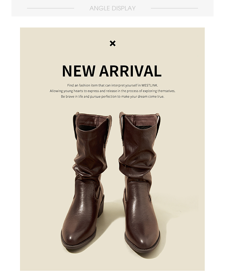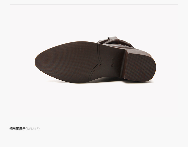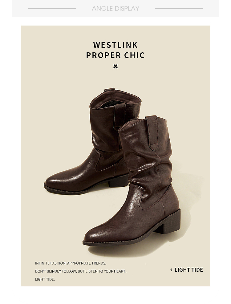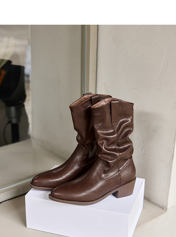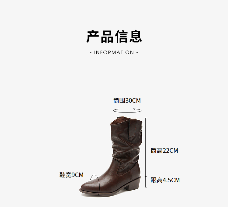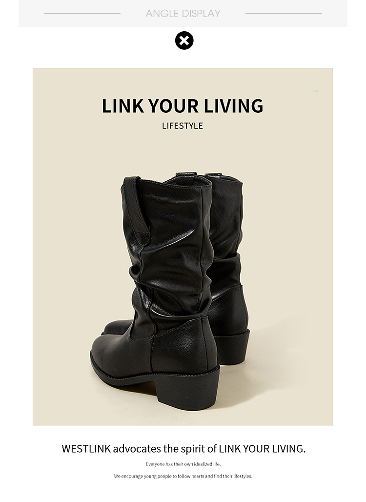 西遇西部牛仔靴女新款秋冬复古V口显瘦堆堆靴子黑色尖头短靴V2157204