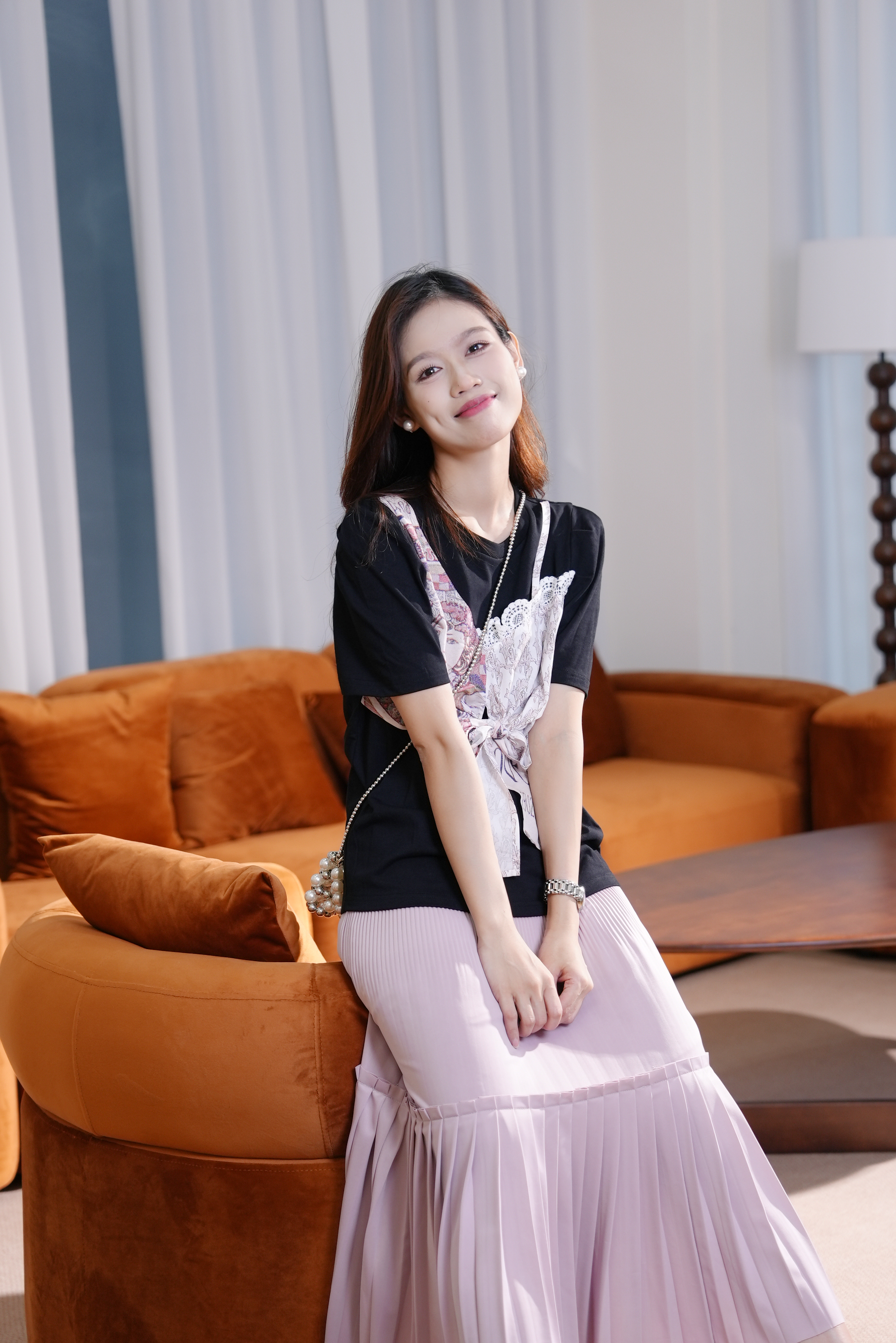 两三事2024夏季新款甜美蕾丝印花拼接假两件t恤女宽松