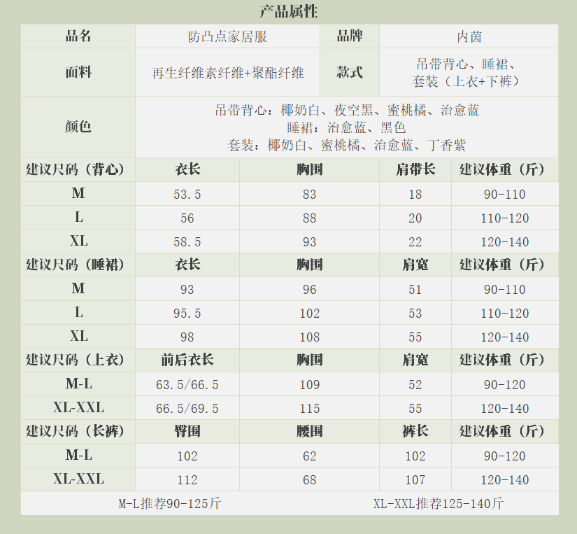 今天给大家带来的内茵家居服系列,共有防凸点背心、睡裙以及睡衣套装,每一款都各有各的美。