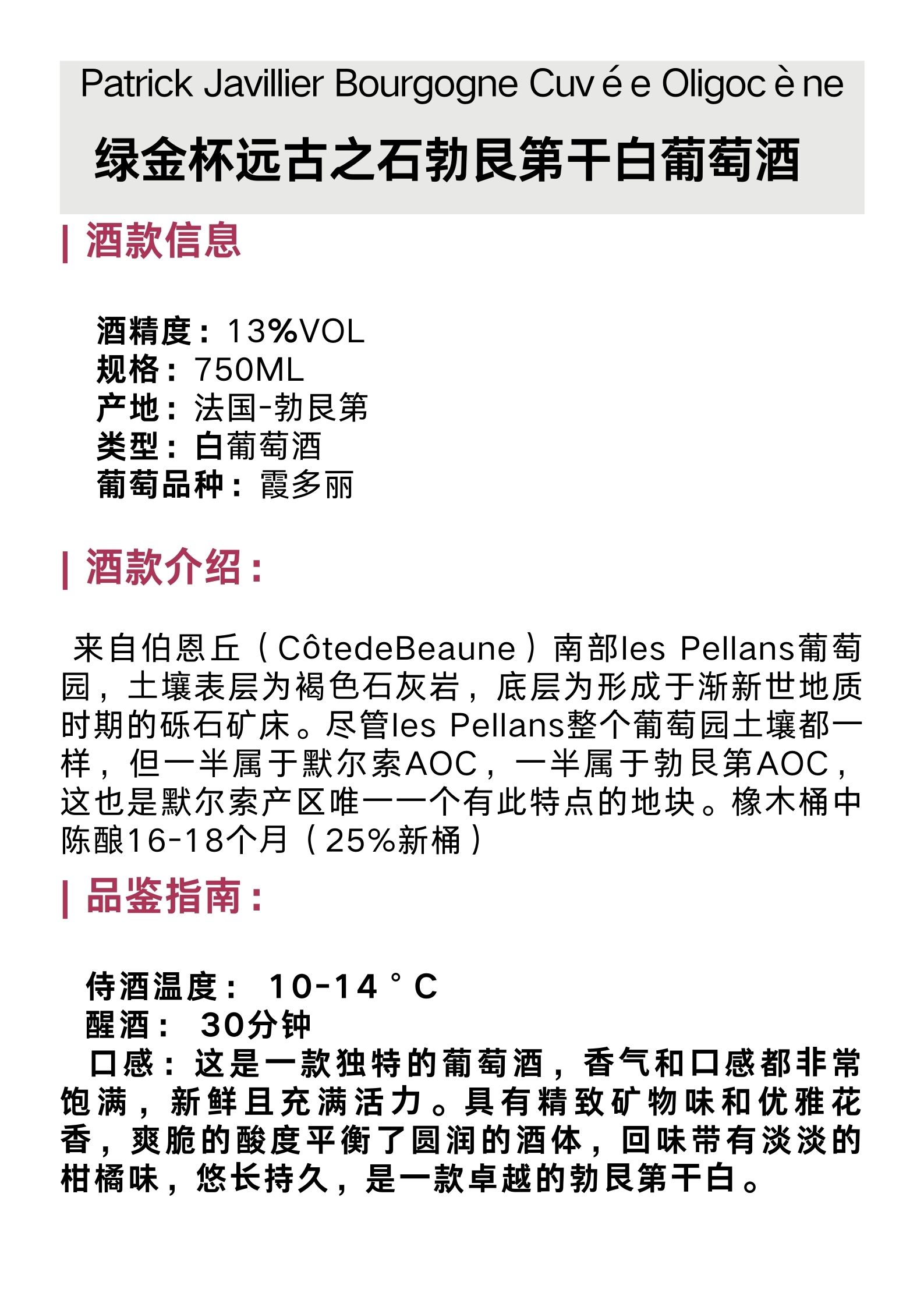 绿金杯远古之石勃艮第干白葡萄酒 Patrick Javillier Bourgogne Cuvée Oligocène
