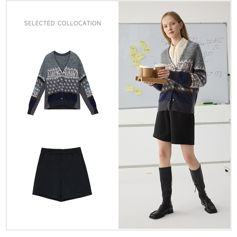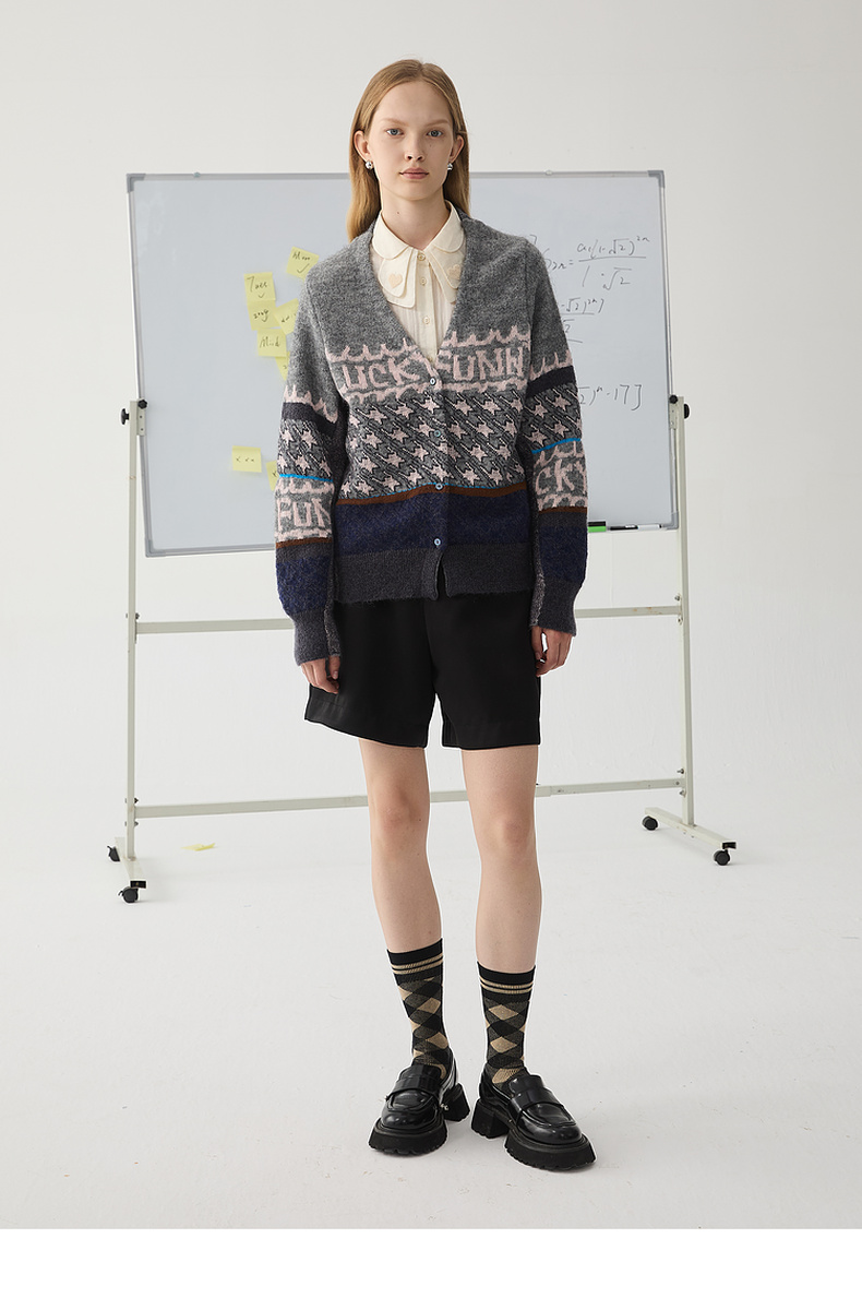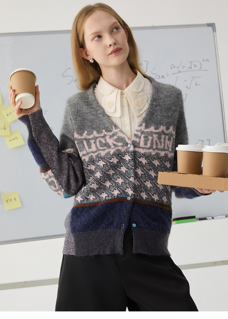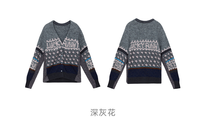 谜底针织开衫女士2024冬季新品复古风提花V领单排扣毛衣244MZ1888