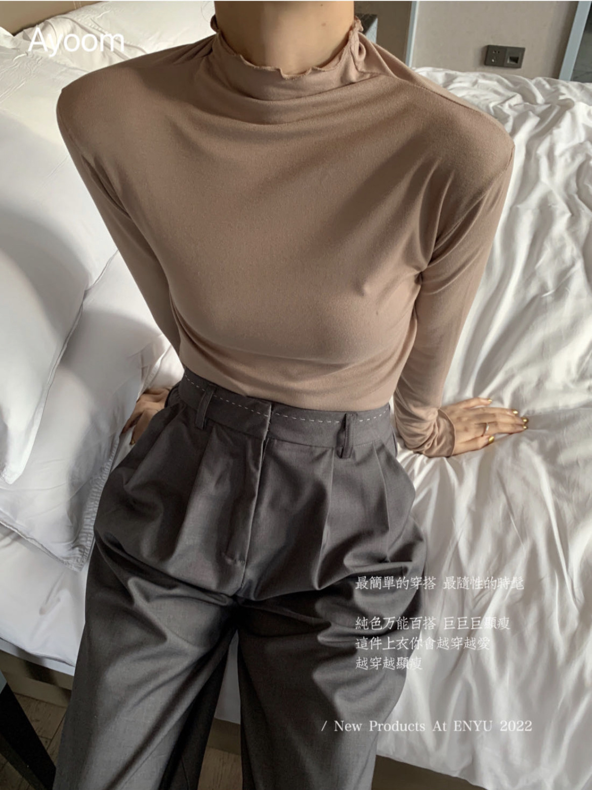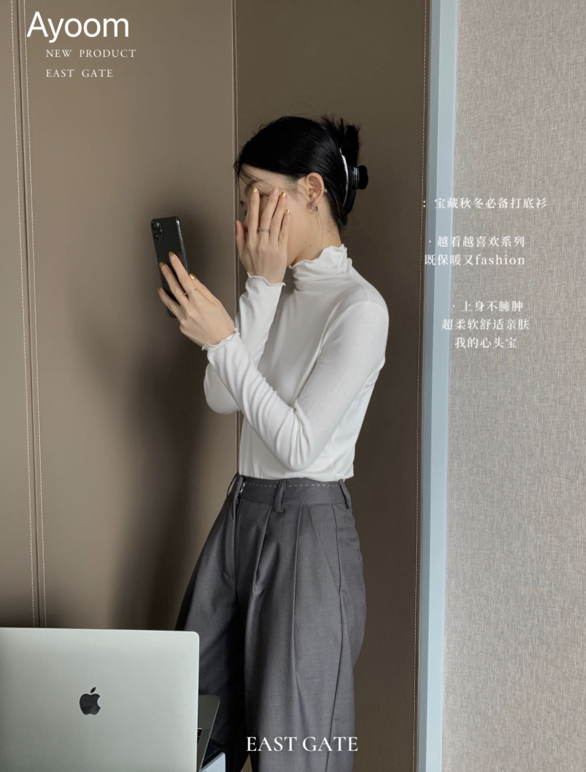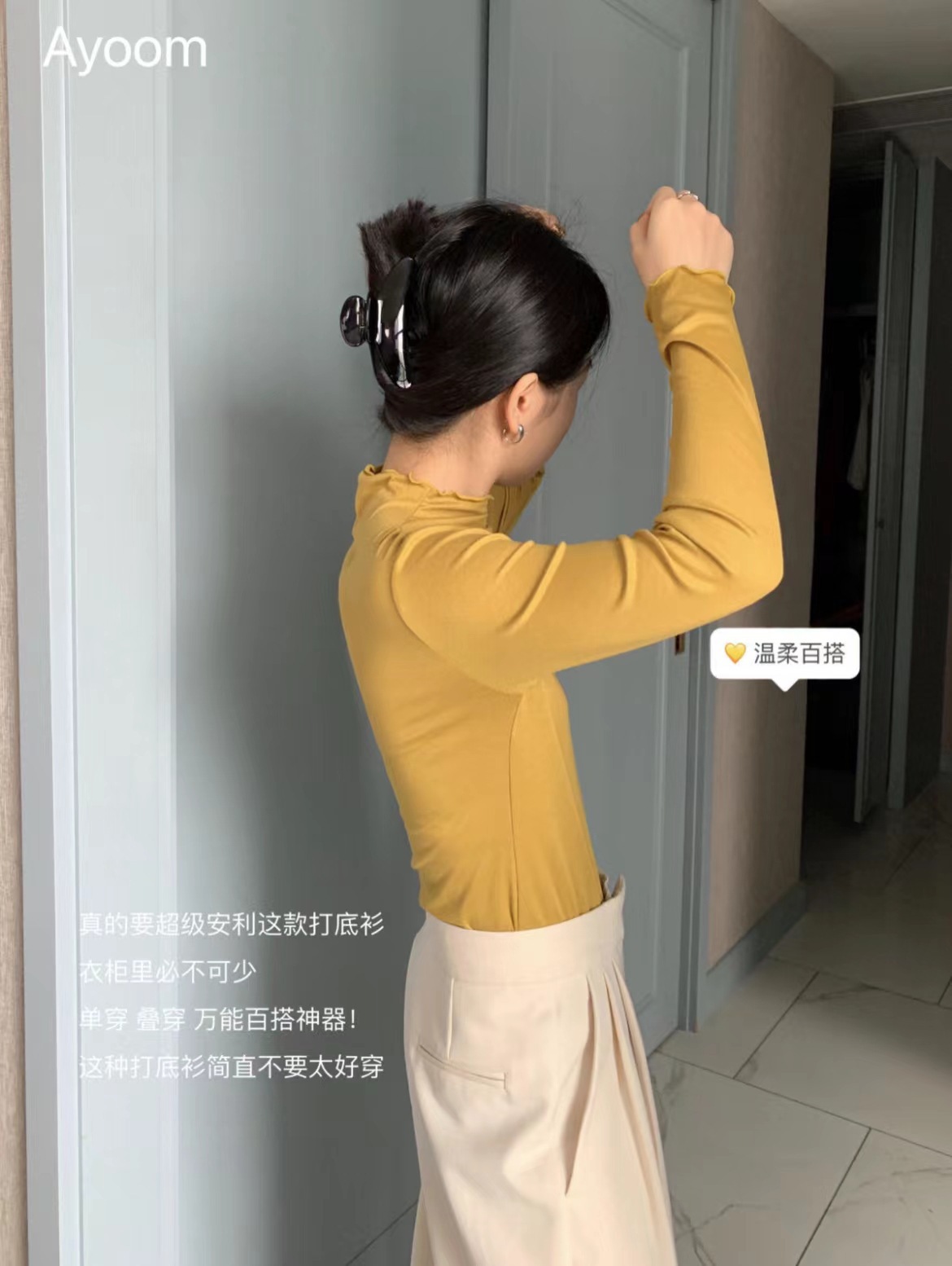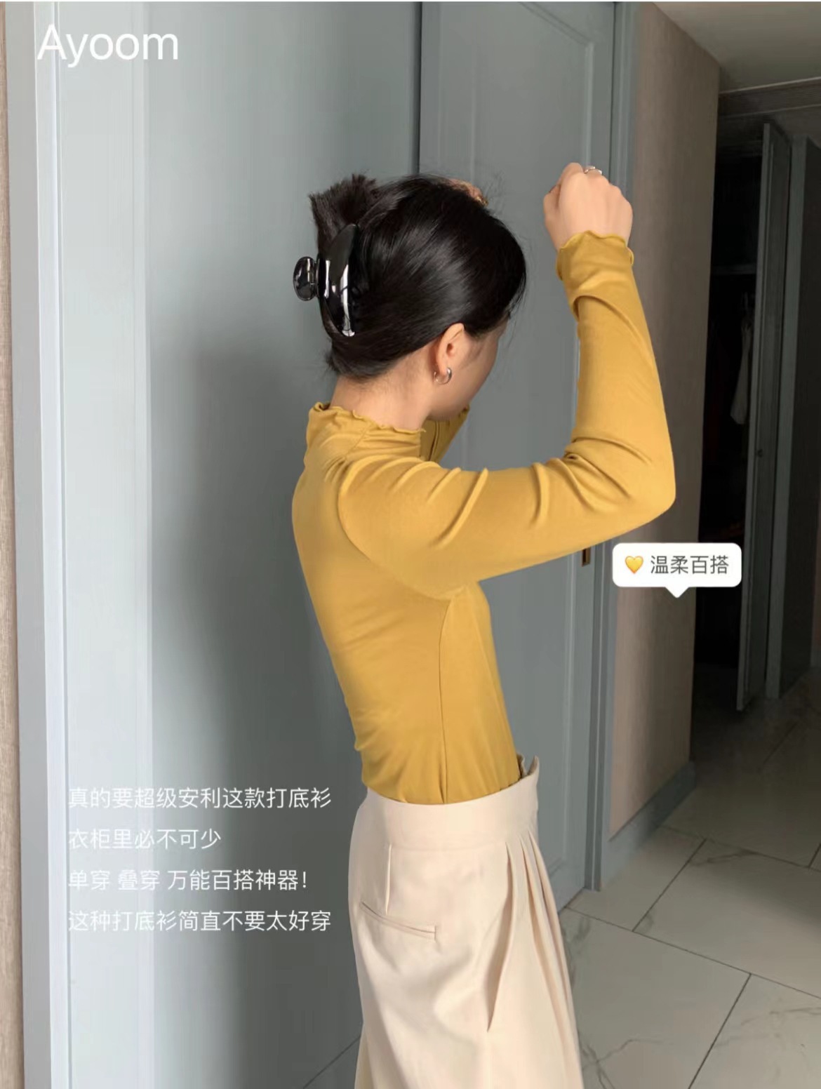 2024新款莫代尔打底衫女春秋新款长袖t恤设计感木耳边半高领白色