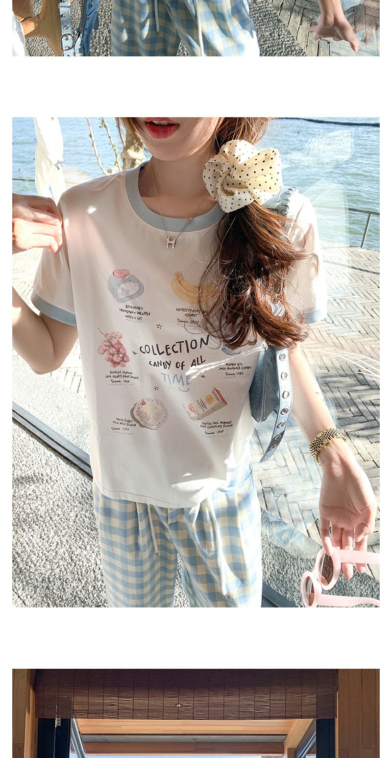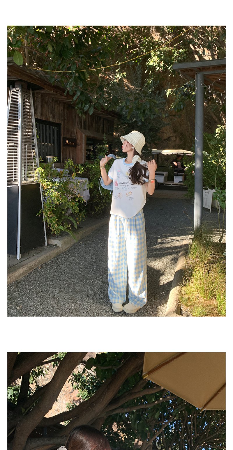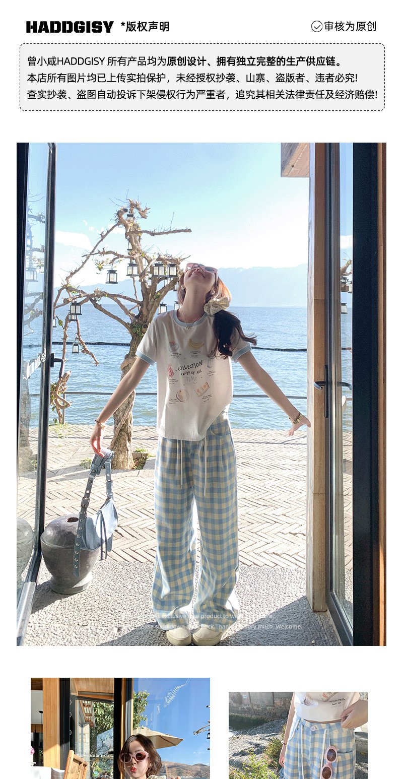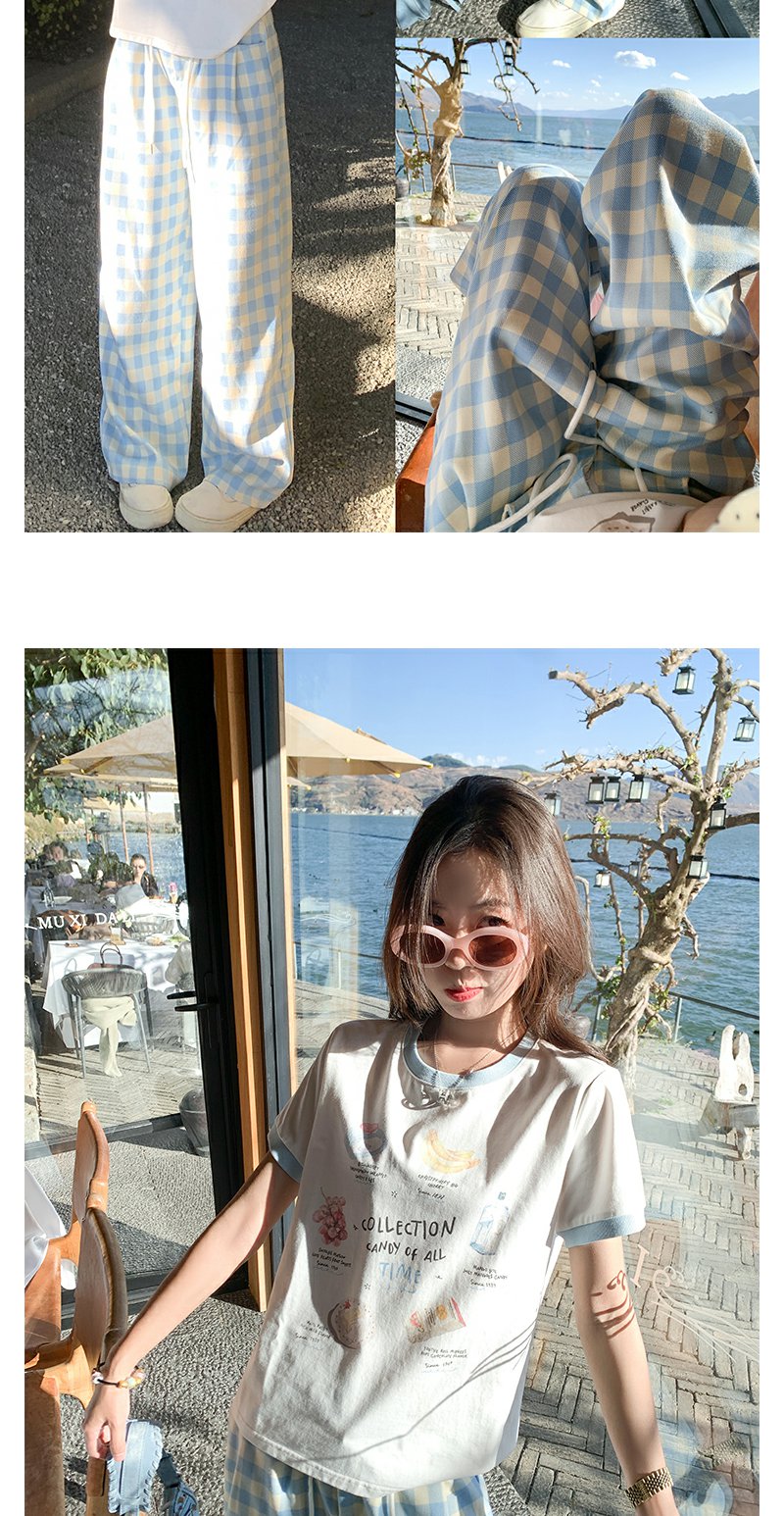 <曾小咸推荐>小清新白色印花短袖撞蓝色边宽松T恤