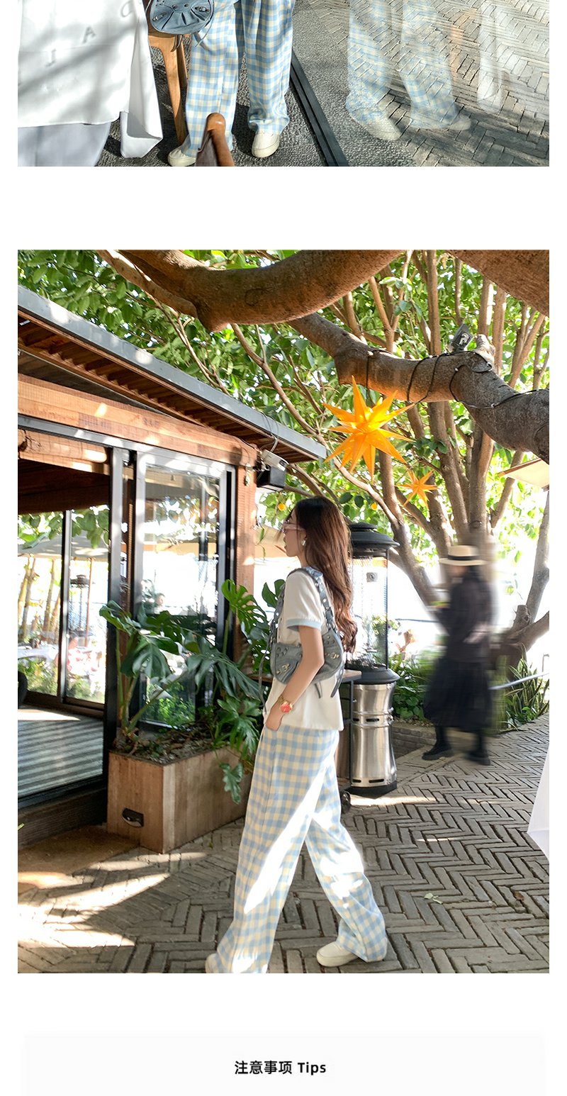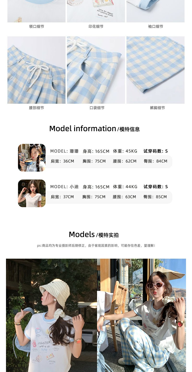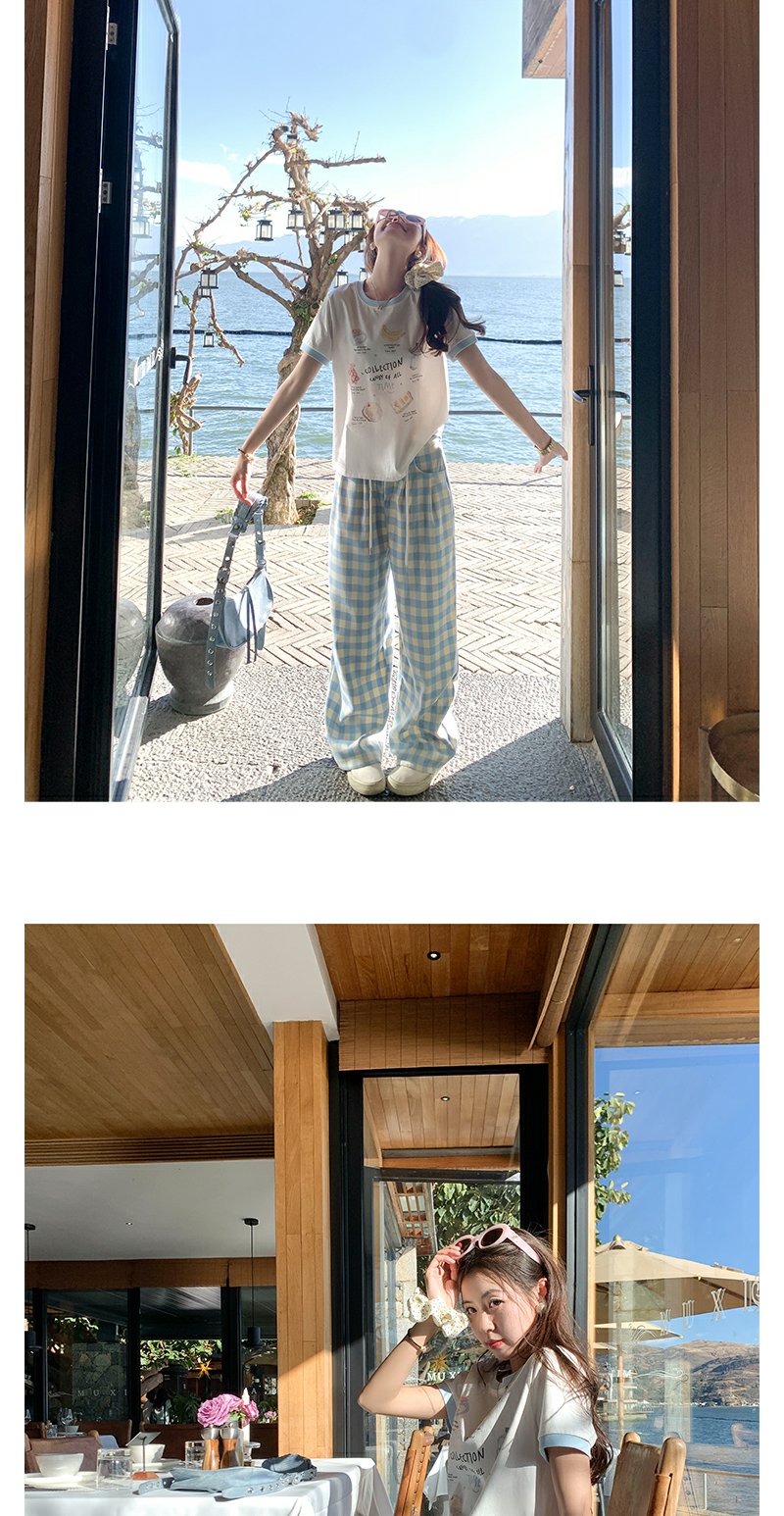 <曾小咸推荐>小清新白色印花短袖撞蓝色边宽松T恤