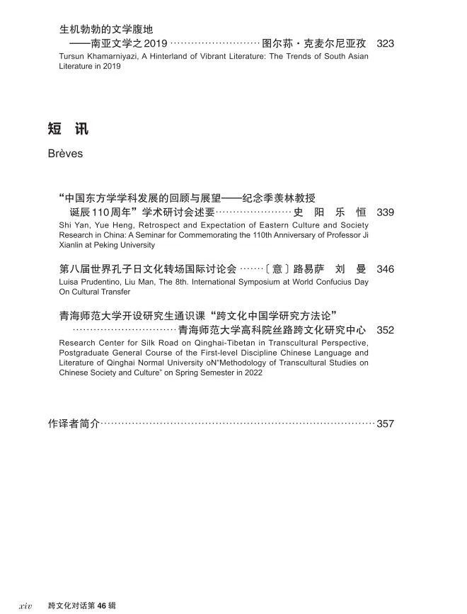 《跨文化对话》46辑,共收入专稿9篇,论稿12篇,远近随笔3篇,短讯3篇。本辑特色有:第一,对已去世的著名汉学家汪德迈有持续的关注,本辑发表了汪德迈生前的访谈及相关纪念文章;第二,对外国文学家的跨文化写作和跨文化接受的相关研究,比如黑塞、扬•卡普林斯基的跨文化写作研究,及中国但丁研究的关注;第三,跨文化相关领域研究,如城市卫生观念与跨文化写作,物质生产的跨文化研究等。本辑学术会议的前沿综述有季羡林诞辰110周年学术研讨会和国际孔子日讨论会的相关报道。