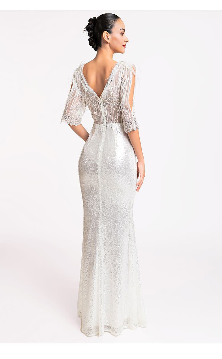 LIZZY优雅轻奢修身显瘦立体鸵鸟毛钉珠鱼尾派对礼服宴会婚庆长款连衣裙7190