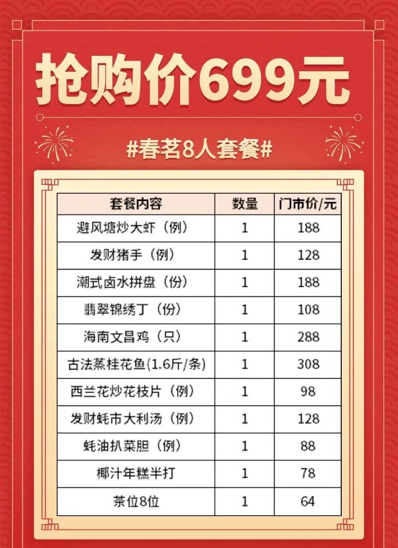 春茗8人套餐抢购价:699元(门市价:1664元)