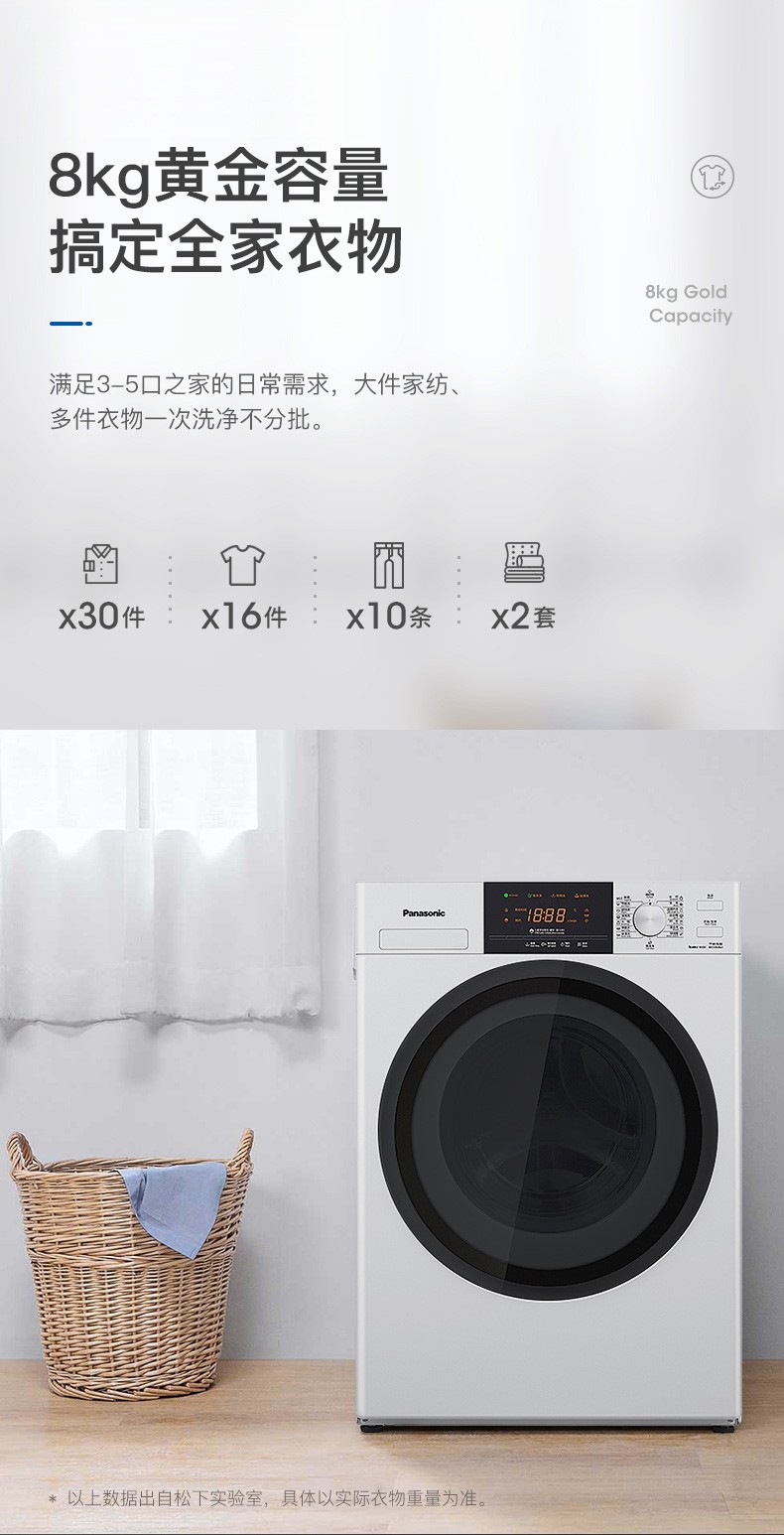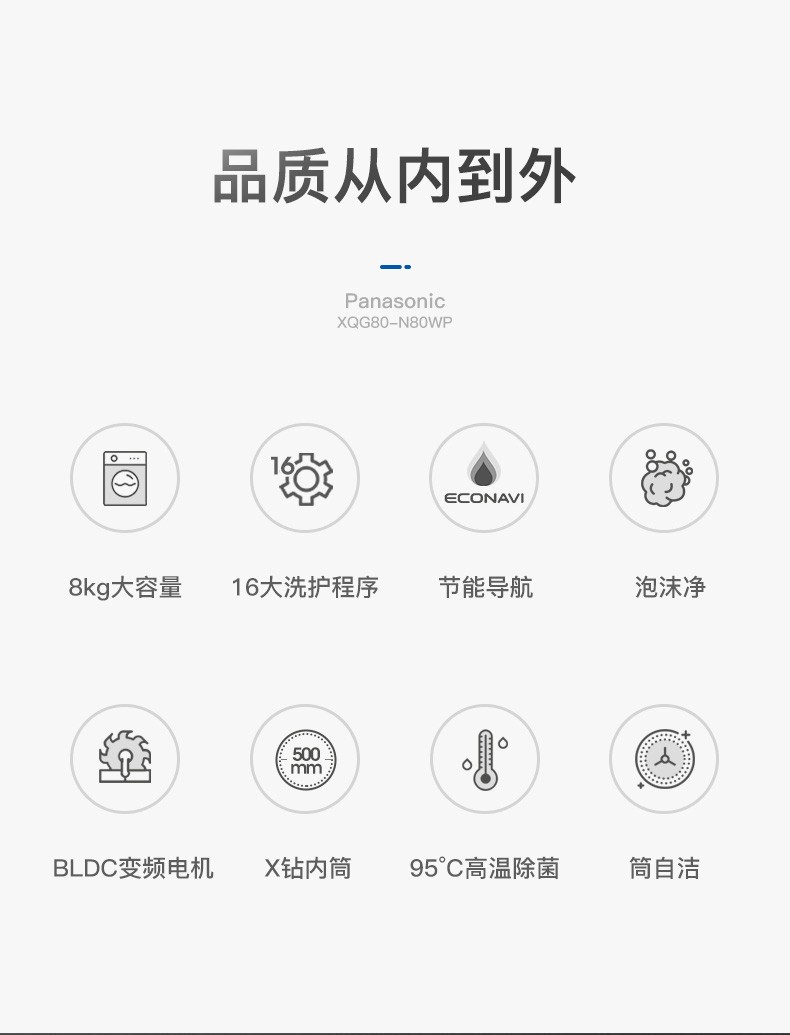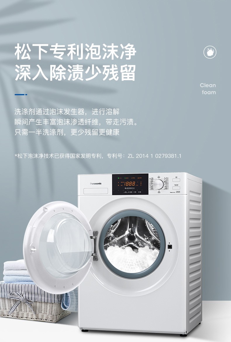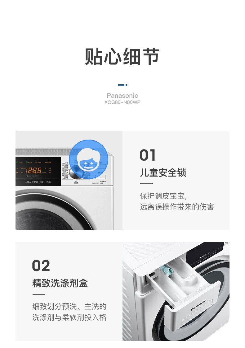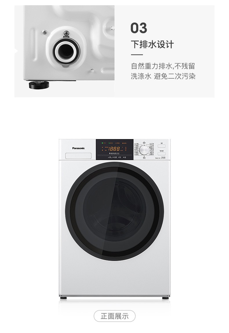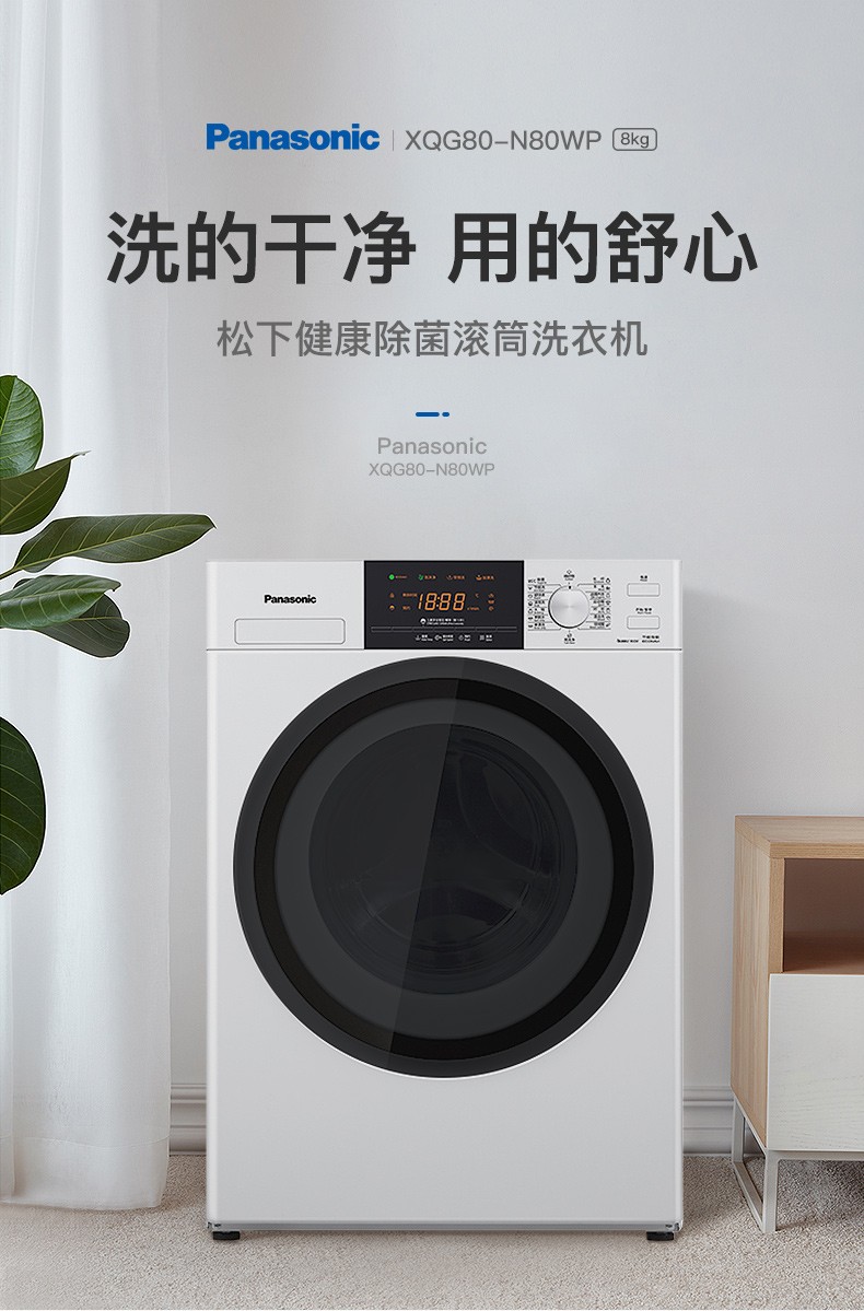 松下(Panasonic)全自动变频滚筒洗衣*公斤下排水节能节水泡沫净XQG80-N80WP 白色
