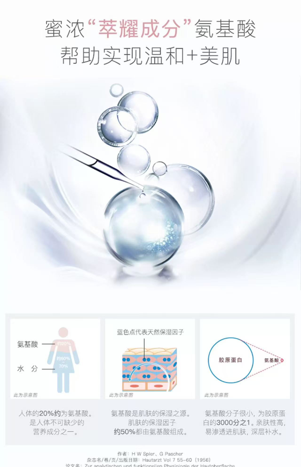 蕴含 11 种氨基酸,其中 9 种保湿氨基酸如同为肌肤筑起坚固堡垒,提升肌肤自身防御力,让干性、敏感性肌肤无惧尘埃、温度变化等外界刺激;2 种清透氨基酸则化身肌肤抗氧化小卫士,有效抑制肌肤糖化,助力肌肤重焕透亮、嫩白光彩。其独特氨基酸配方,保湿效果堪称一流,能迅速为肌肤补足水分,并在肌肤表面悄然形成一层轻薄保湿薄膜,实现长效保湿,让肌肤整日都维持水润弹嫩状态。