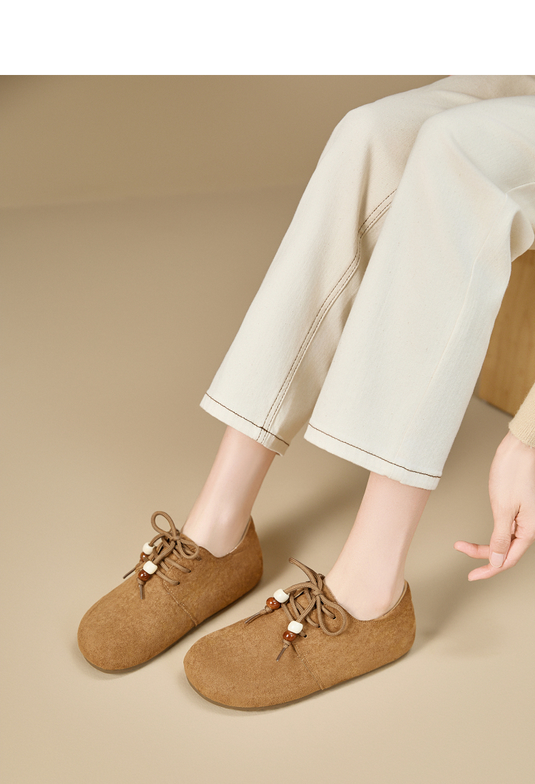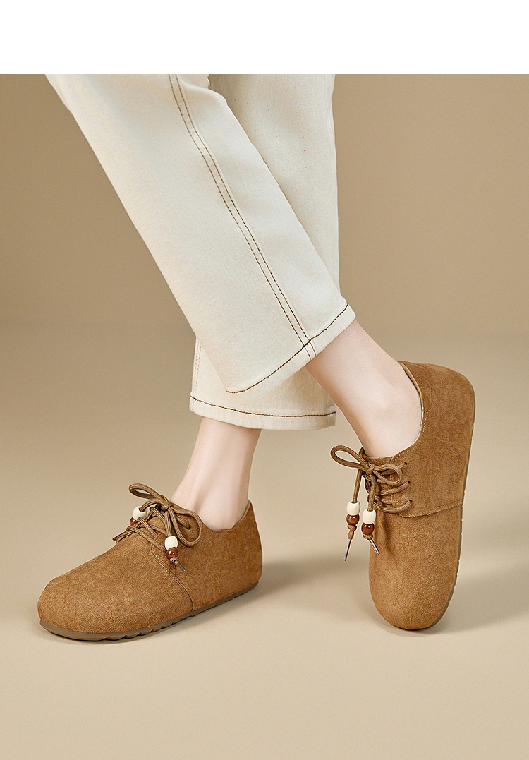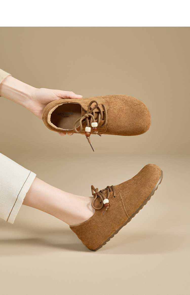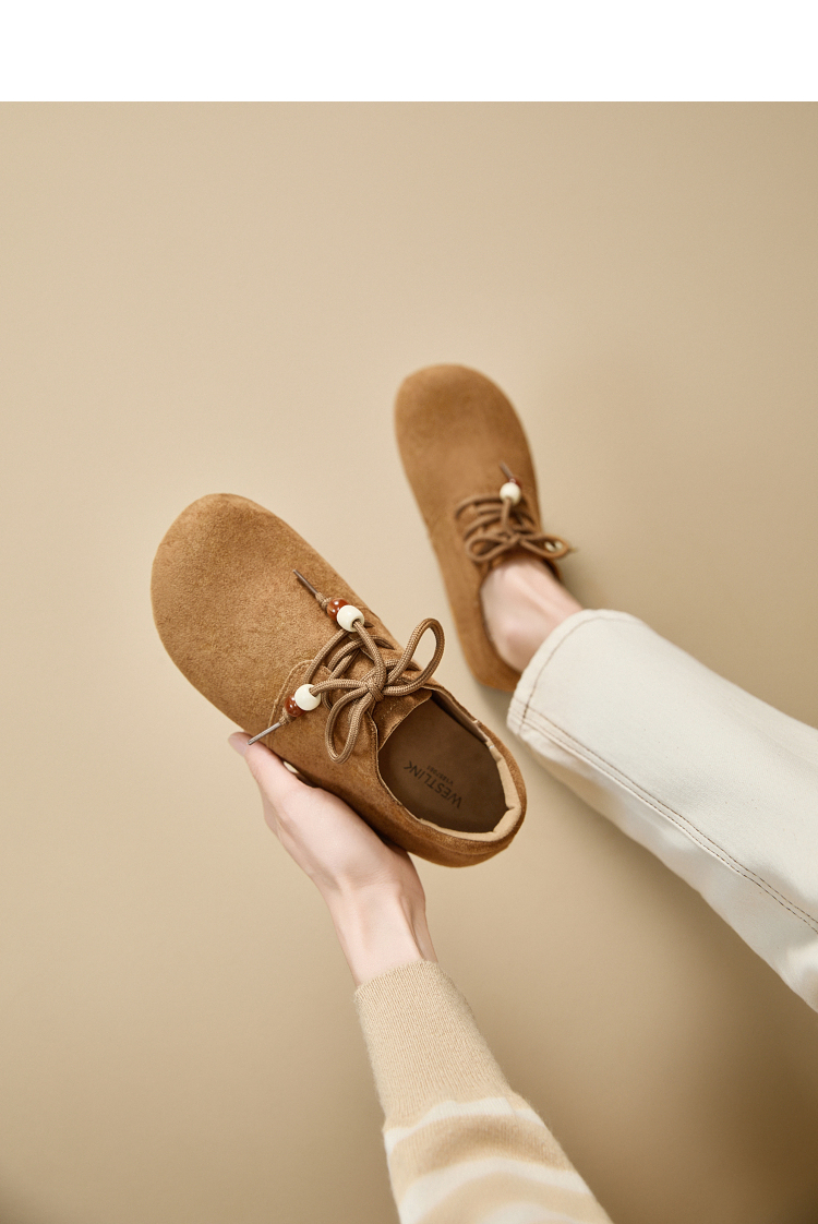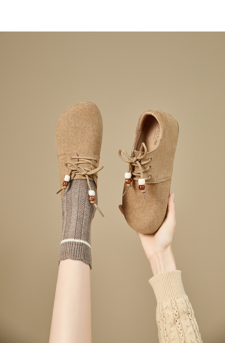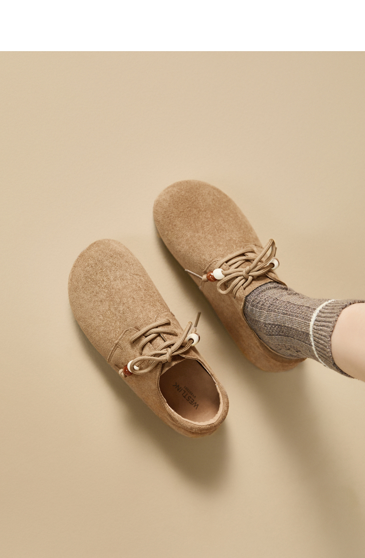 【限时秒杀】西遇平底勃肯鞋女新款秋季复古百搭袋鼠鞋圆头软底系带小皮鞋V1857061