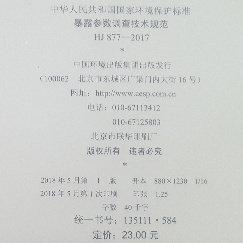 HJ 877-2017 暴露参数调查技术规范 国家环境保护标准 国标 GB 环境保护部 135111584