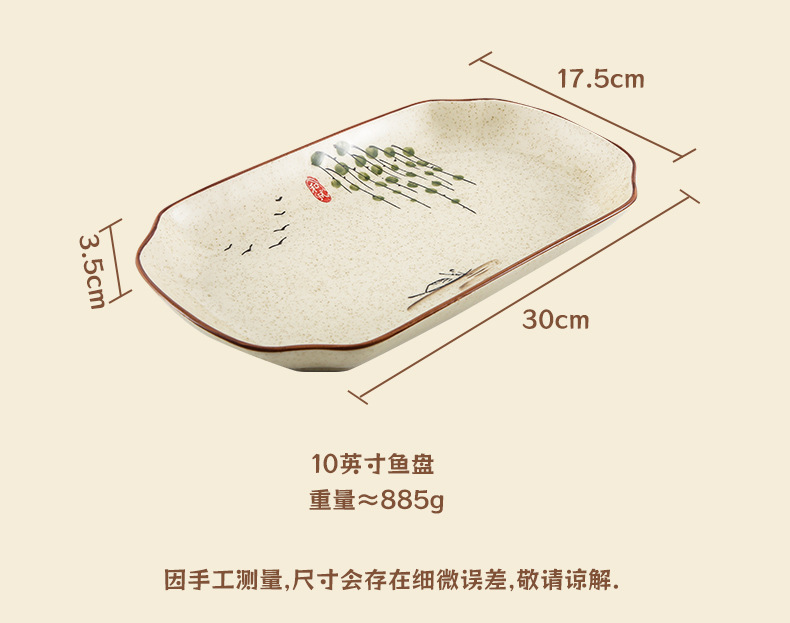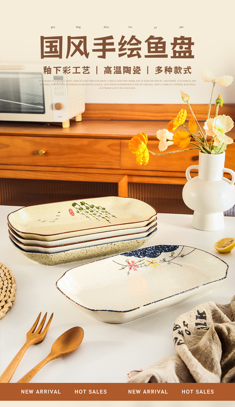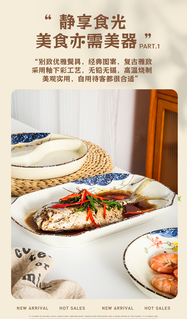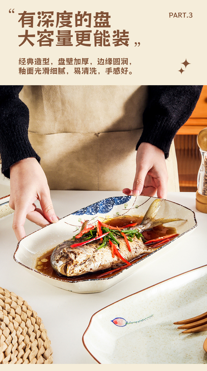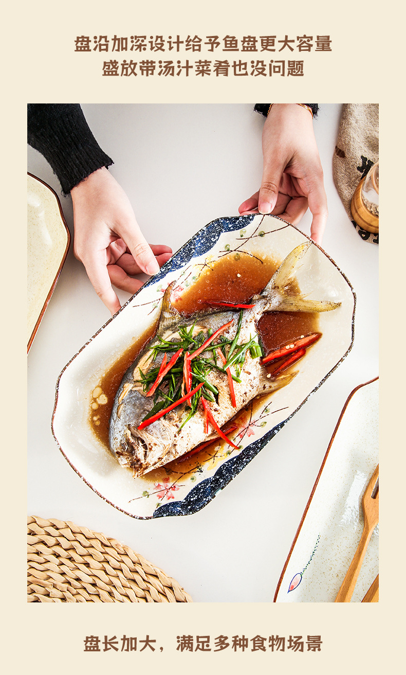 【出口陶瓷鱼盘】中式大号陶瓷鱼盘家用厨房长方形蒸鱼深盘餐厅饭店釉下彩餐具菜盘