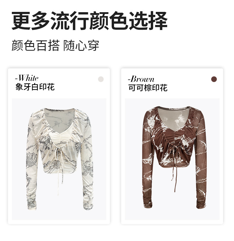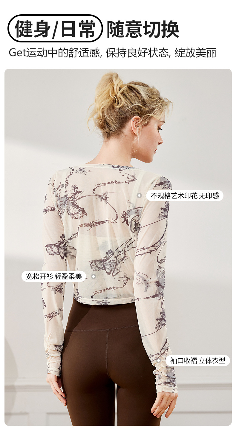 加工定制两件套女网纱水墨印花长袖健身罩衫褶皱绑带防晒瑜伽套装 商品图7