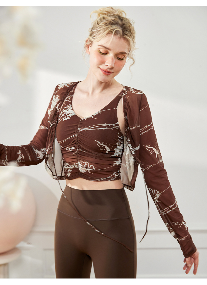 加工定制两件套女网纱水墨印花长袖健身罩衫褶皱绑带防晒瑜伽套装