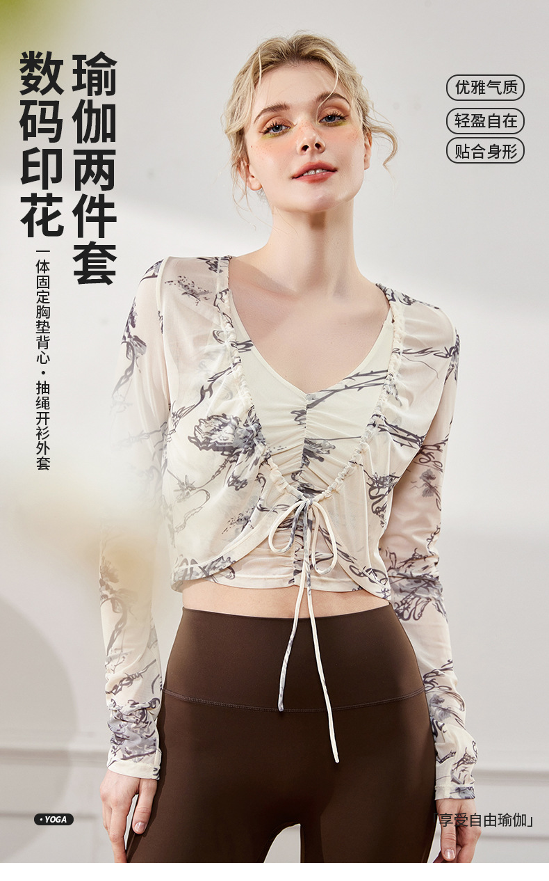 加工定制两件套女网纱水墨印花长袖健身罩衫褶皱绑带防晒瑜伽套装 商品图0