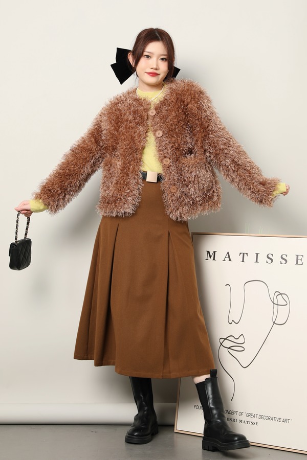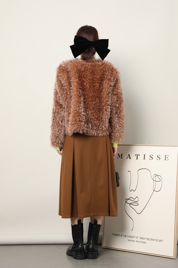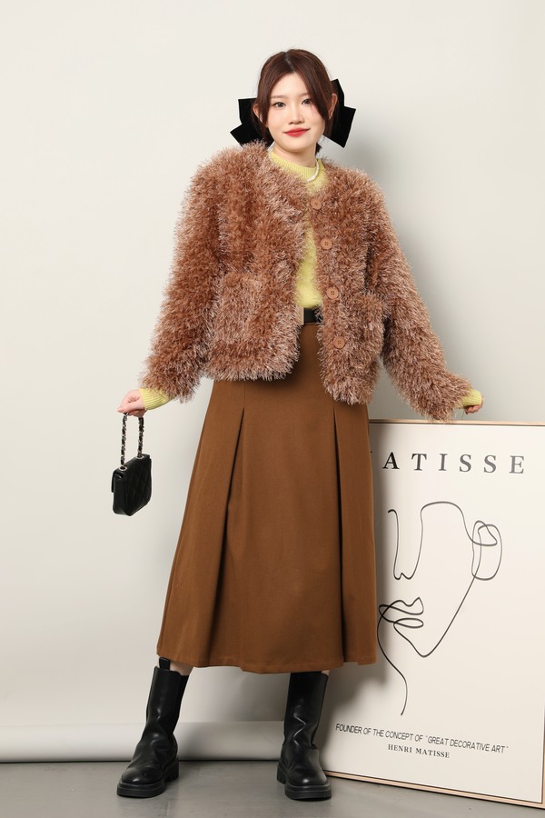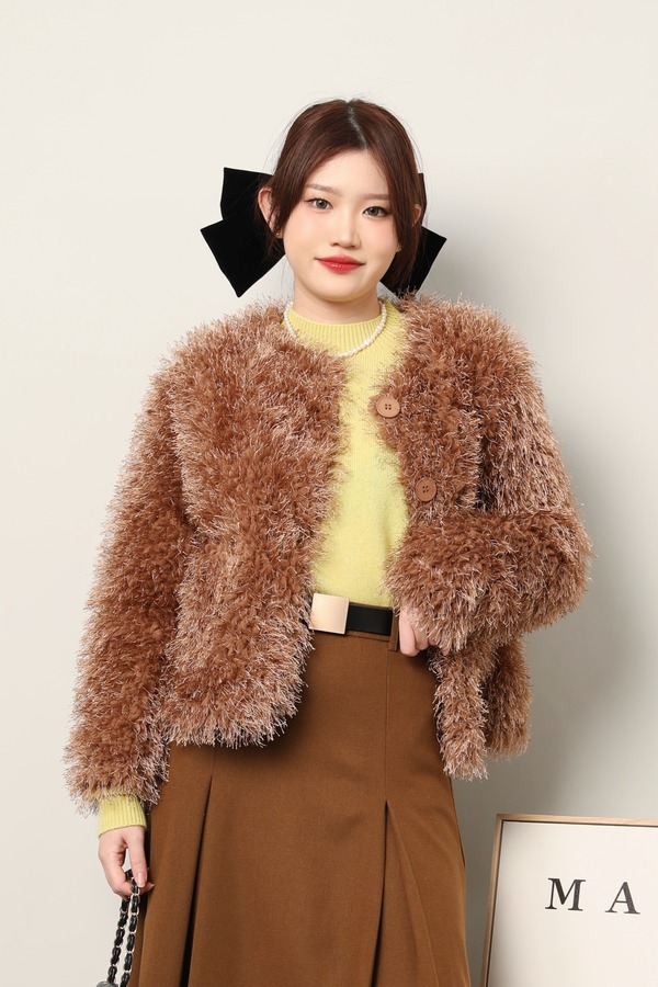 L.Fleuri 个性时髦款咖色毛绒无领外套 17698