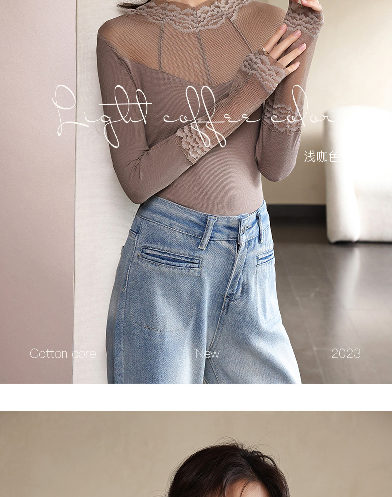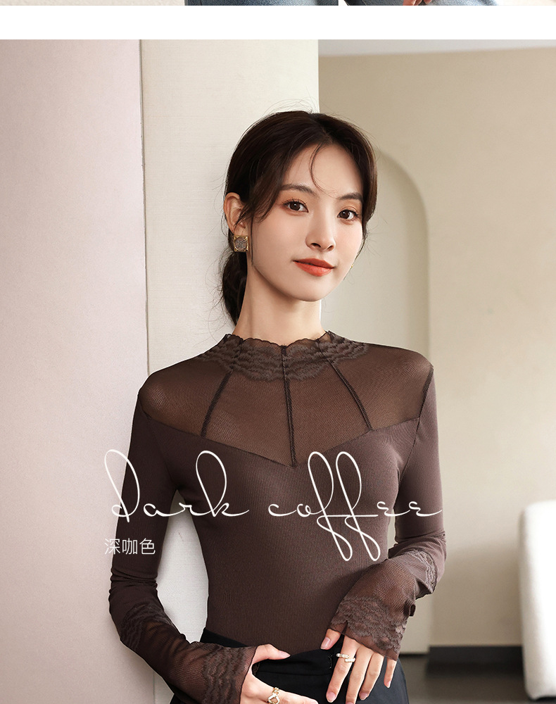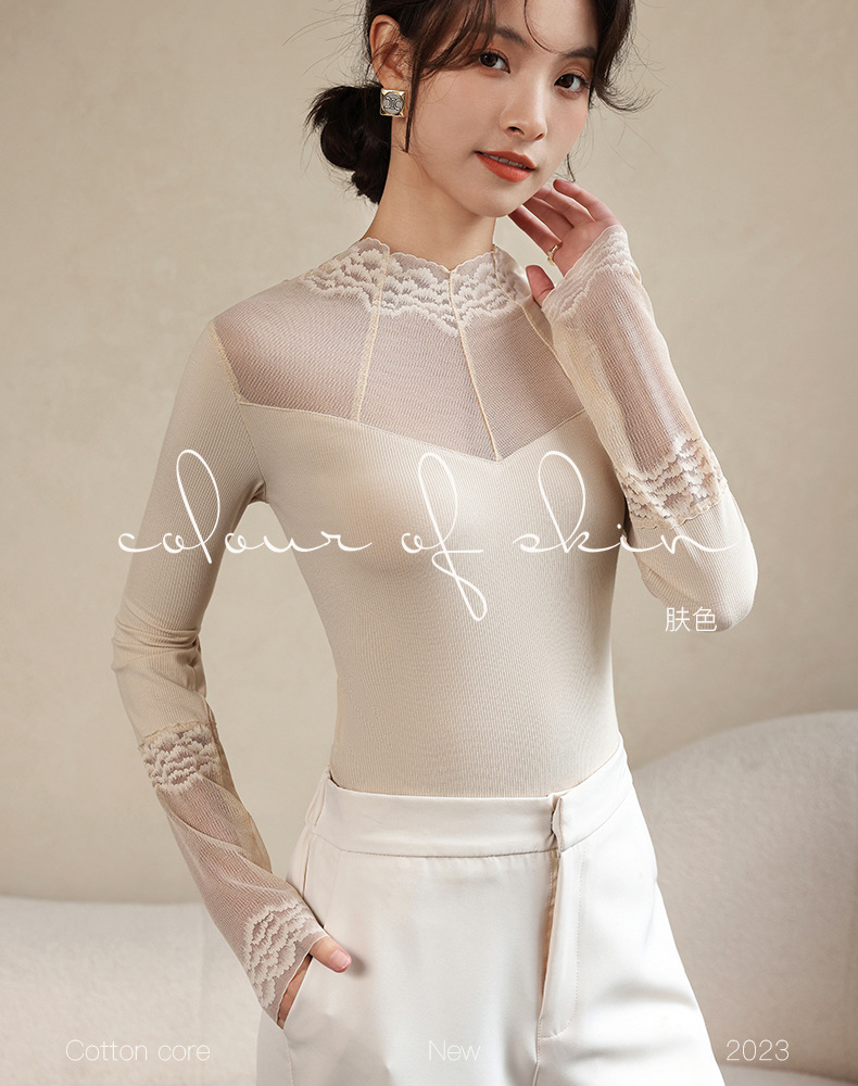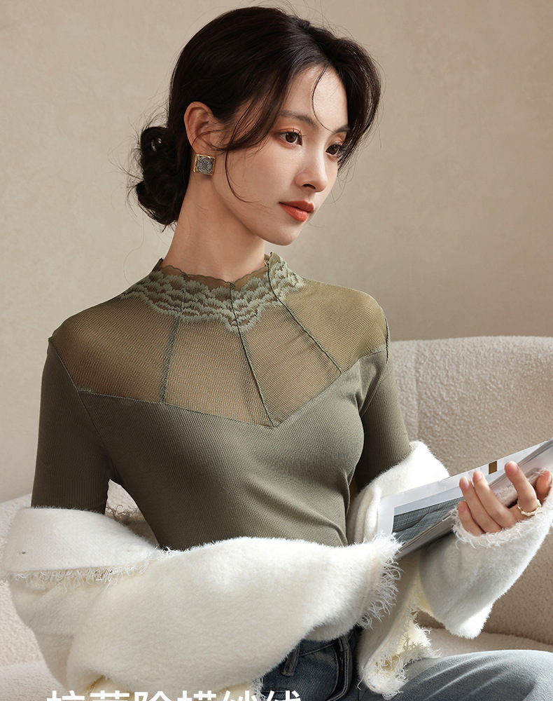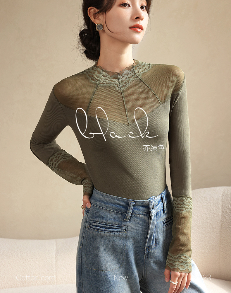 2024秋冬新款网纱蕾丝女洋气长袖半高领上衣半高领叠穿内搭打底衫
