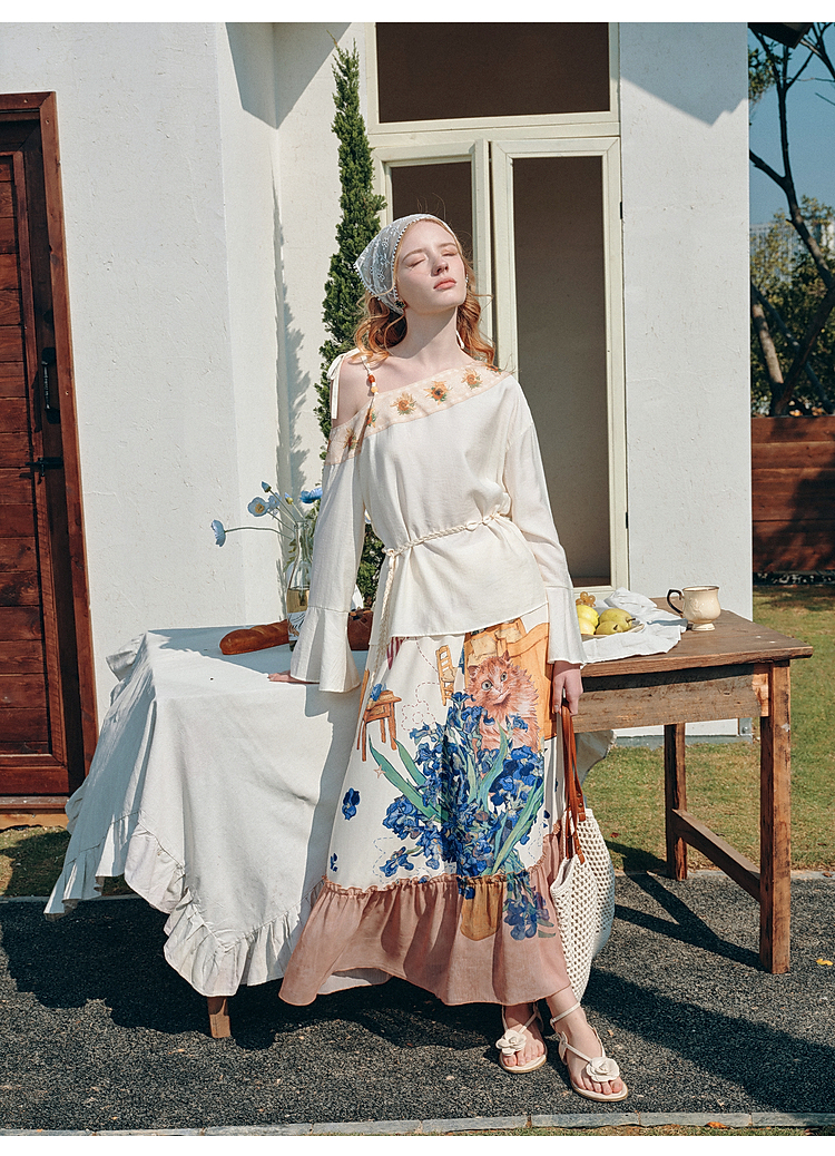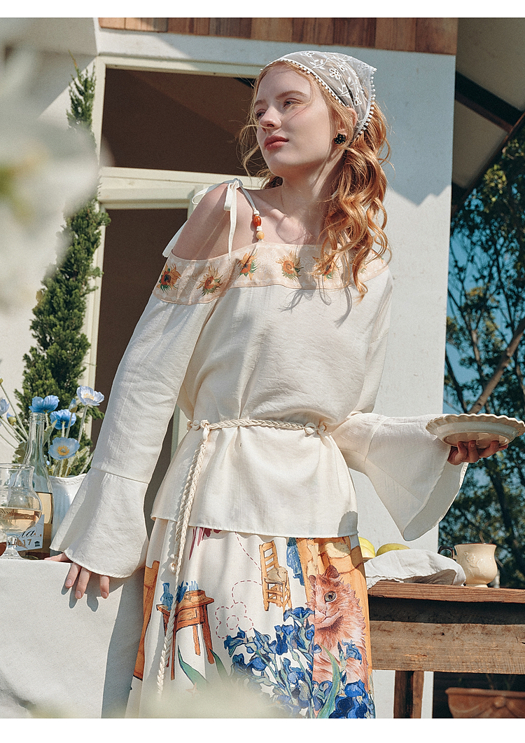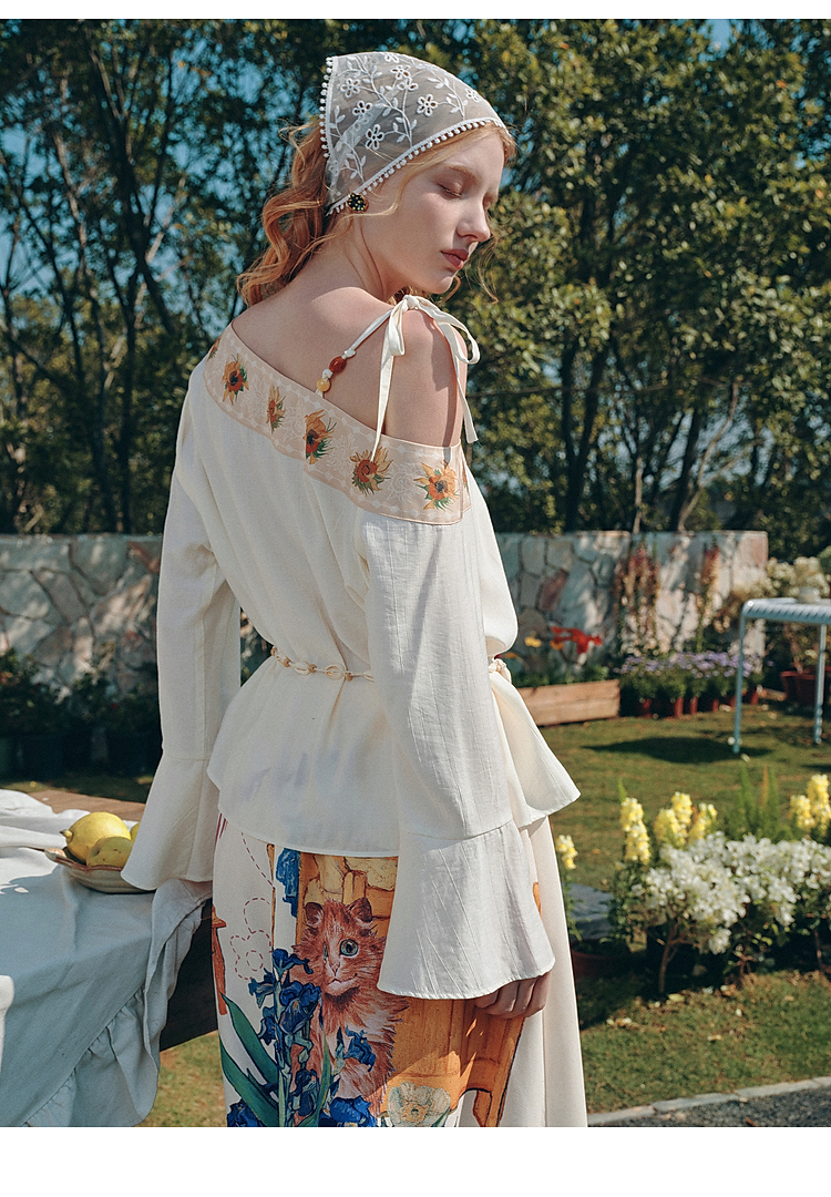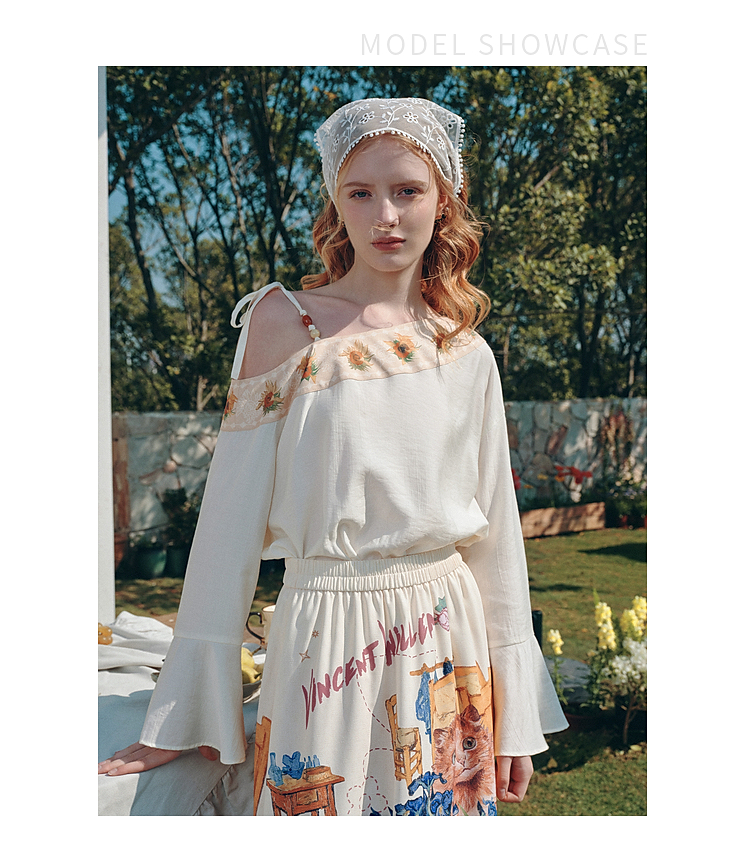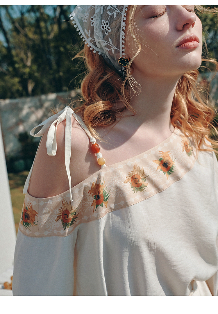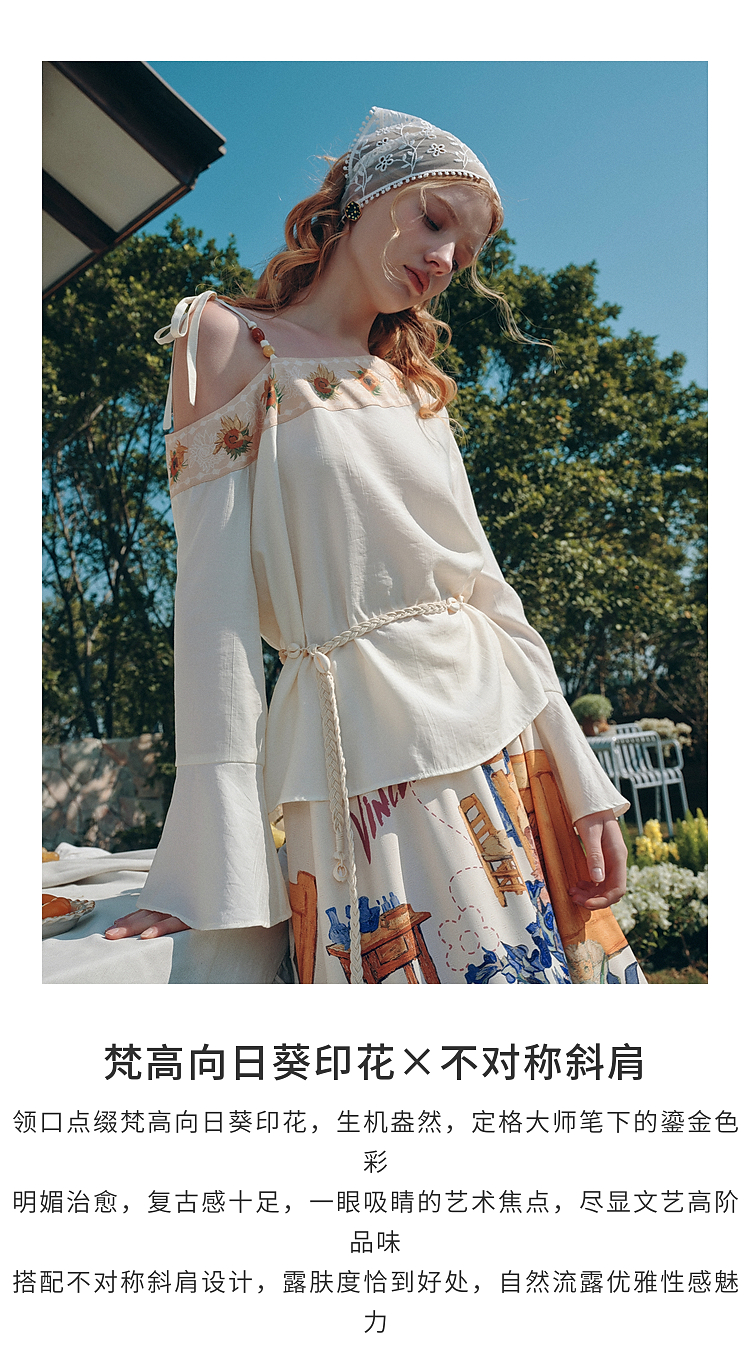 两三事梵高文艺 浅叙时分 2026夏季新款温柔风印花单边露肩衬衫女
