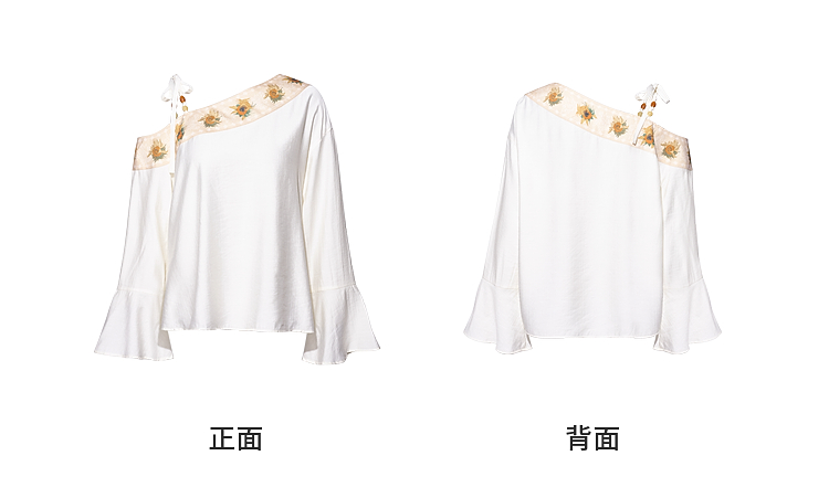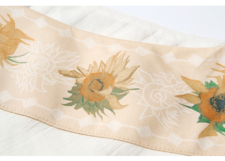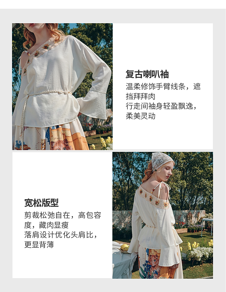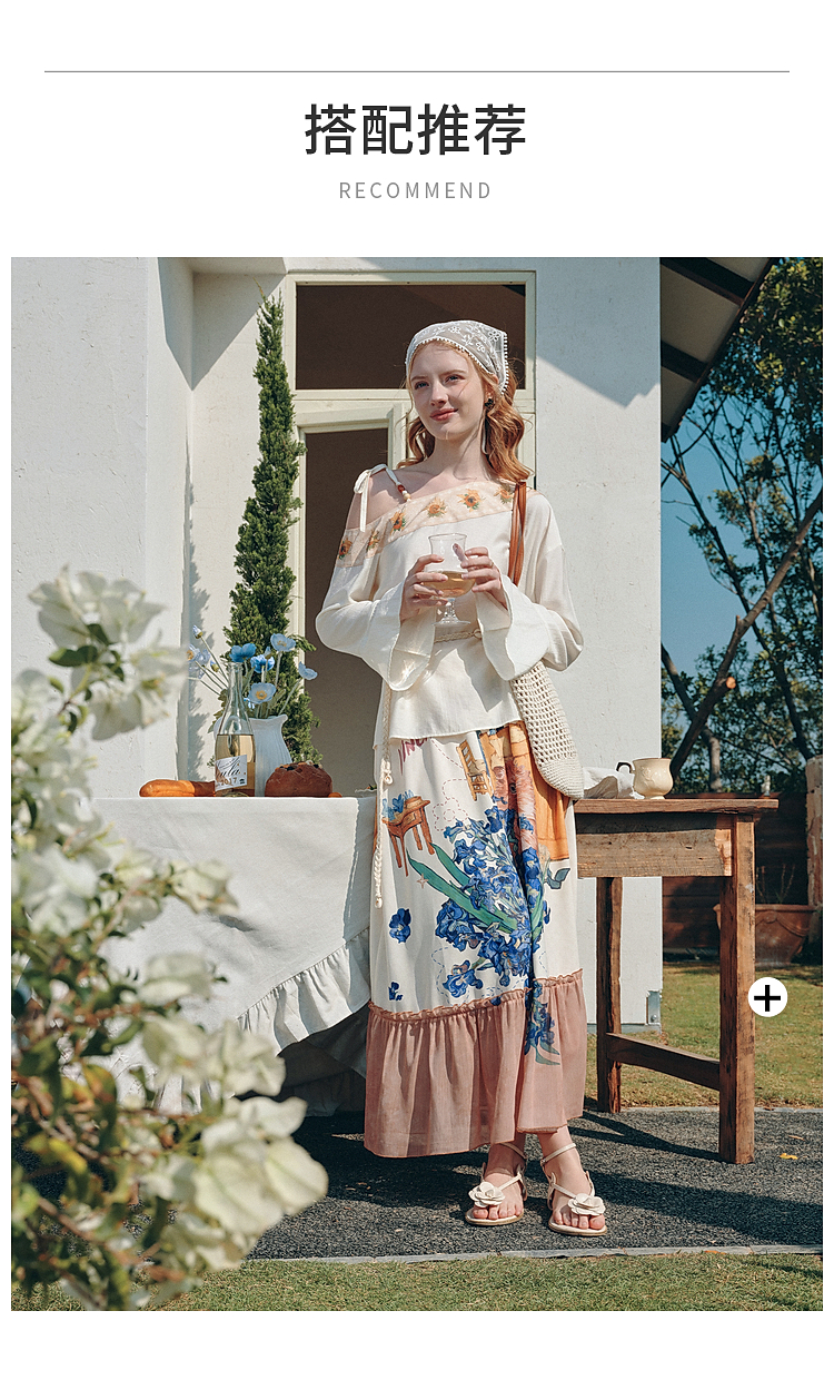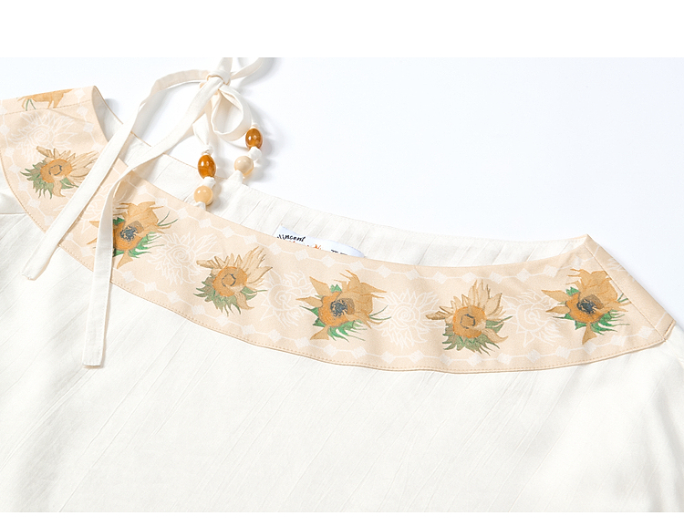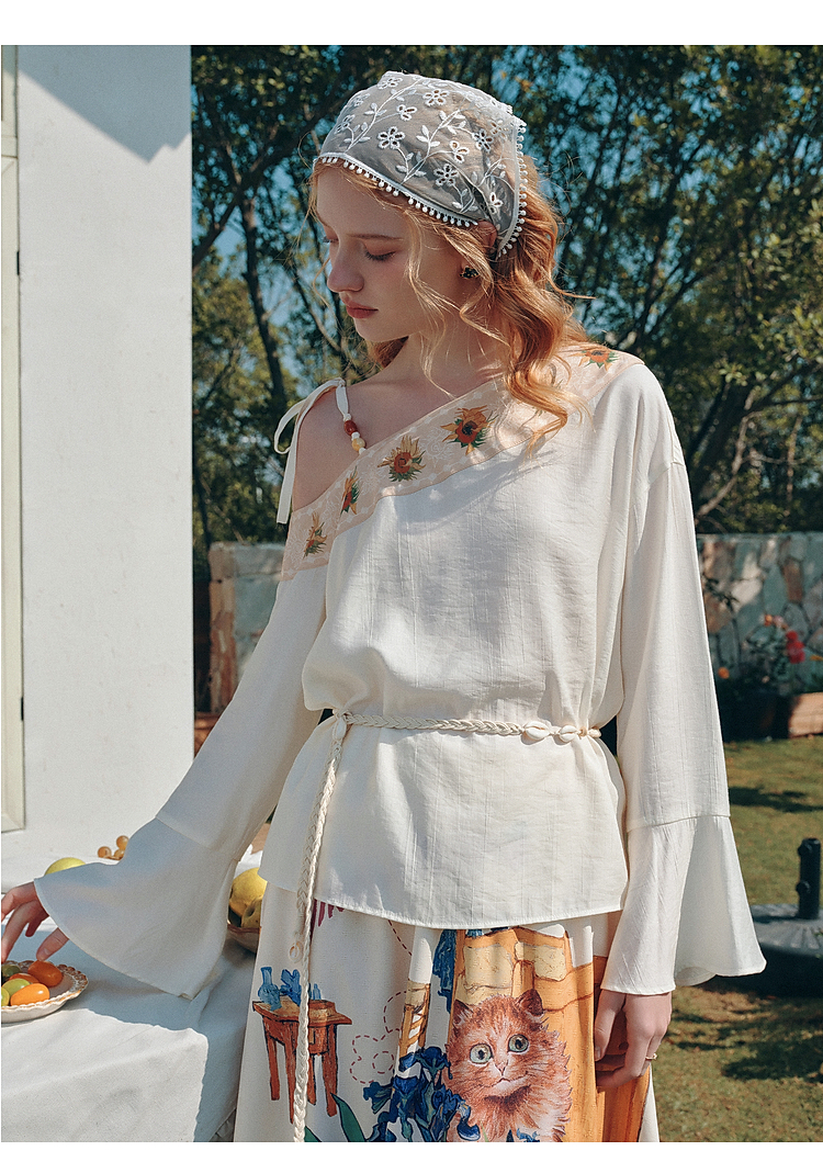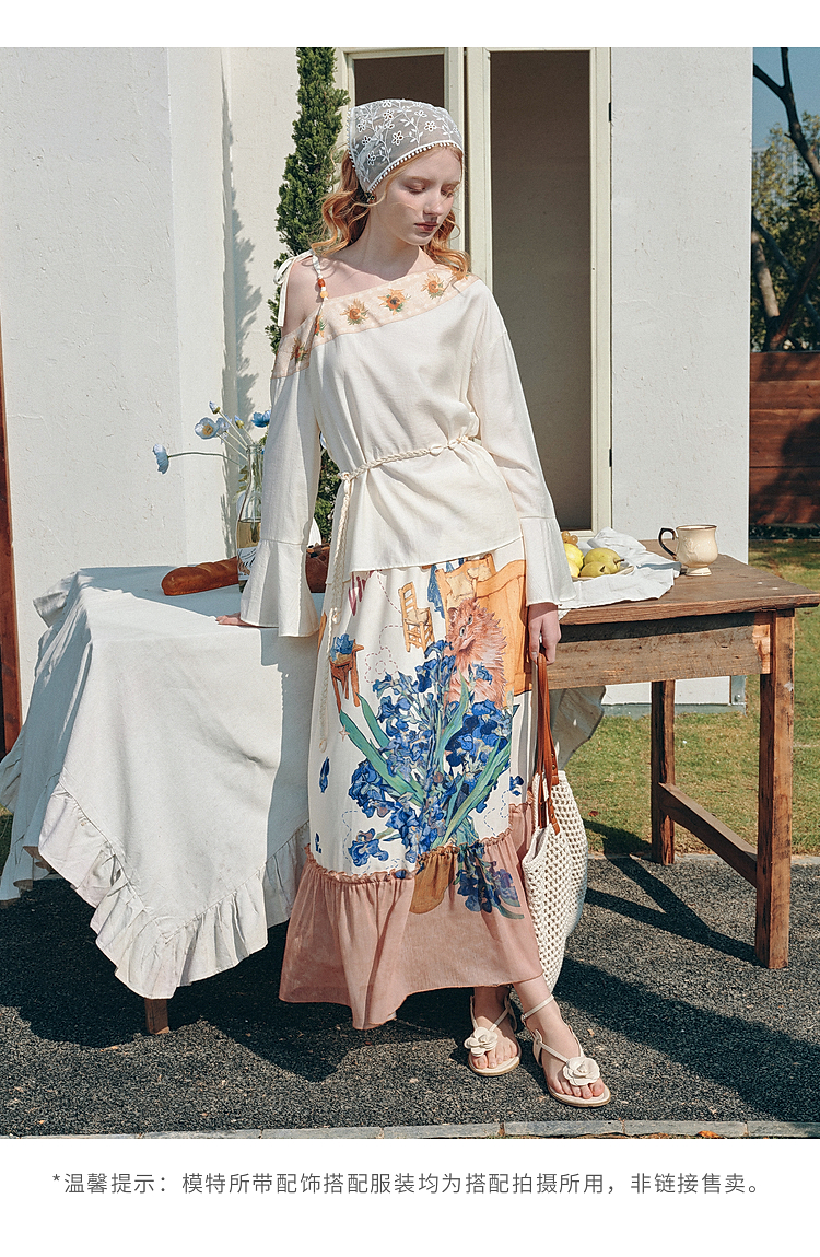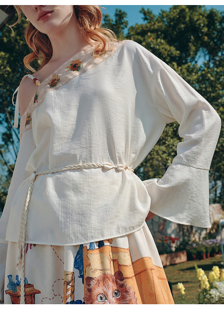 两三事梵高文艺 浅叙时分 2026夏季新款温柔风印花单边露肩衬衫女