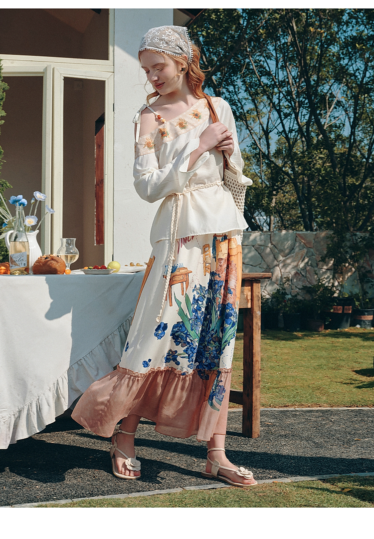 两三事梵高文艺 花屿捕梦 2025夏季新款拼布印花荷叶边吊带连衣裙