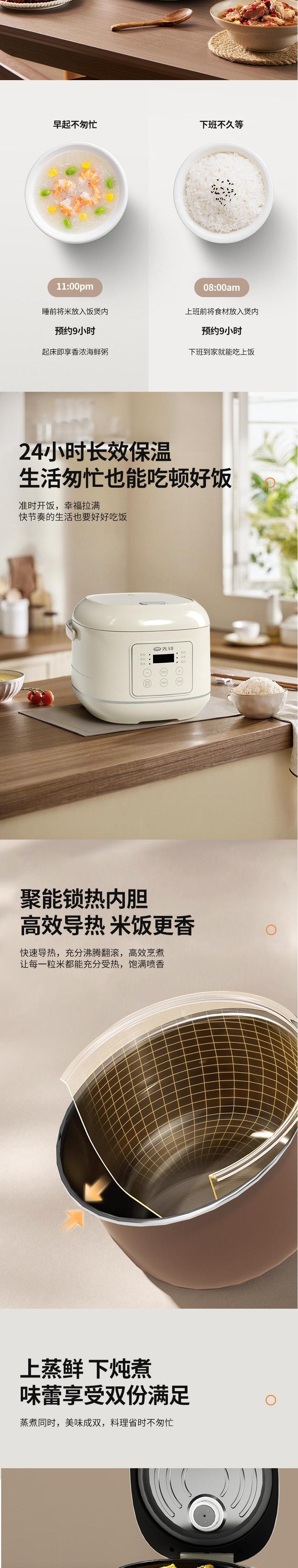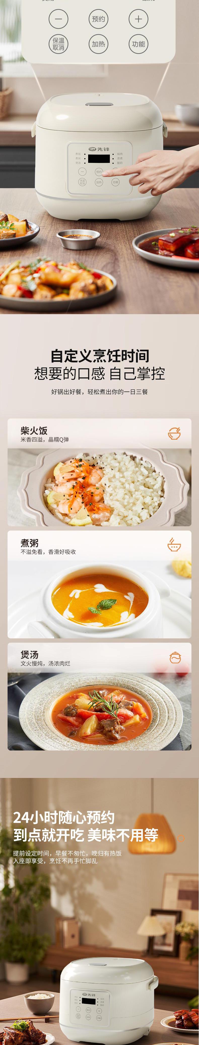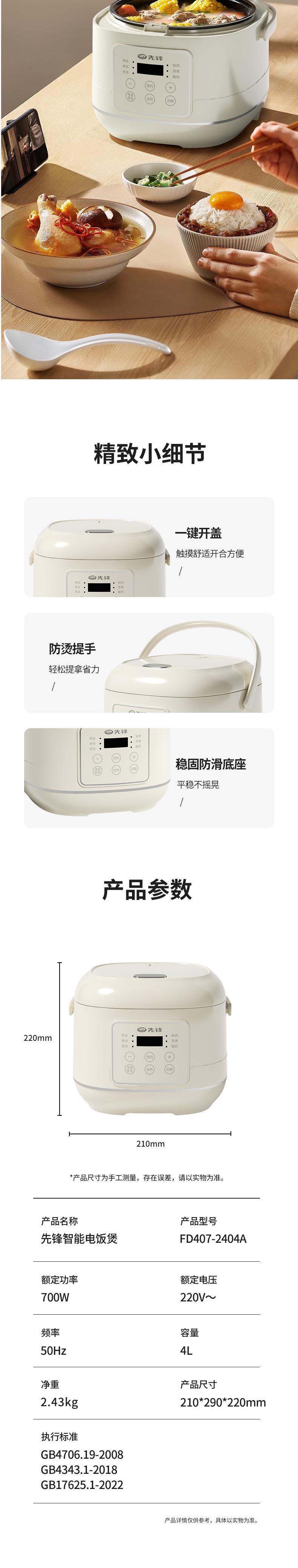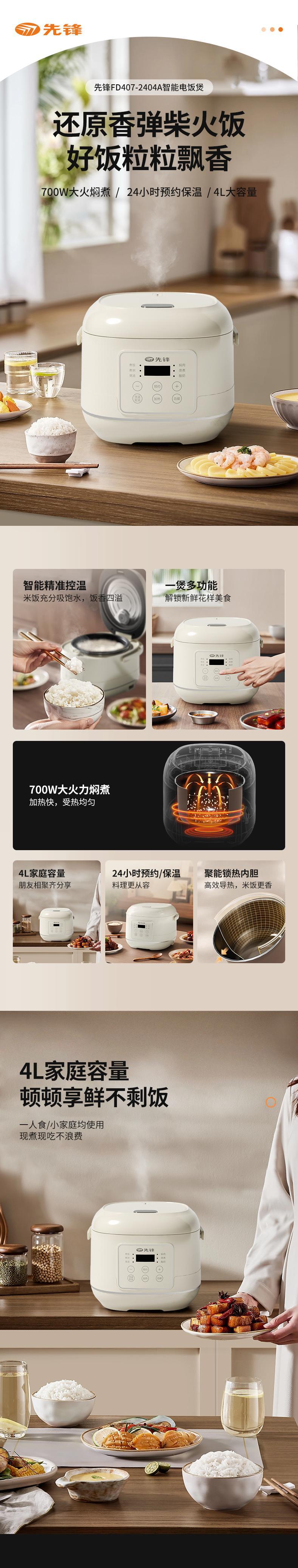 【自营】先锋FD407-2404A智能电饭煲4L电饭锅预约微压柴火饭快煮不粘锅