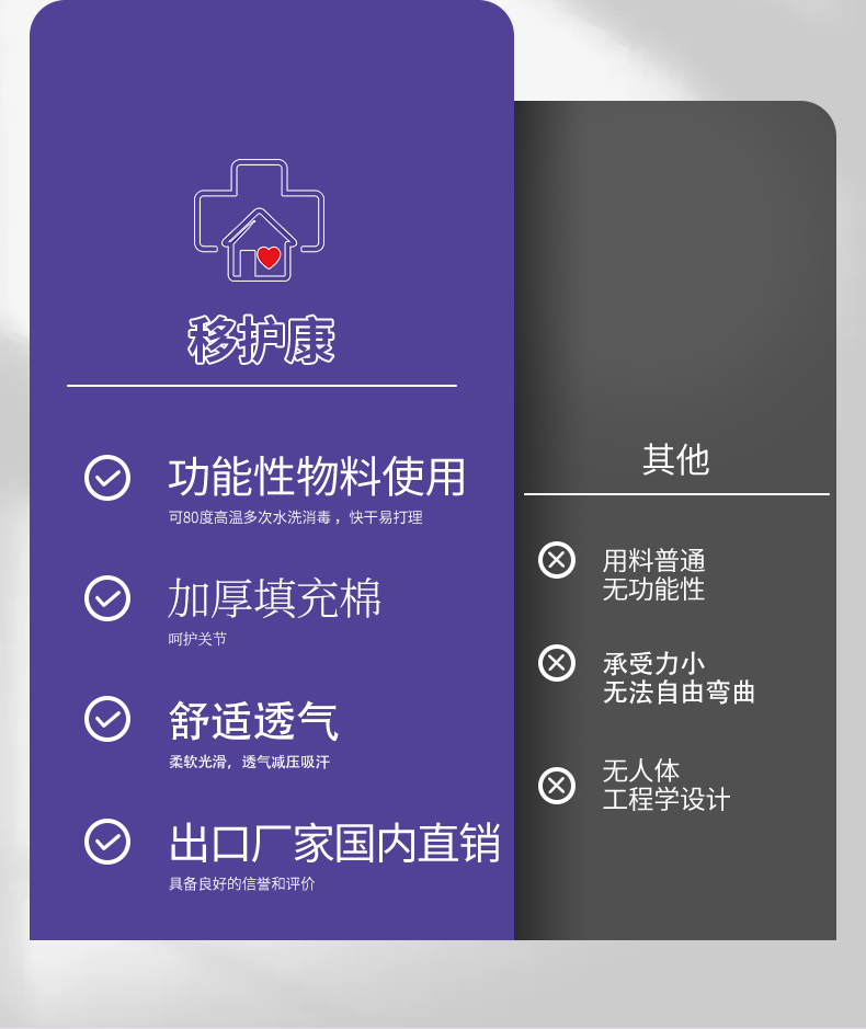 移护康养老用品生产厂家,旗下品牌:移互康专业销售老人转移及日常护理系列产品,包括移位机吊具,转移床垫,防褥疮脚套 ,防抓伤手套,扶抱腰带,长者餐具等产品 。