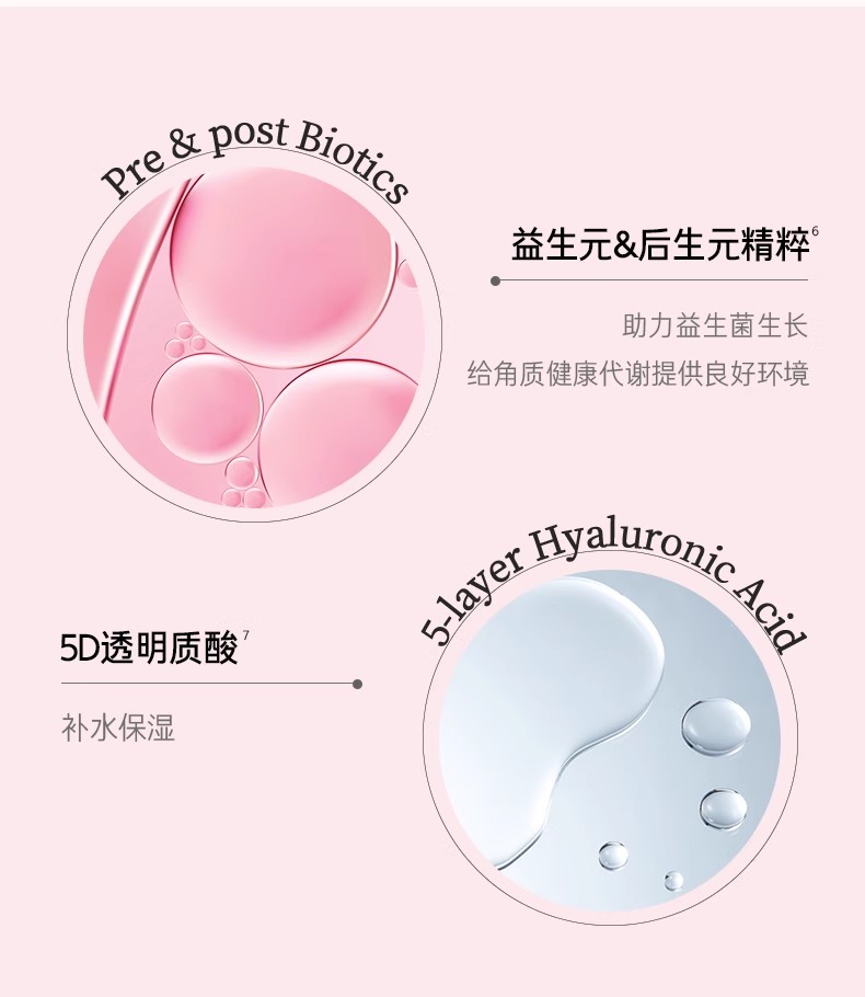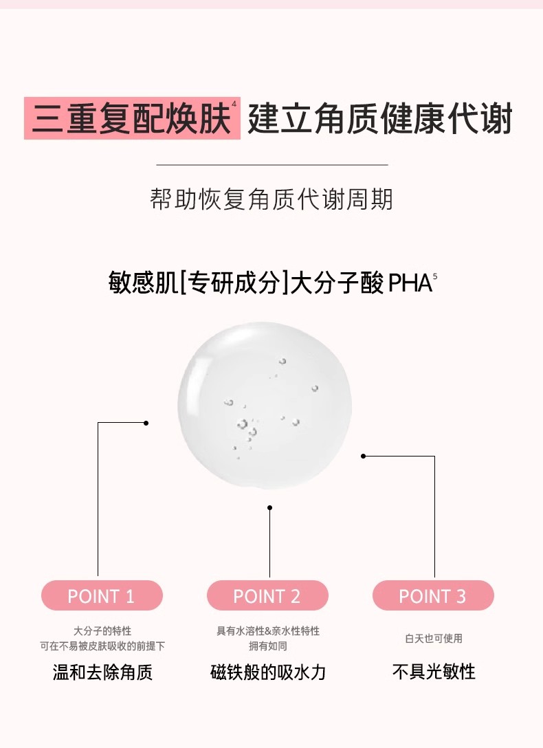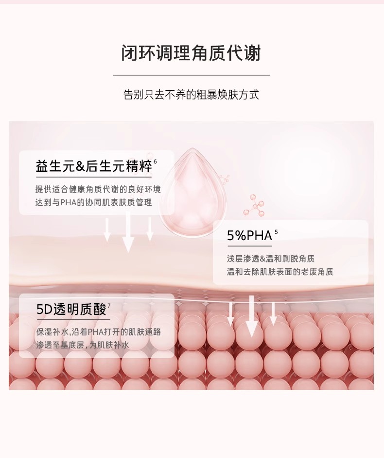 主要成分是5%PHA,浅层渗透&温和剥脱角质,温和去除肌肤表面的老废角质,5D透明质酸,补水保湿,益生元&后生元精粹,助力益生菌生长,给角质健康代谢提供良好环境