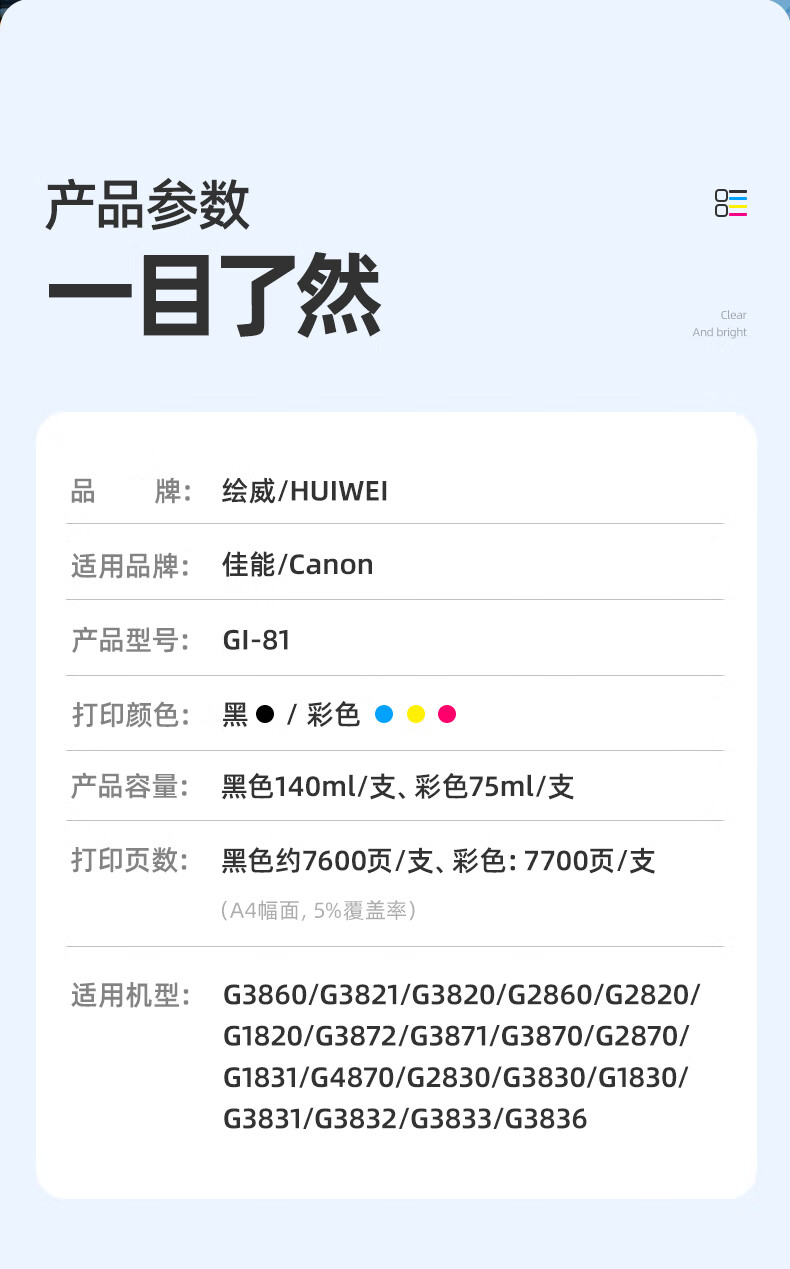 绘威GI-81墨水 适用佳能G1820 G2820 G3820 G3831 G3860 G3871 G1831 G3821 3870 2870 canon连供打印机墨水 四色