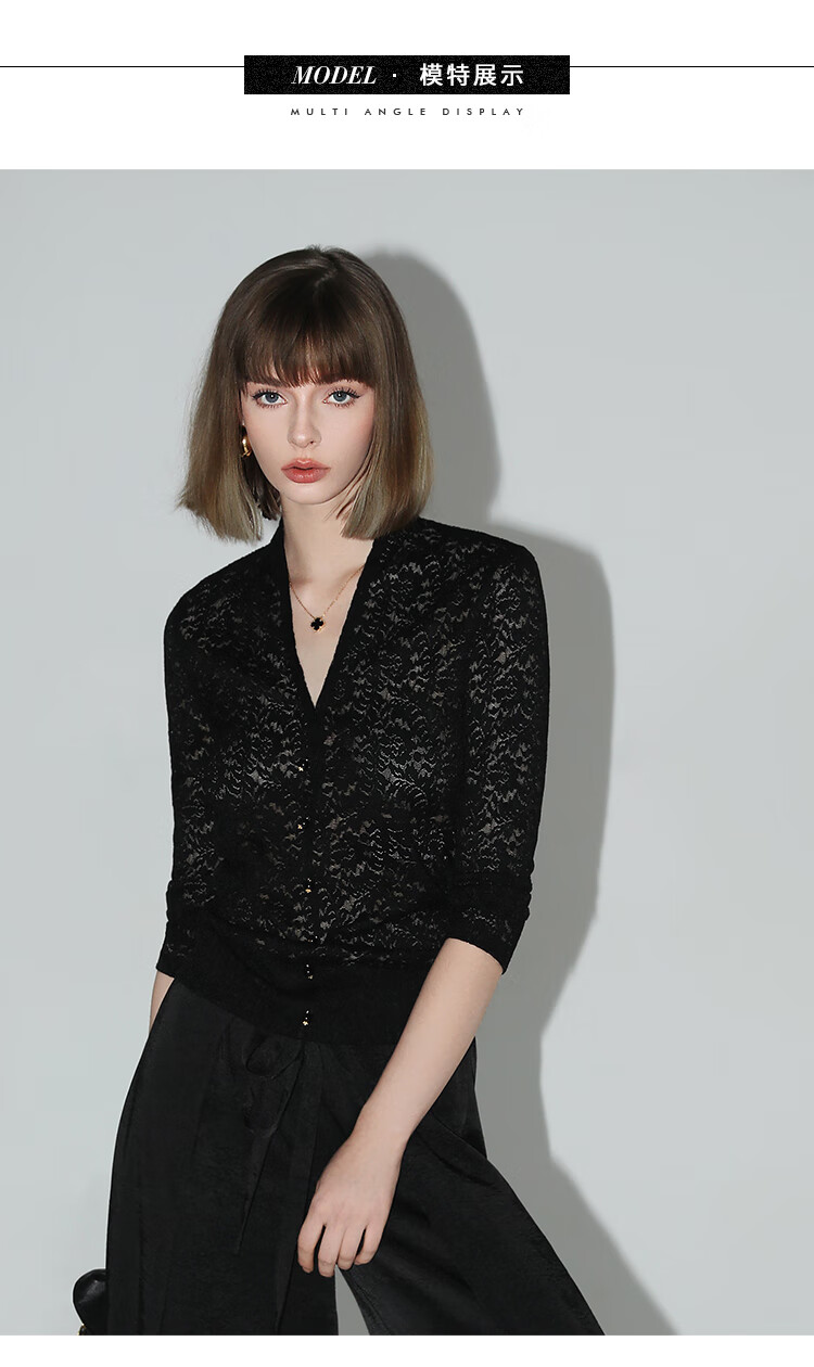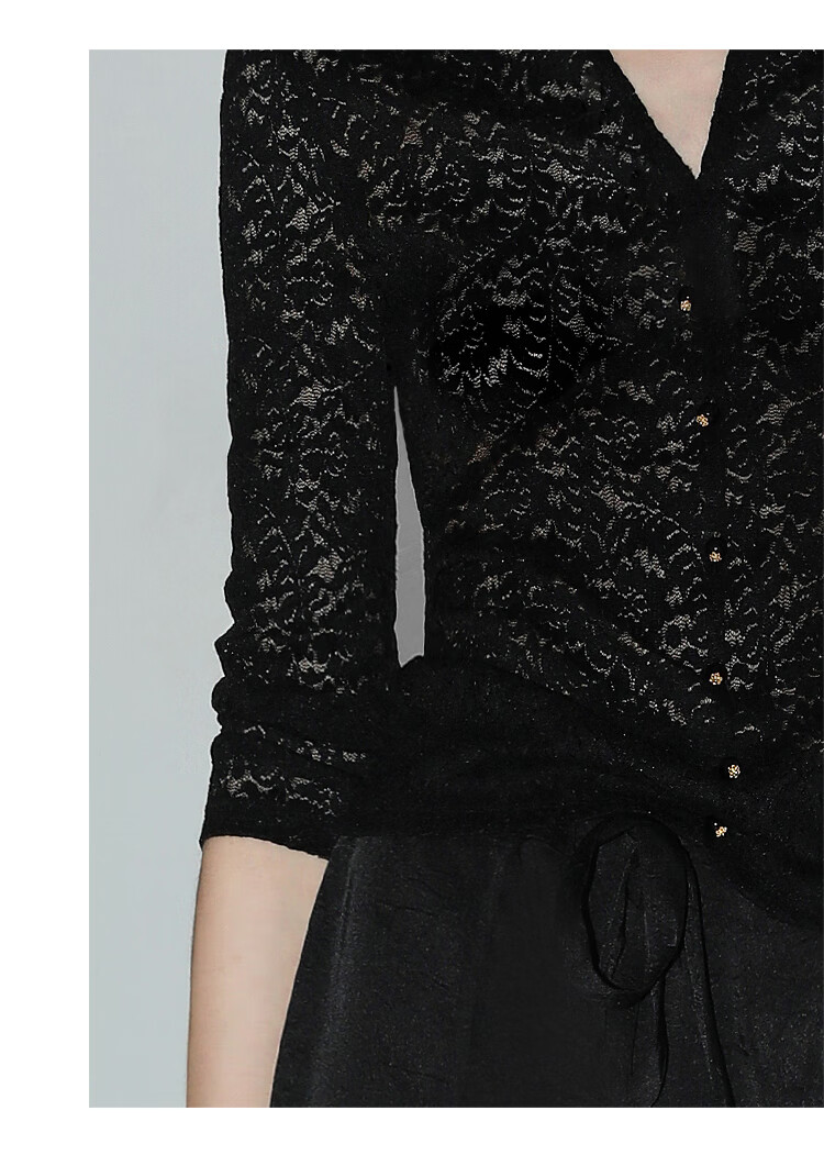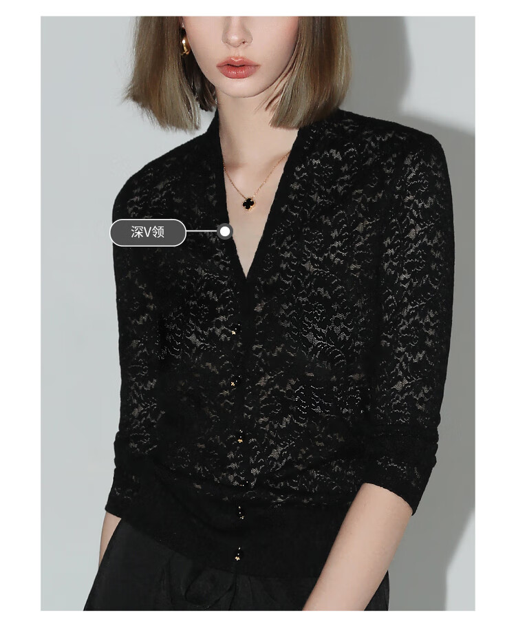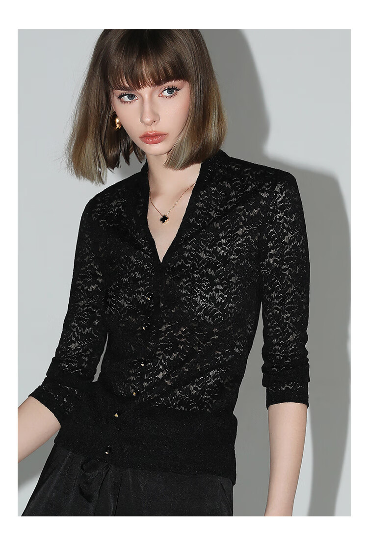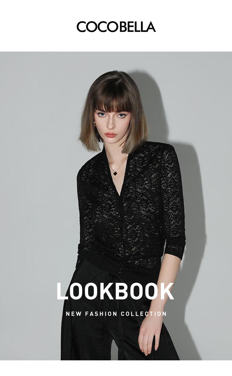 COCOBELLA优雅微透视镂空蕾丝衬衫女深V领长袖针织衫NLC55B