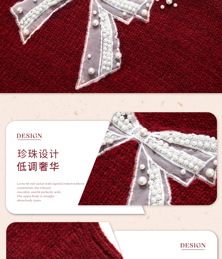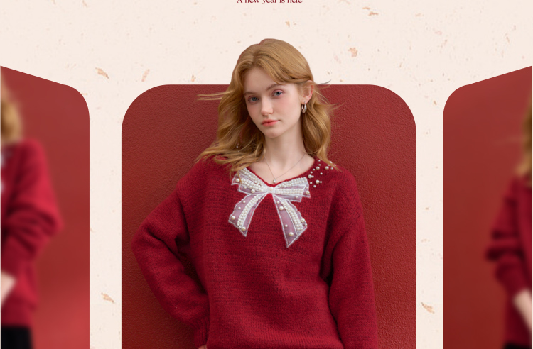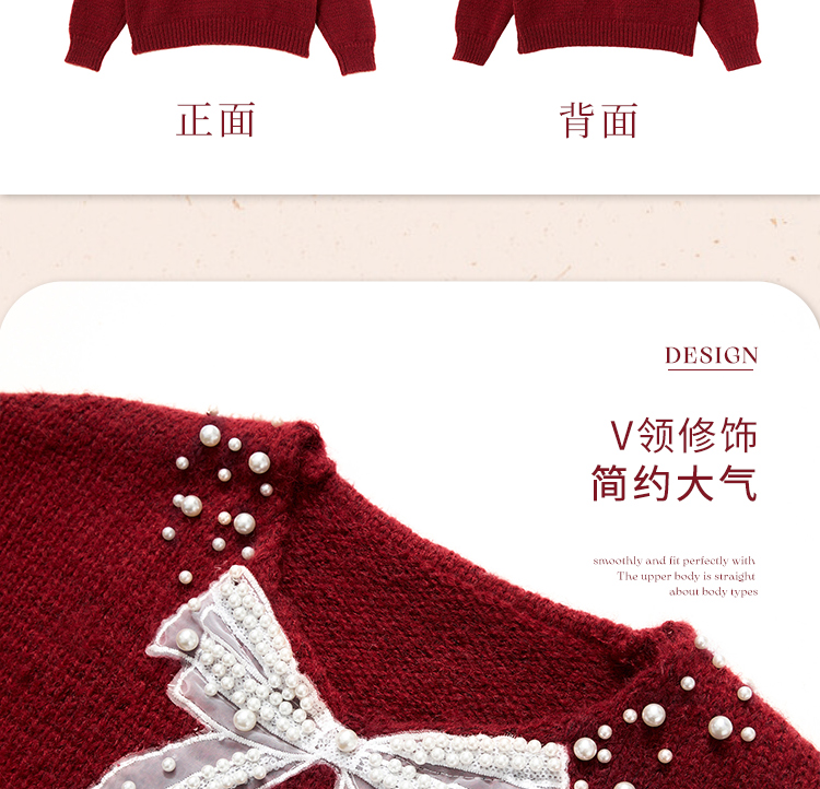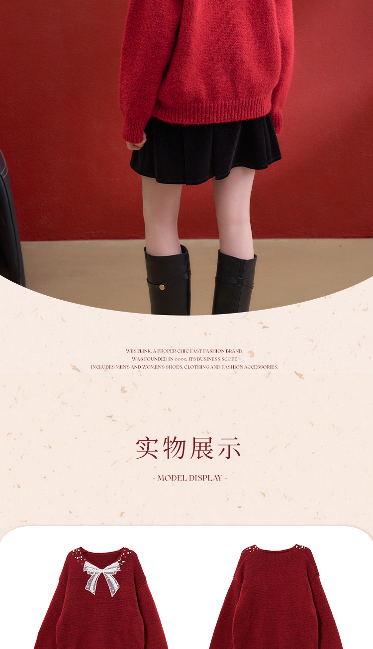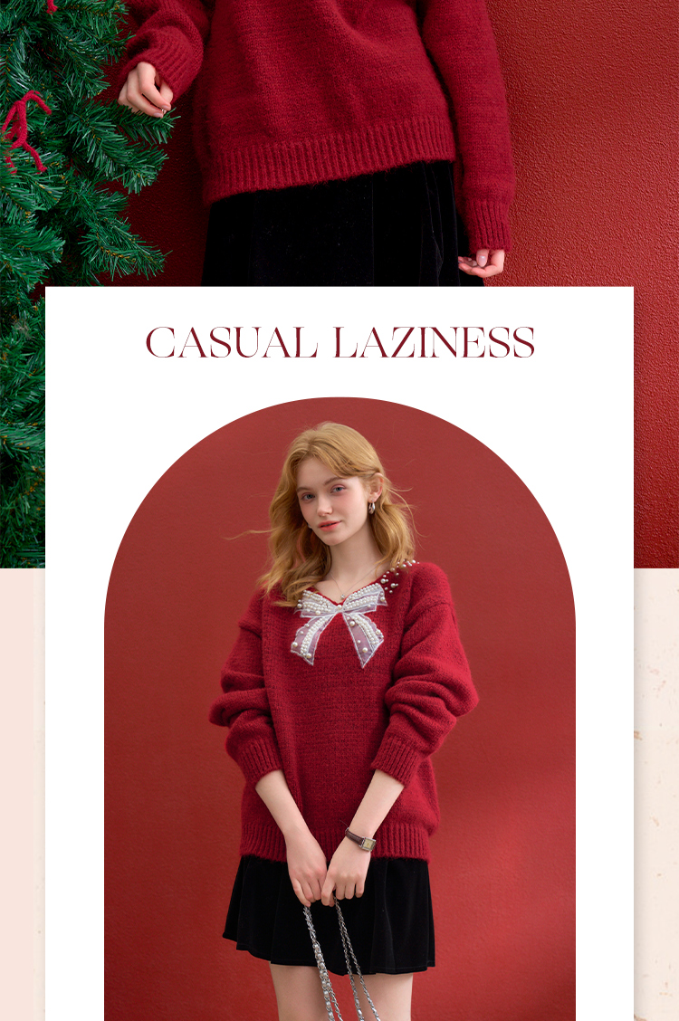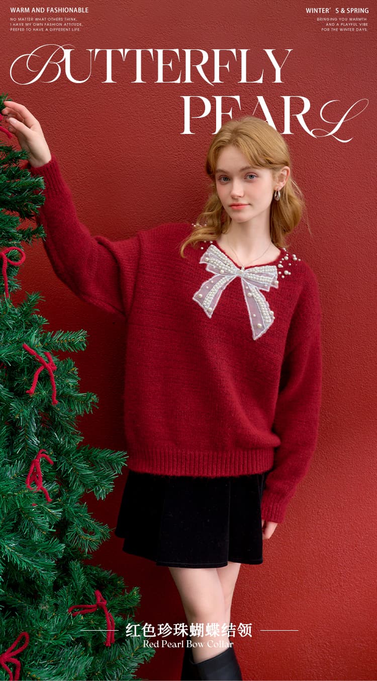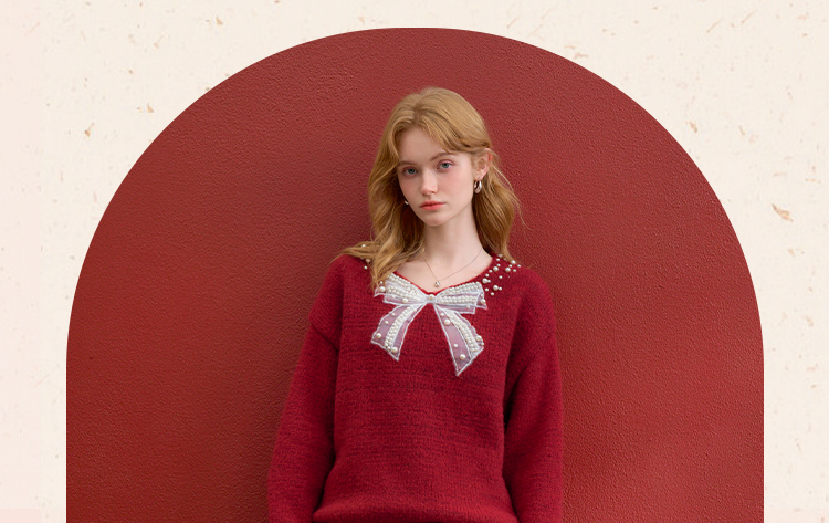 西遇钉珠蝴蝶结红色毛衣女冬季新款V领氛围感套头针织衫H0055333