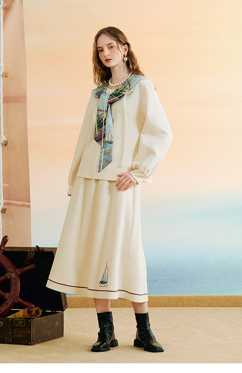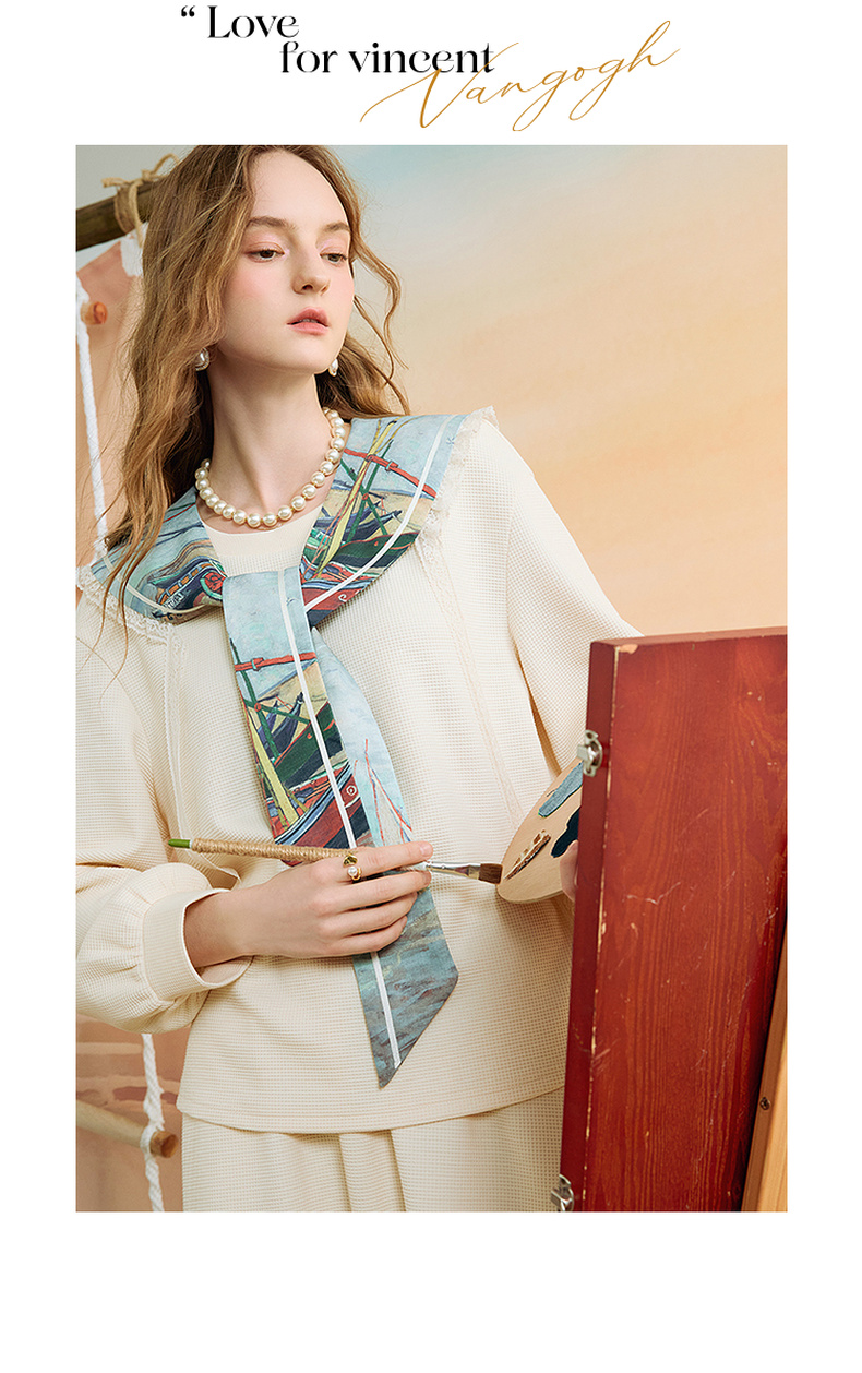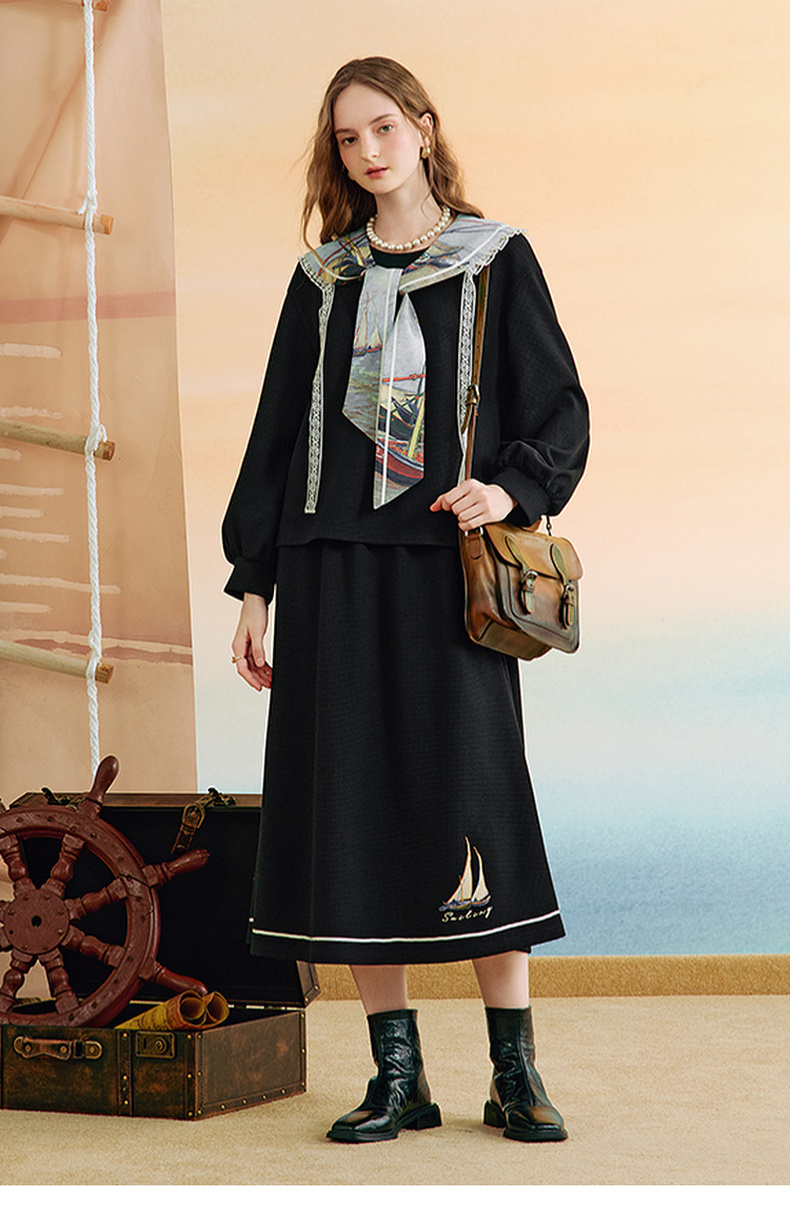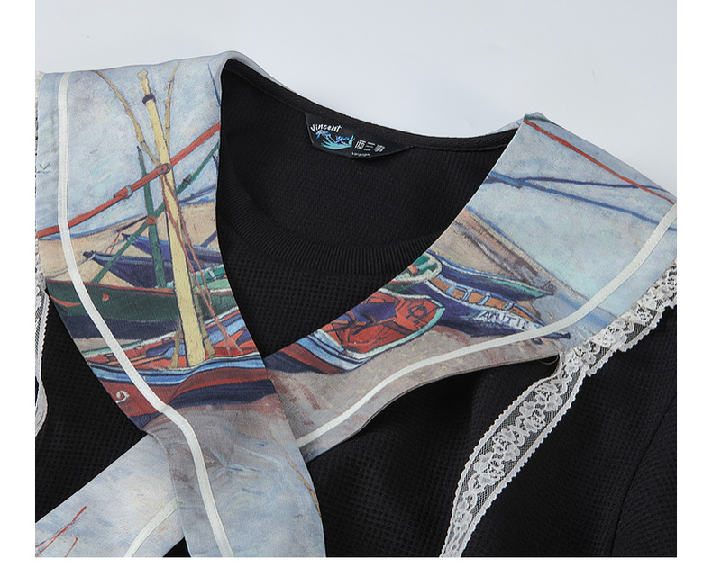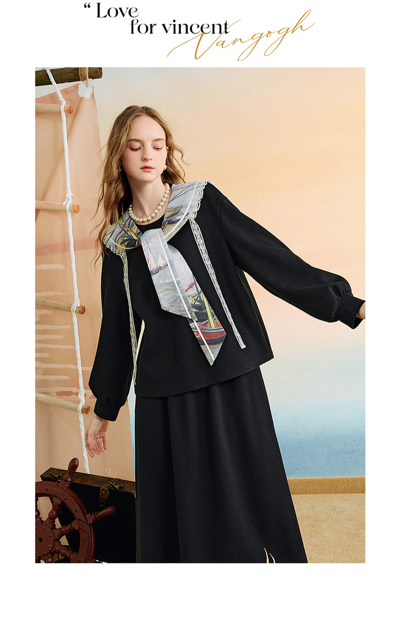 两三事梵高文艺孤帆远航2025秋季新款印花海军领刺绣两件套女套装