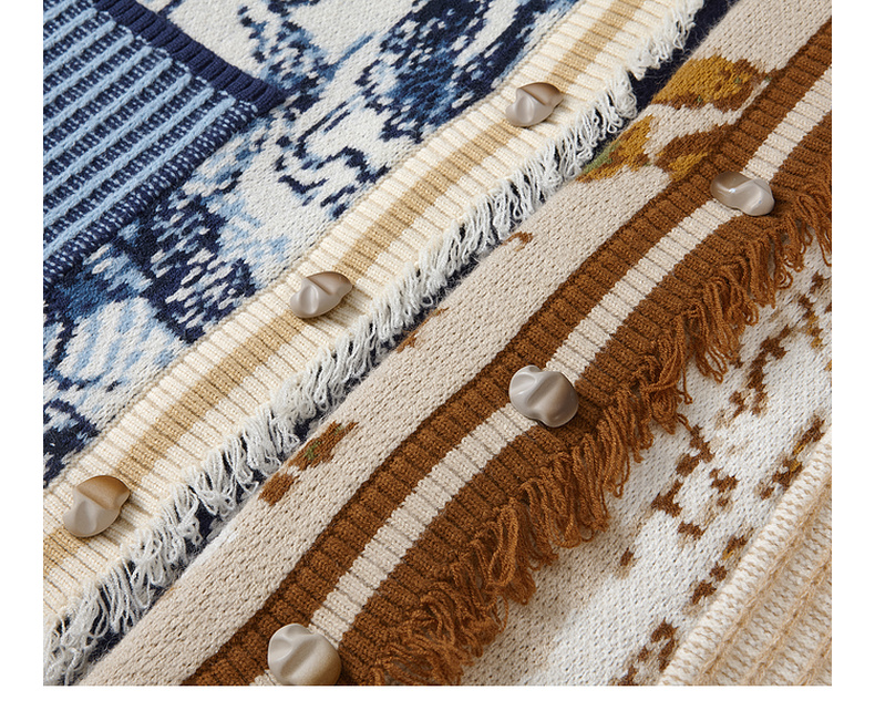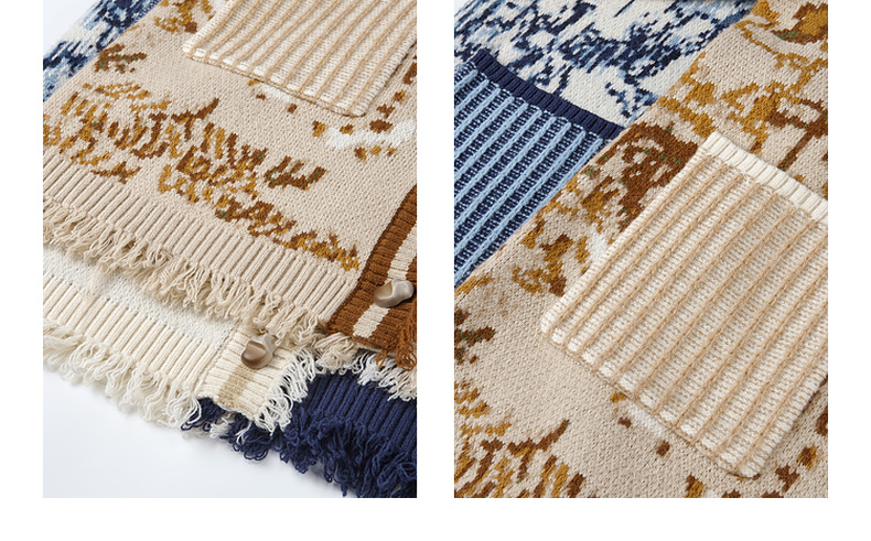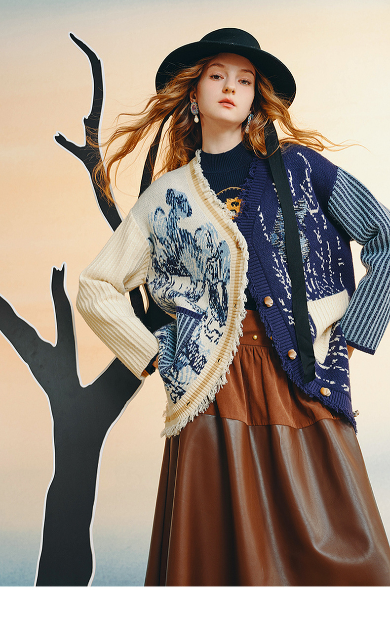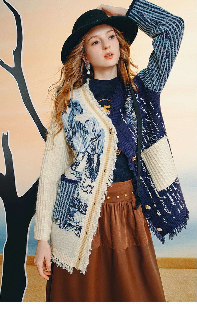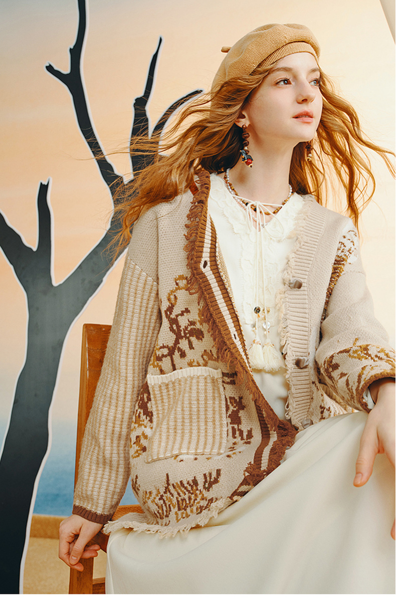 两三事梵高文艺 氤氲初绽 2025秋季新款复古流苏边花色毛衣开衫女
