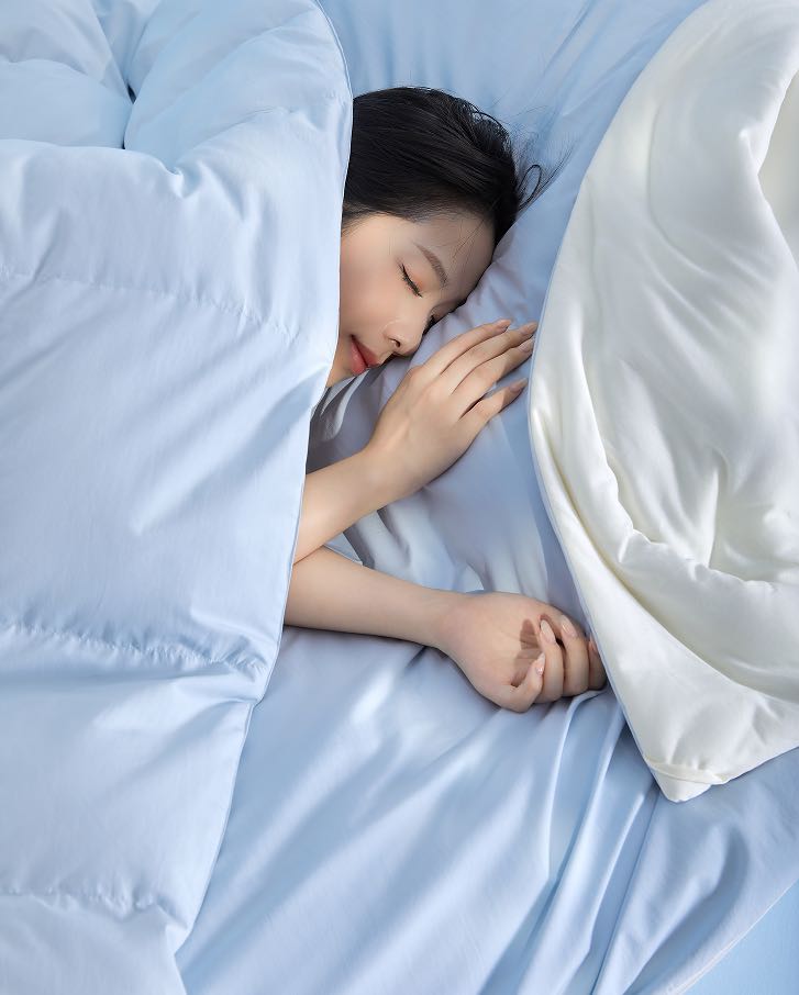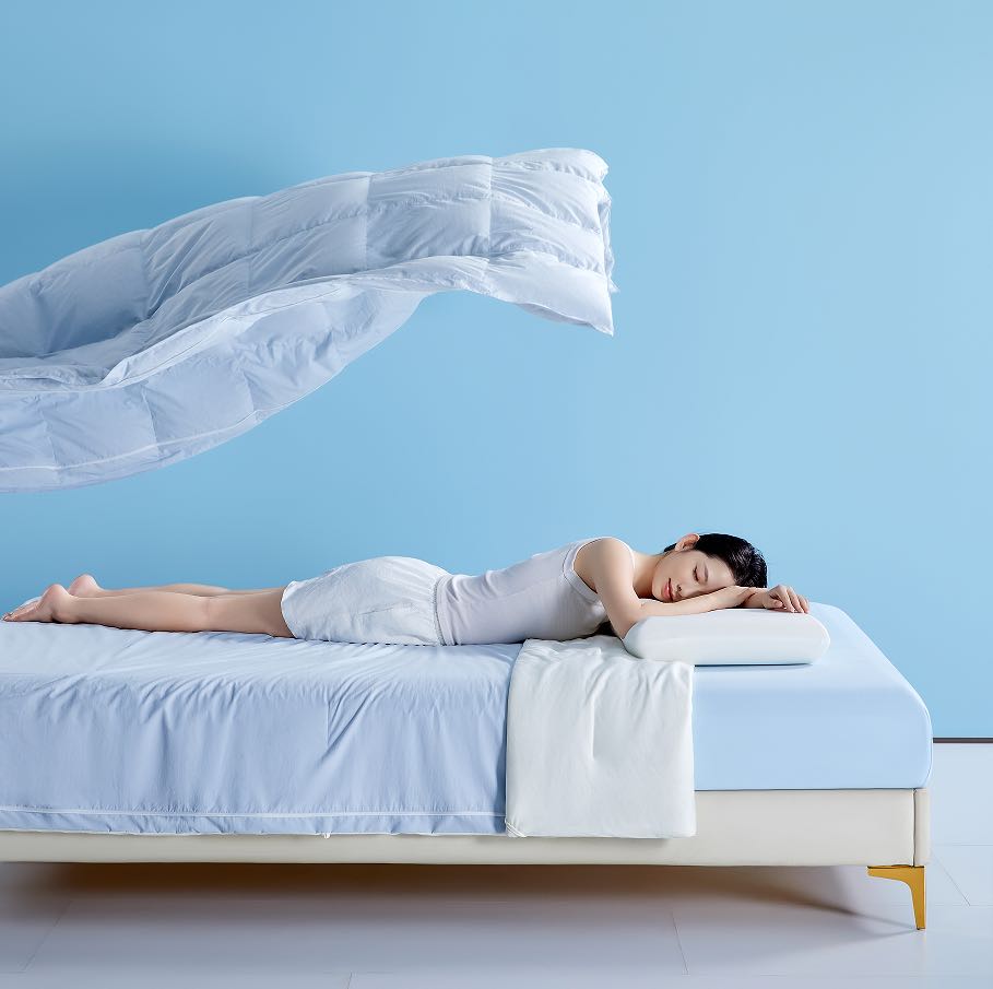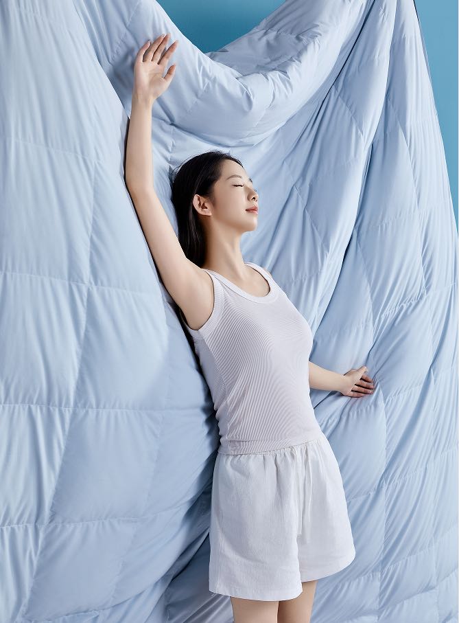 4、解决传统鹅绒被盖在身上不透气燥热的痛点,贴身层使用醋酯纤维填充,排湿控温,做到真正的恒温深睡;