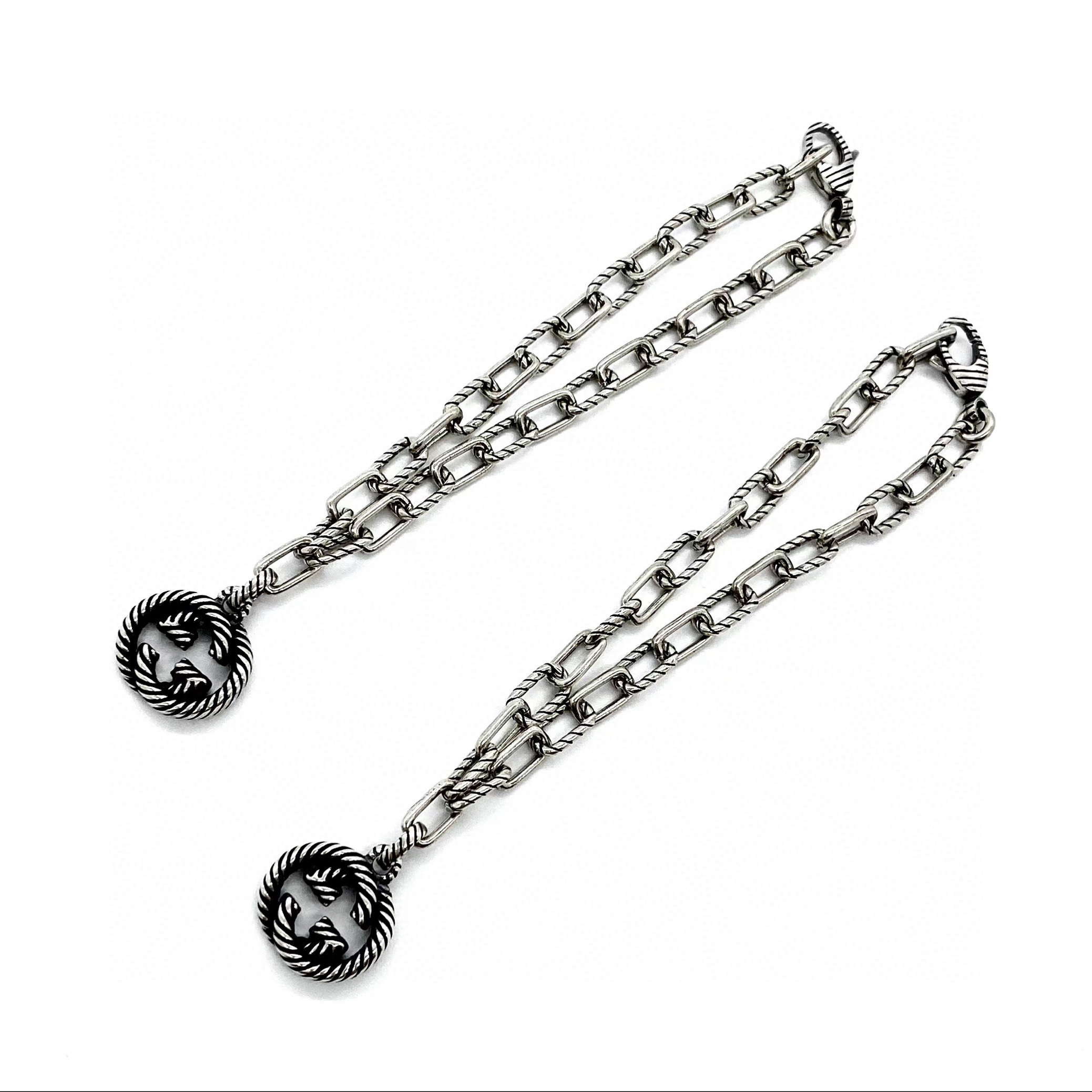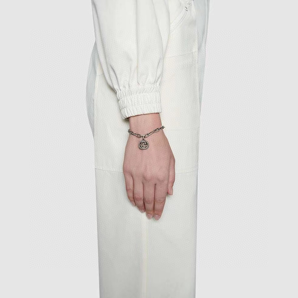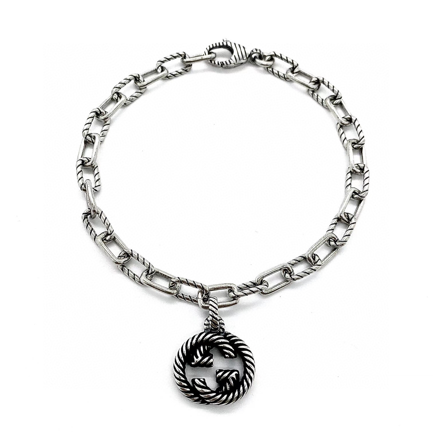 这款手镯采用织纹链节和光滑链节相间的银链设计,演绎现代时尚风范。互扣式双G刻花吊坠在配饰中融入品牌特有的标识形象
