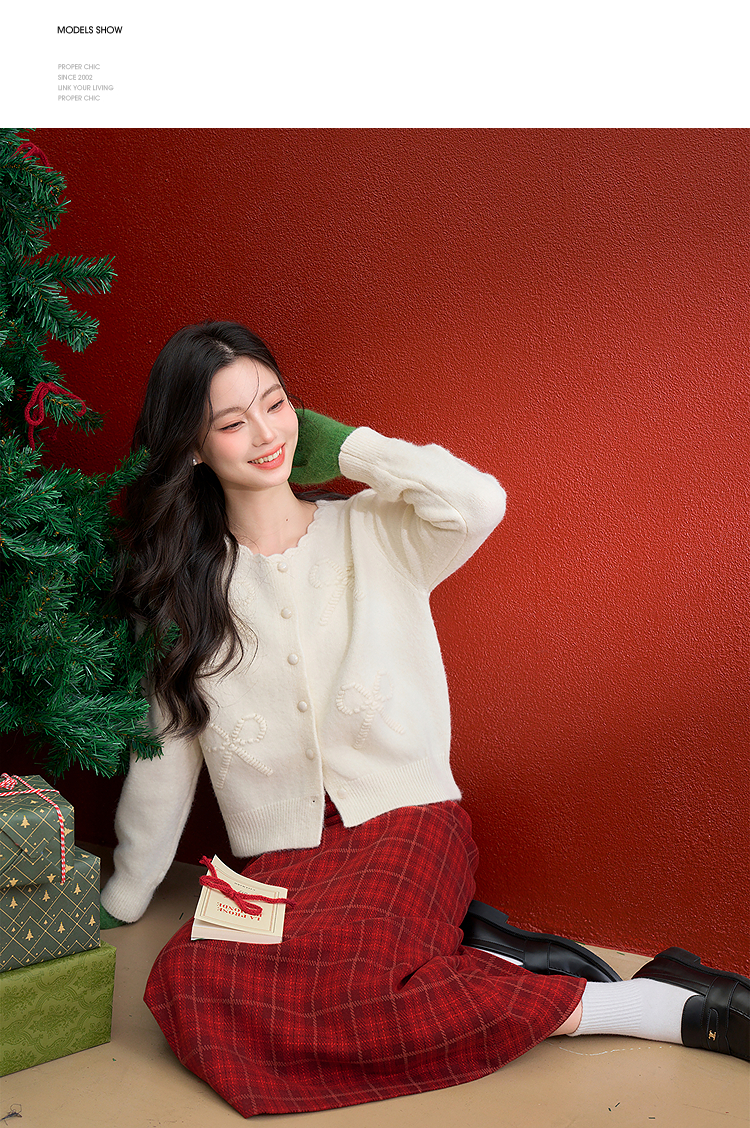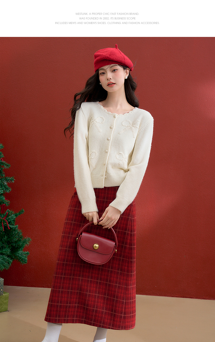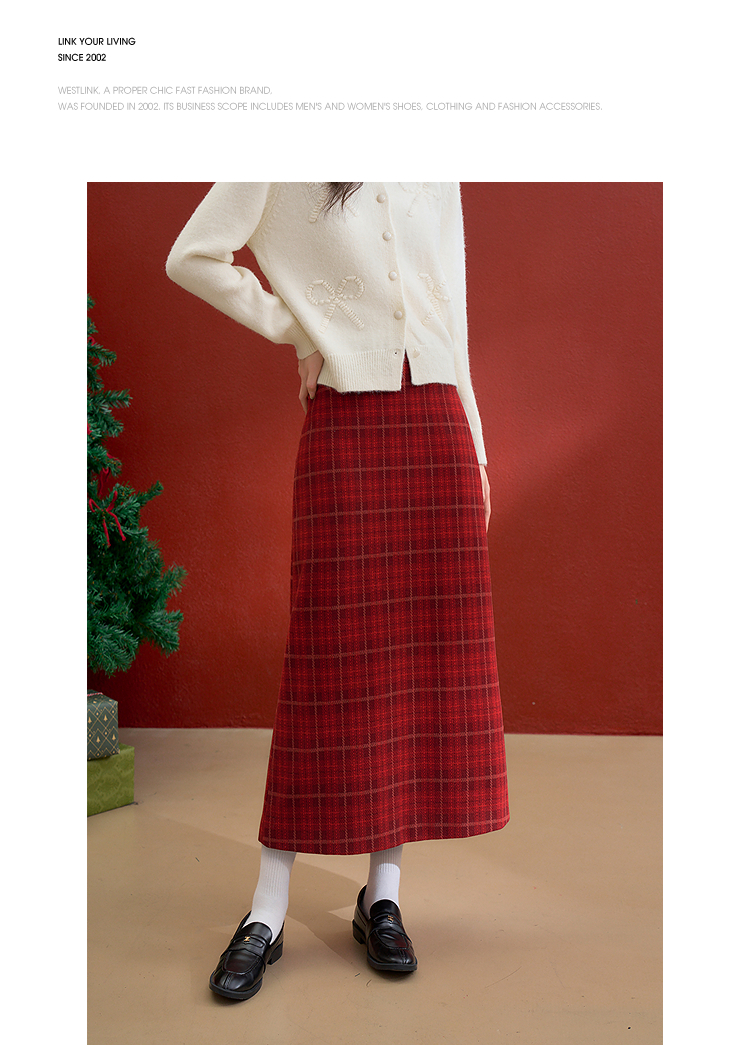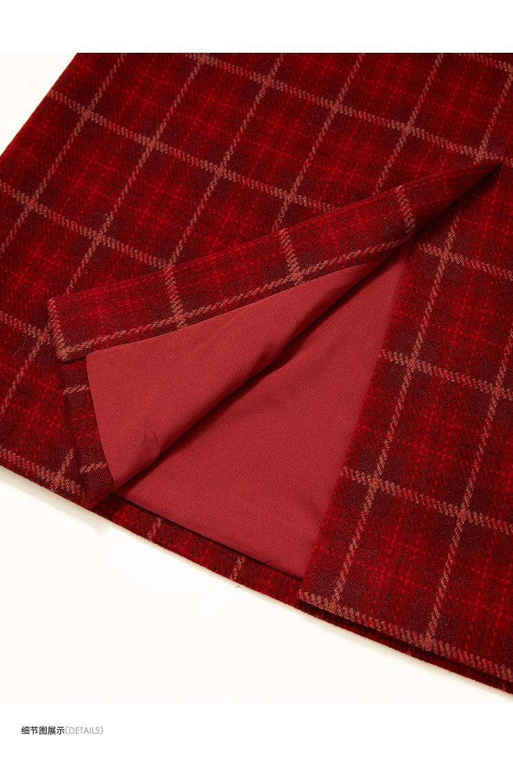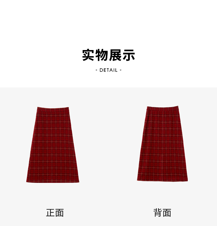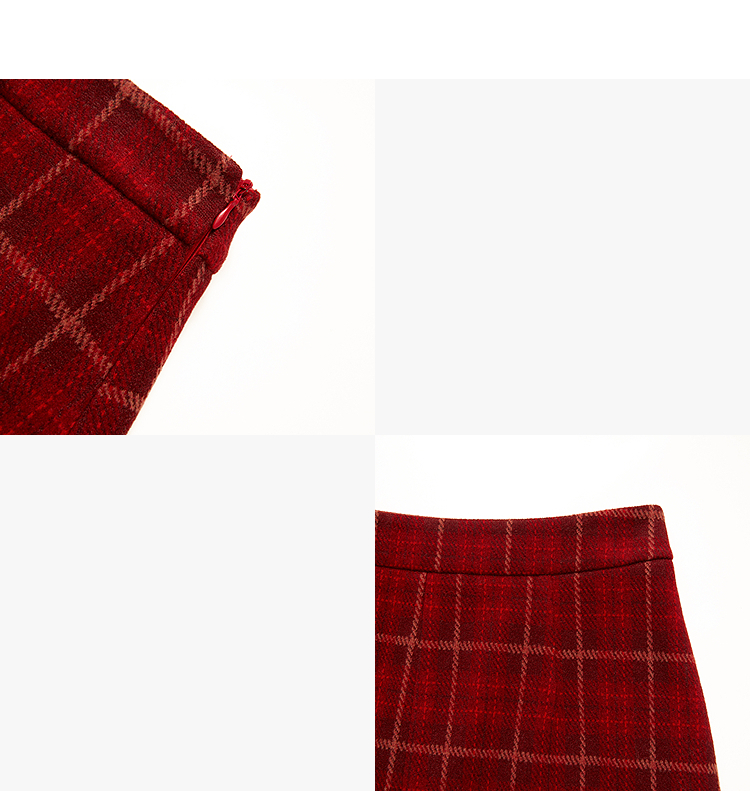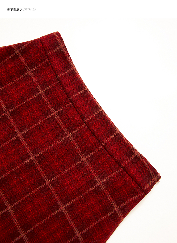 西遇复古红色棋盘格纹毛呢裙女冬季新款高腰显瘦A字半身裙V3755283