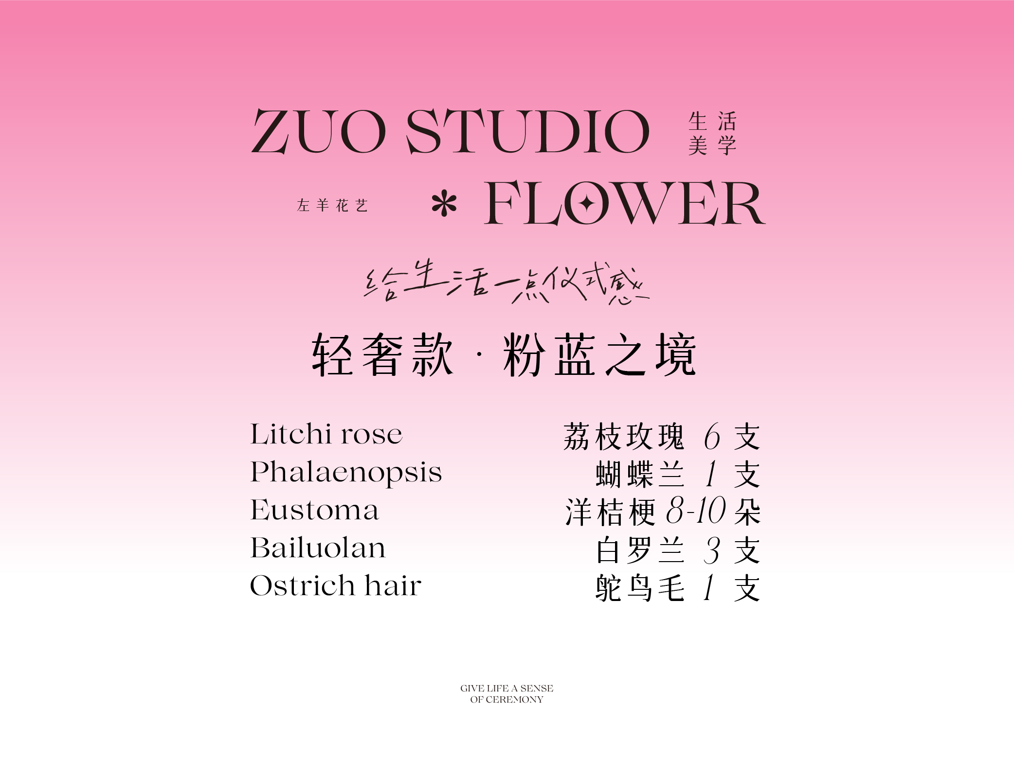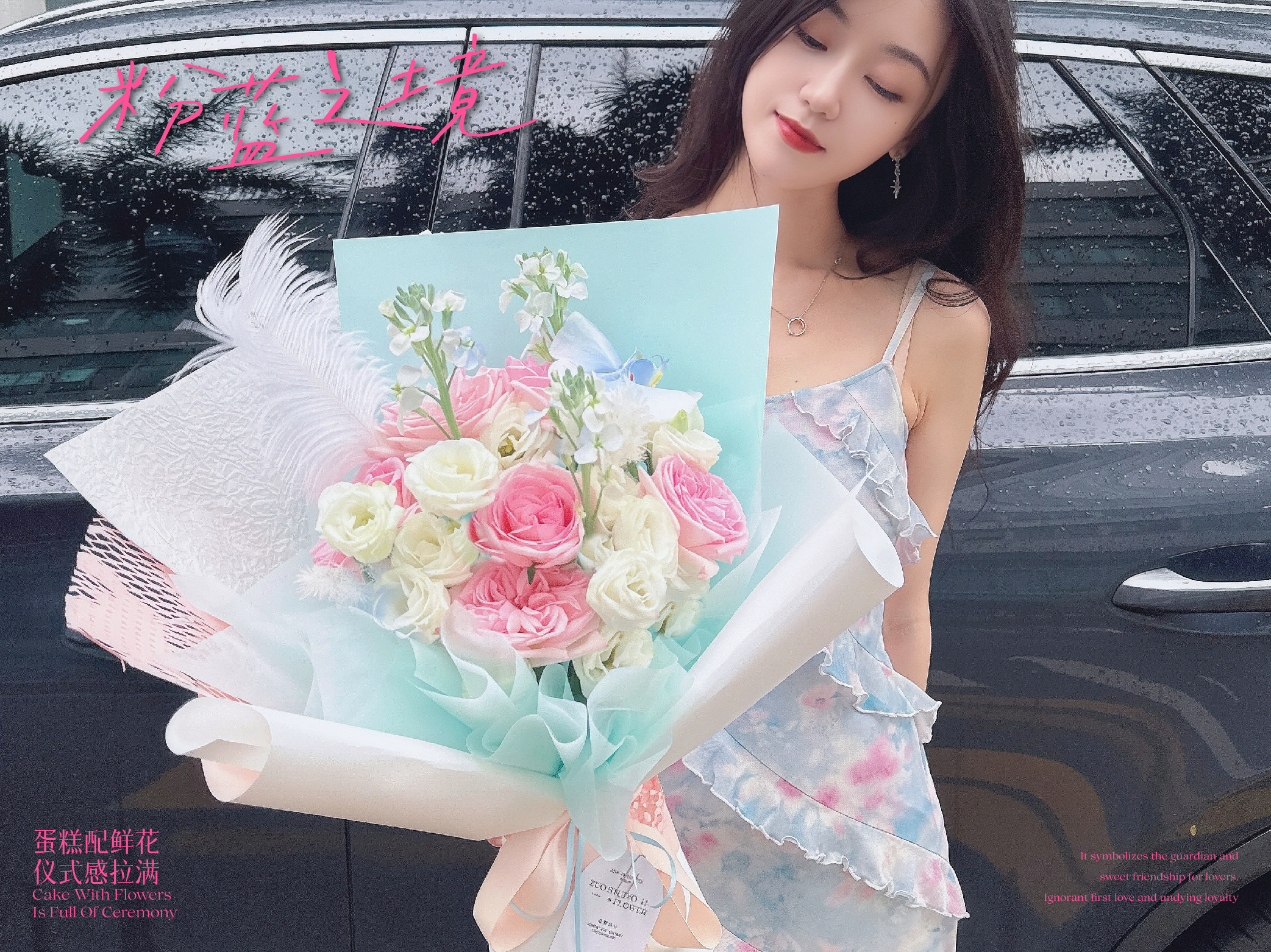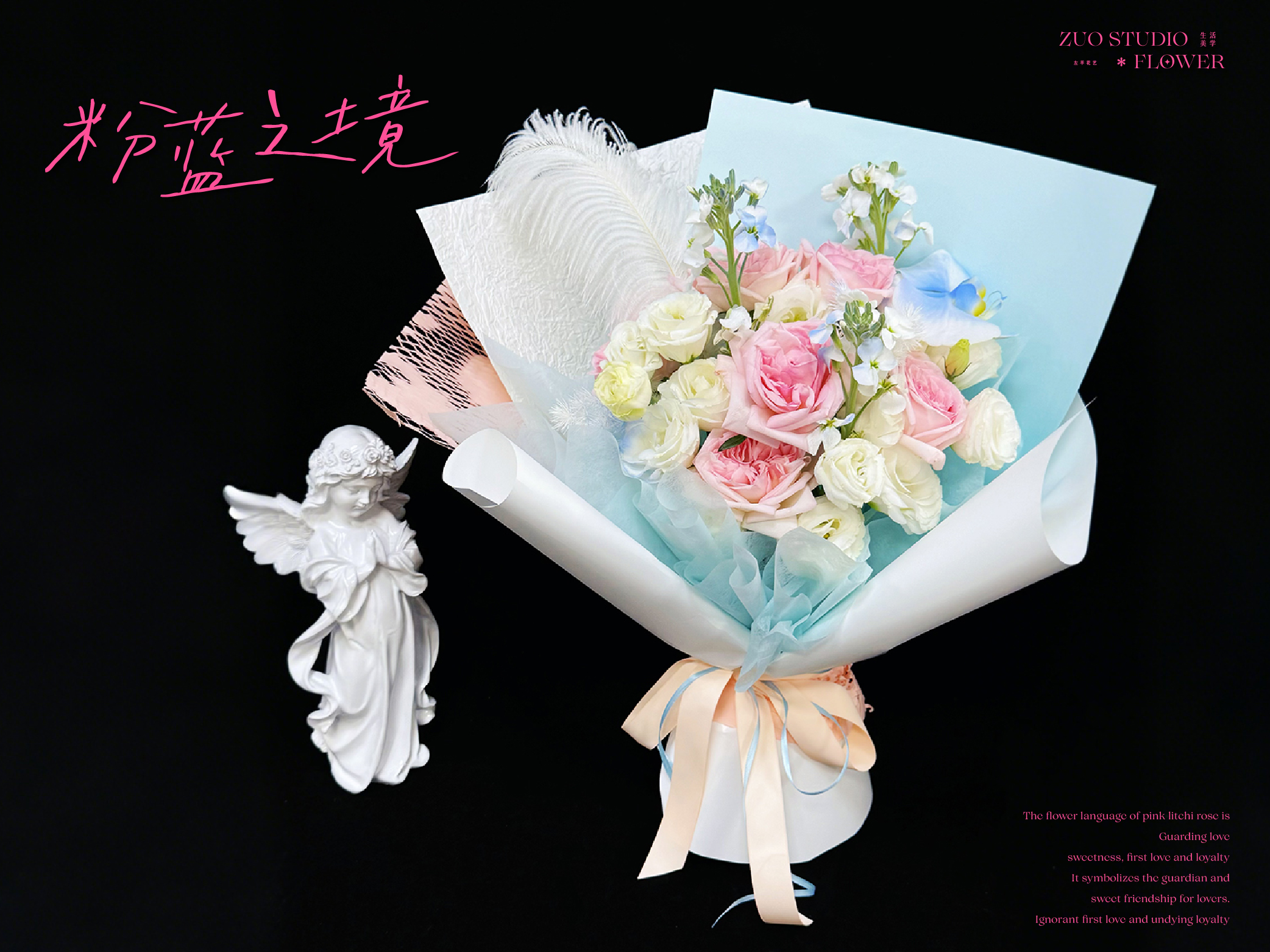 轻奢款【粉蓝之境】荔枝玫瑰6支/蝴蝶兰1支/洋桔梗8-10朵/白罗兰3支/鸵鸟毛1支/氛围感鲜花/仪式感鲜花
