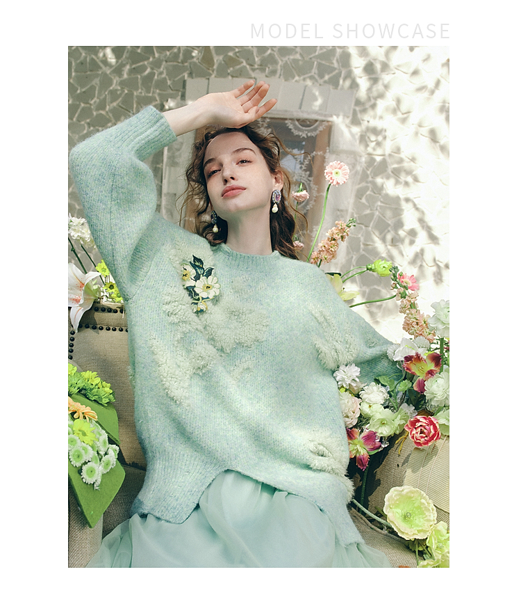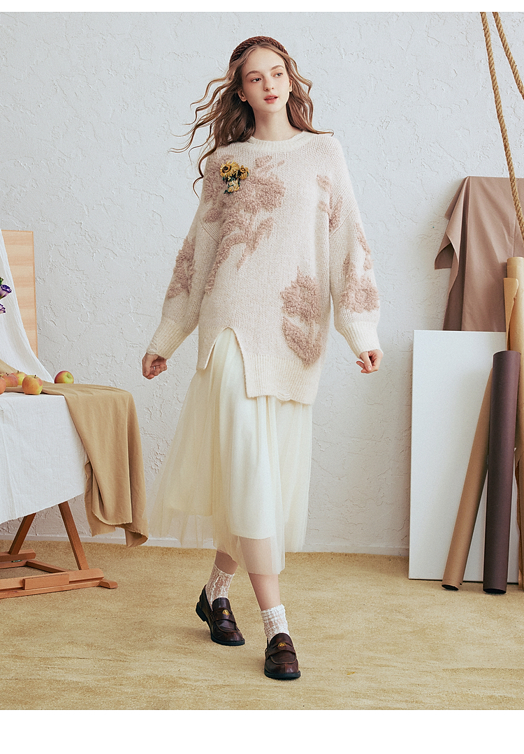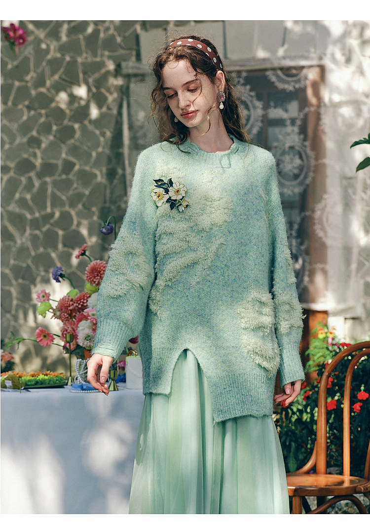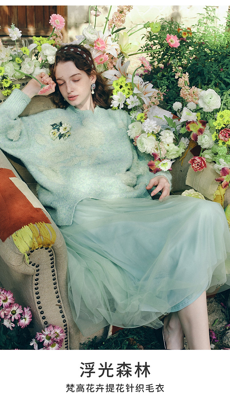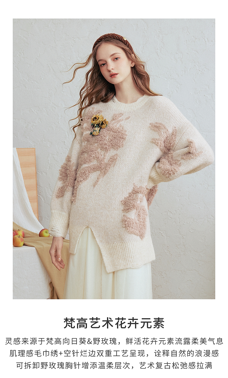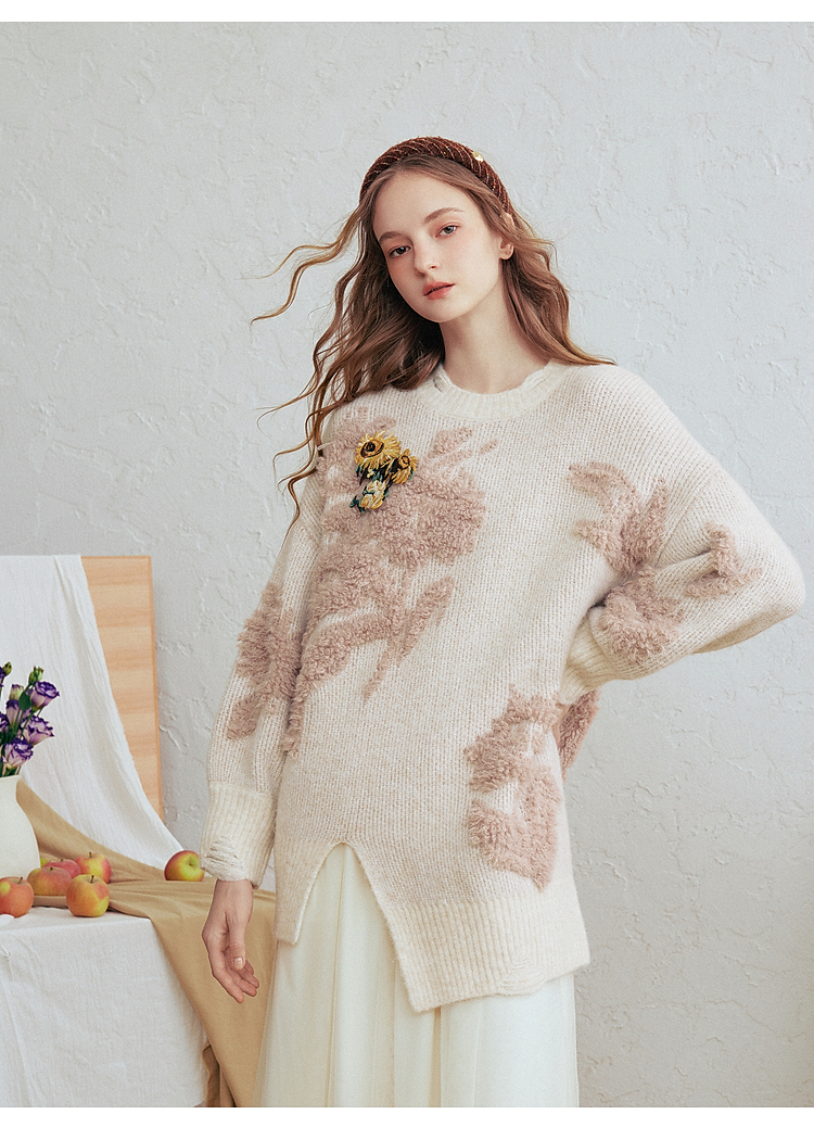 两三事梵高文艺浮光森林2026春季新款甜美花朵章仔绣毛巾绣毛衣女