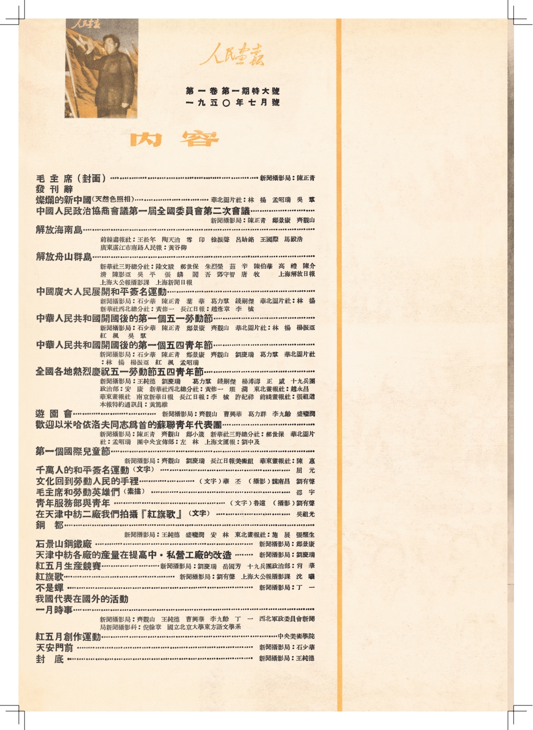 创刊于1950年7月的《人民画报》,由毛泽东主席亲笔题写刊名,用真实生动的图片和文字,向全世界展现五十年代初中国的发展和变化,是新中国政治、经济、文化、生活等诸多方面的的生动见证。此产品为《人民画报》1950年七月号(创刊号)的原版复制产品,值得收藏!