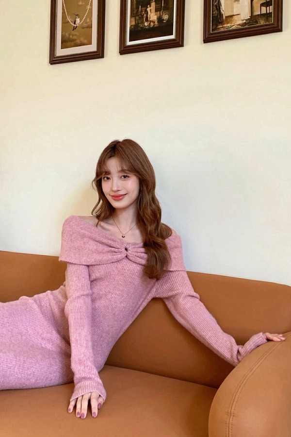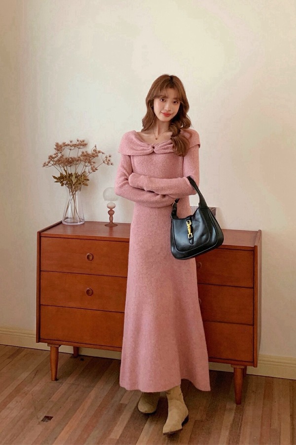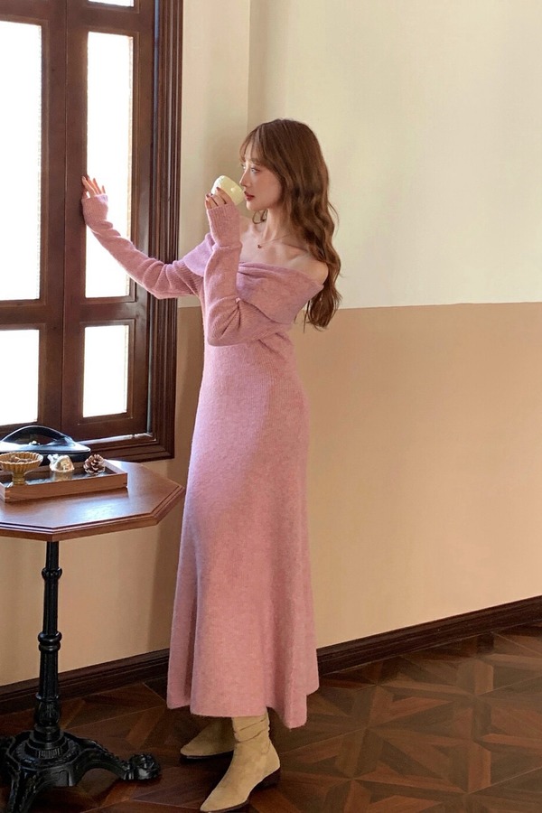 SIA SAYLOR 温柔气质一字肩针织连衣裙 19588